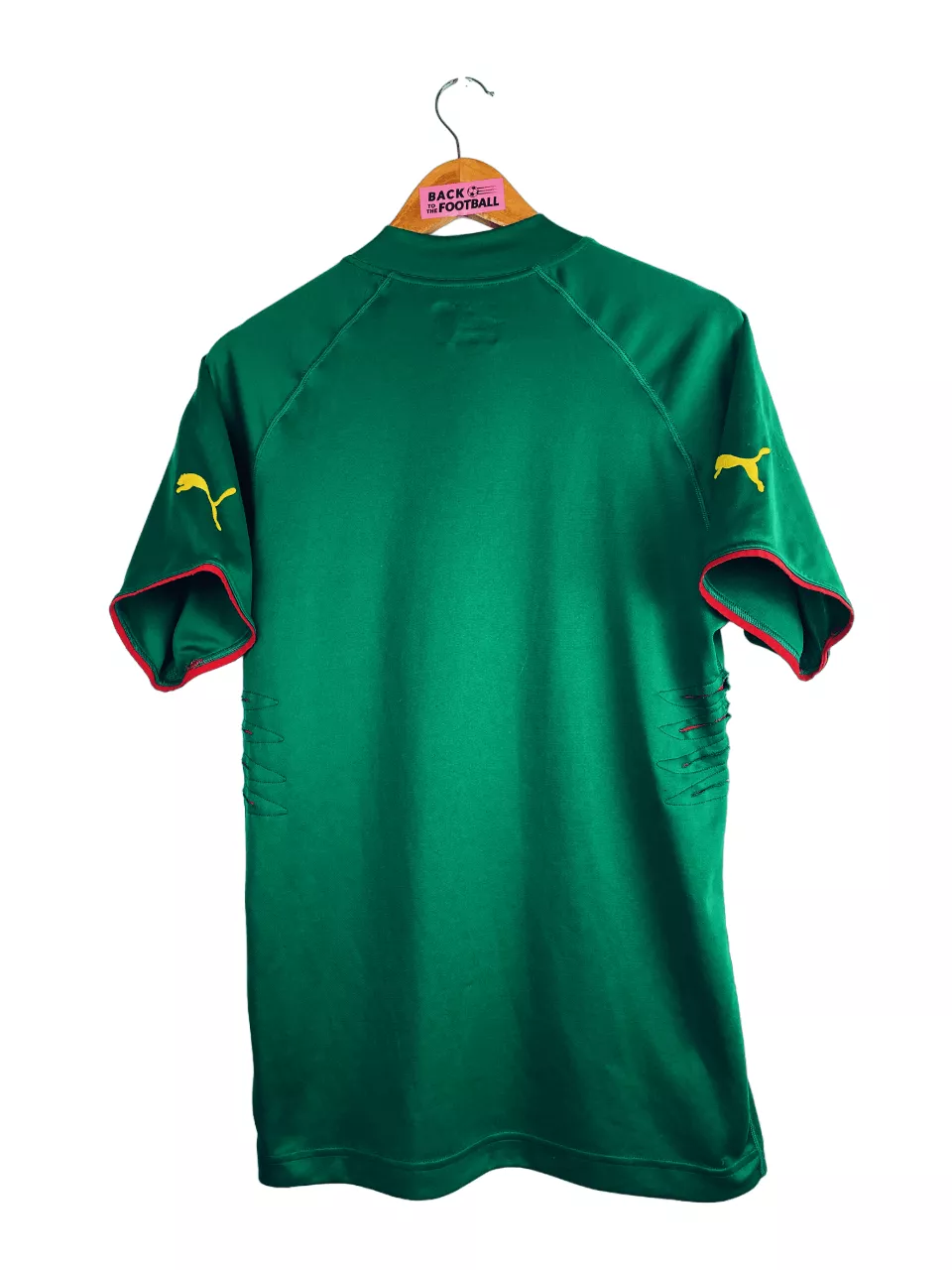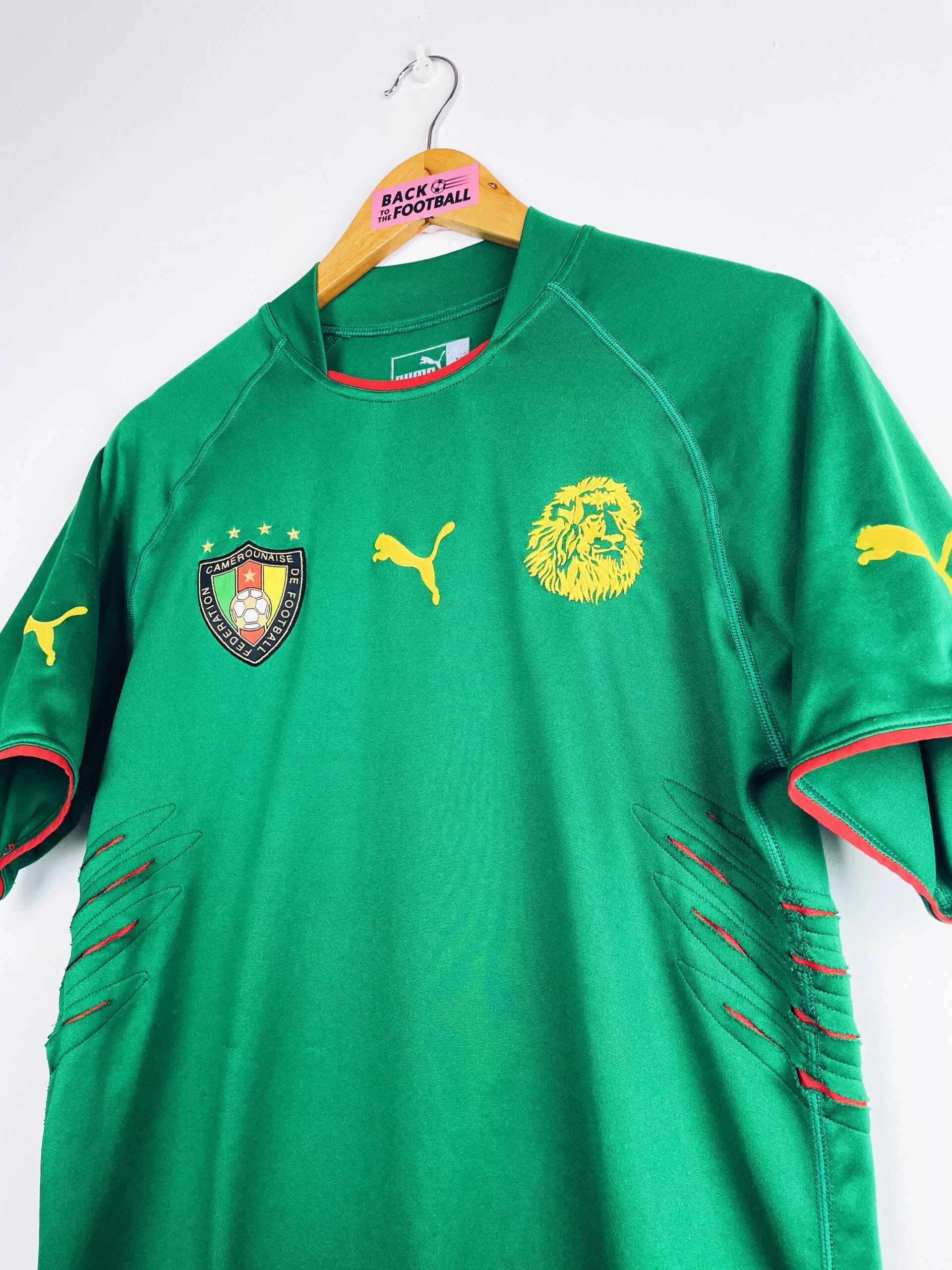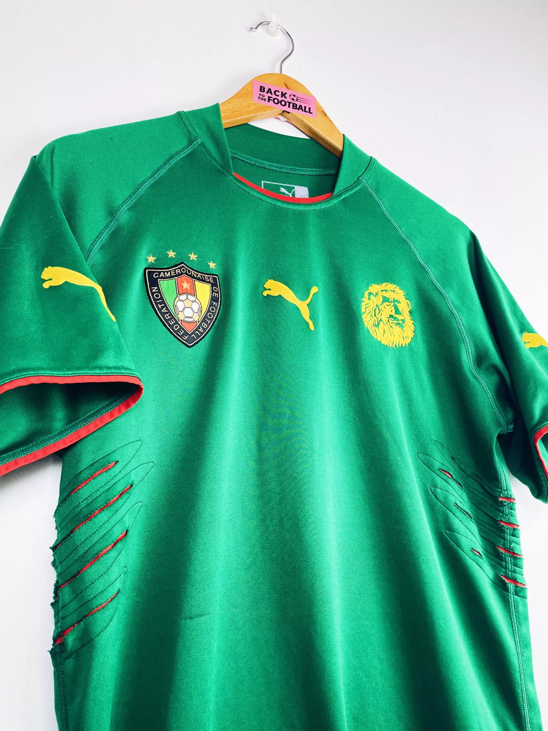 Taille : M Etat : 7.5/10, très bon état mais des bouloches sur la manche et un accro sur le devant (voir photos) Le maillot : maillot vintage domicile du Cameroun pour la CAN 2004. L’écusson et le lion sont brodés. Les logo Puma sont en feutrine. Les griffes sur les côtes sont magnifiques ! Très beau maillot rétro du Cameroun ! Histoire : le Cameroun est très attendu, ayant gagné les 2 dernières CAN 2000 et 2002. Les Camerounais sortent premiers de leur groupe, devant l’Algérie, l’Egypte et le Zimbabwe avec 6 buts marqués en 3 matchs. Mais ils…