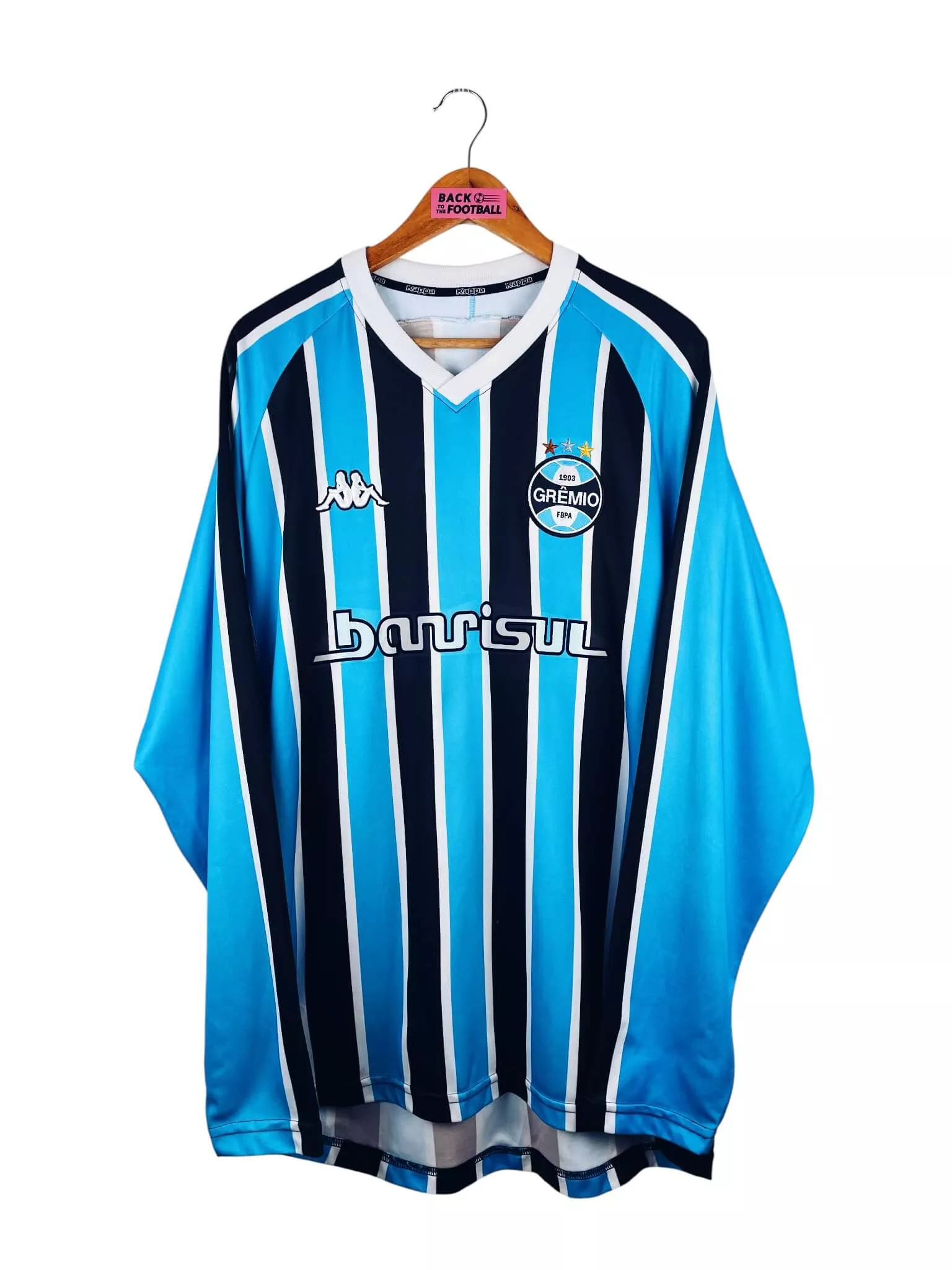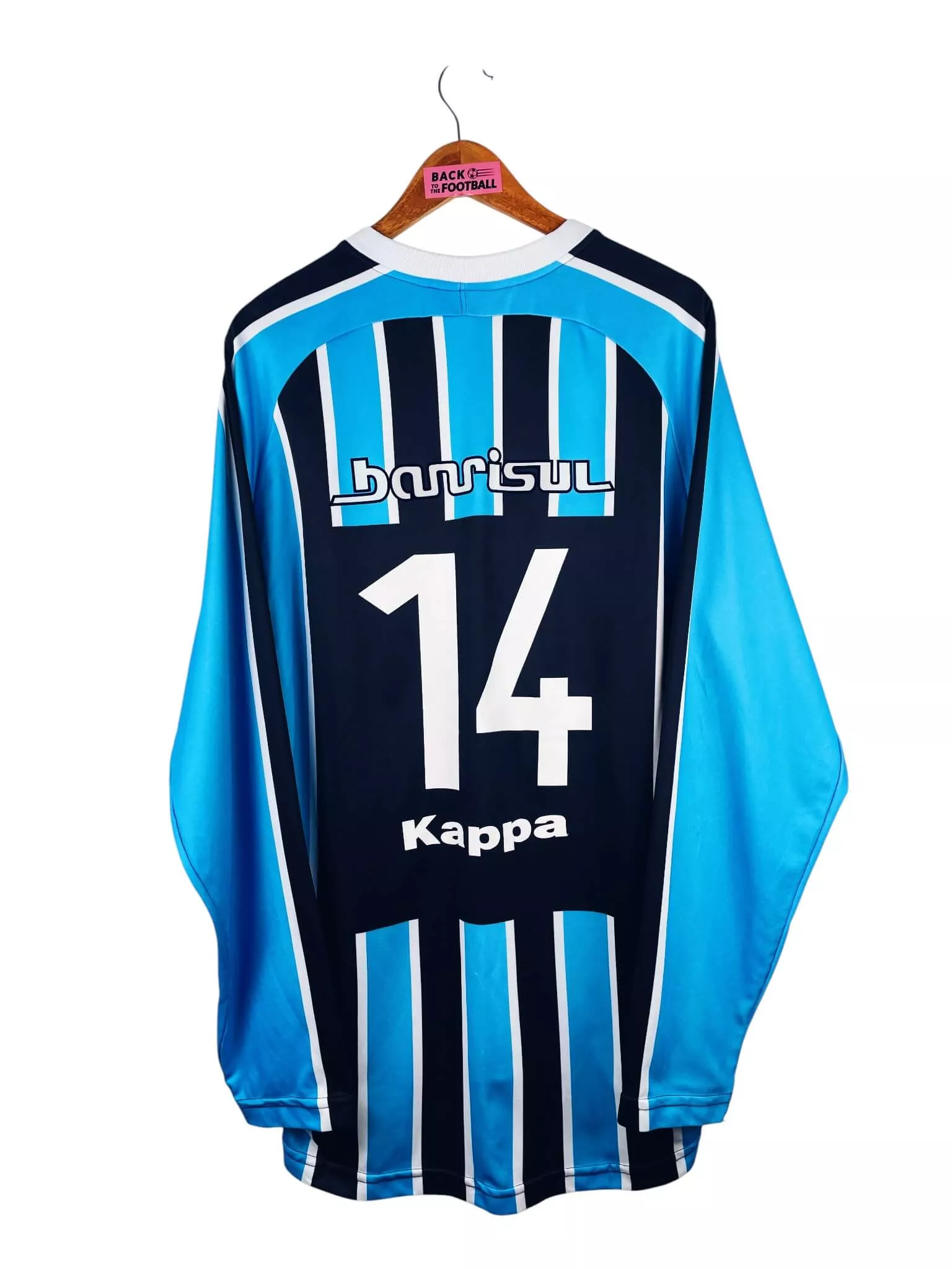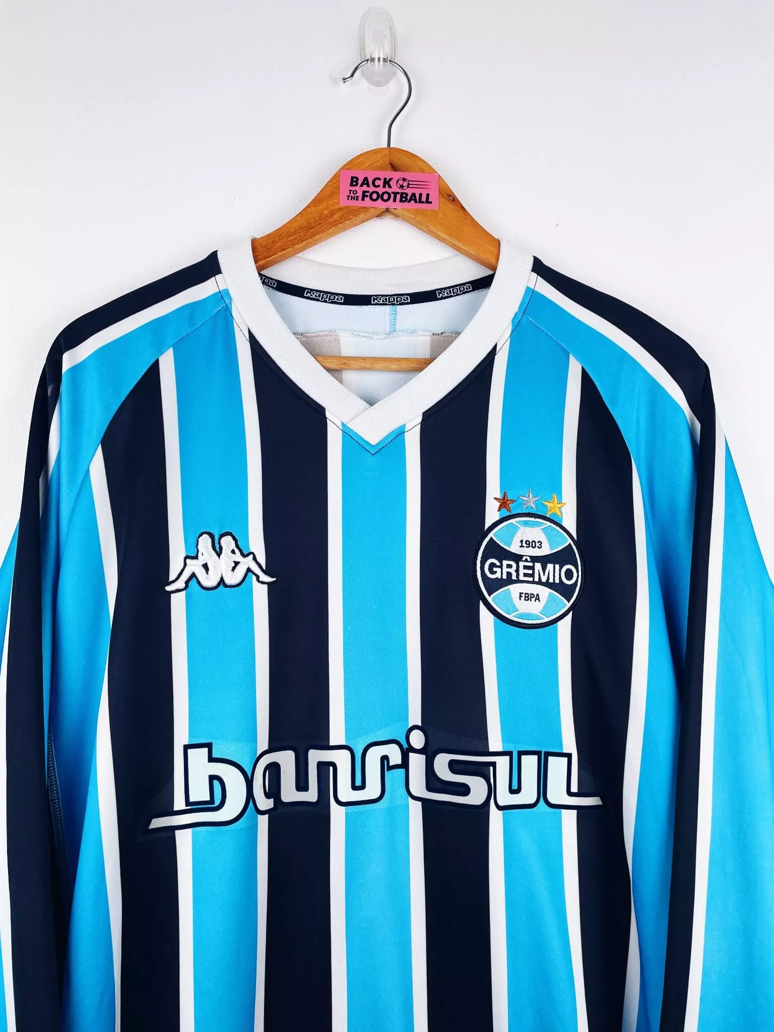 Taille : XL Largeur : 56cm (aisselle à aisselle) Longueur : 77cm (base du col au bas) Si tu veux plus de détails, tu peux nous contacter par mail ou sur les réseaux 😉 Etat : 8/10, très bon état hormis une trace au niveau d’une épaule et on peut voir les contours du sponsor (voir photo) Le maillot : maillot vintage domicile de Grêmio 2004 manches longues. L’écusson et le logo Kappa sont brodés, le sponsor Banrisul est en feutrine, le numéro 14 est floqué. Jolie maillot rétro de Grêmio ! Histoire : très mauvaise saison de Grêmio qui…