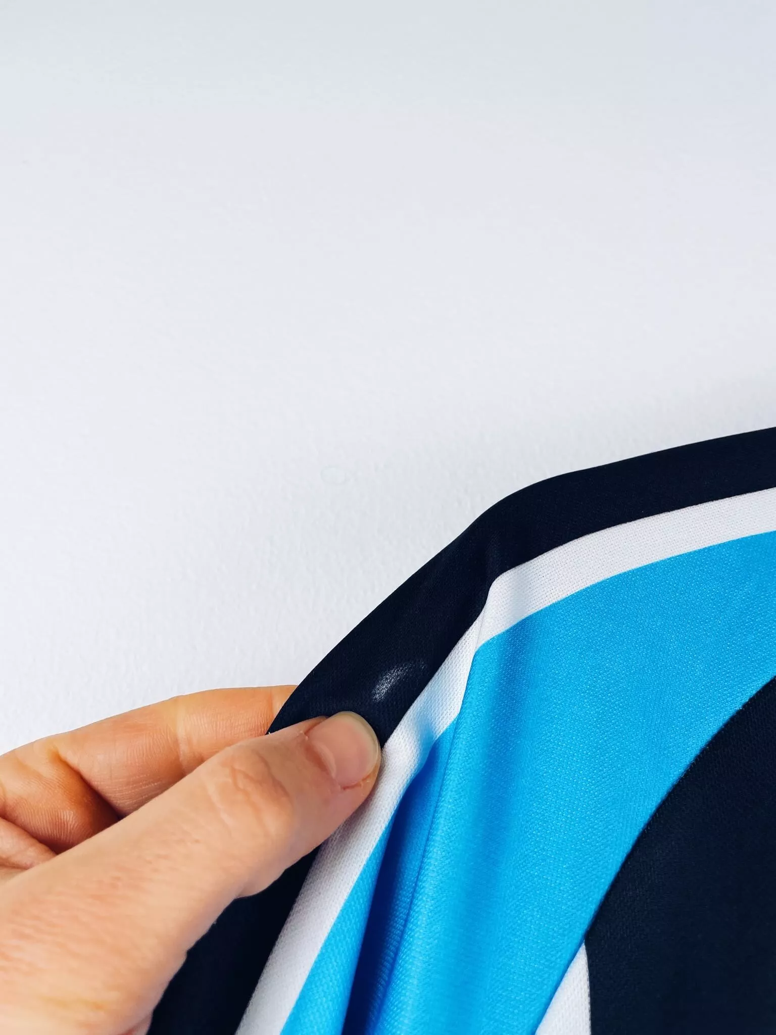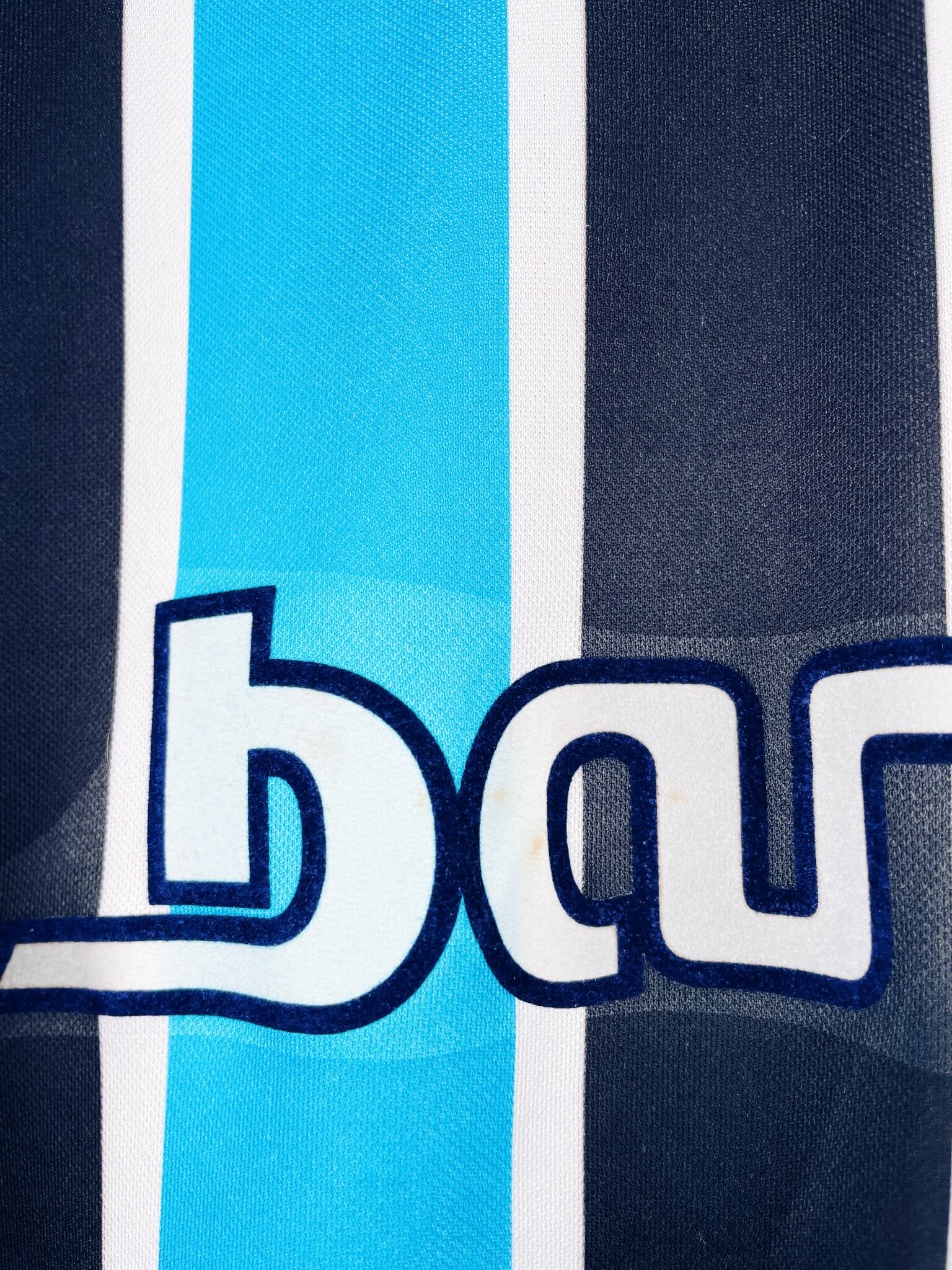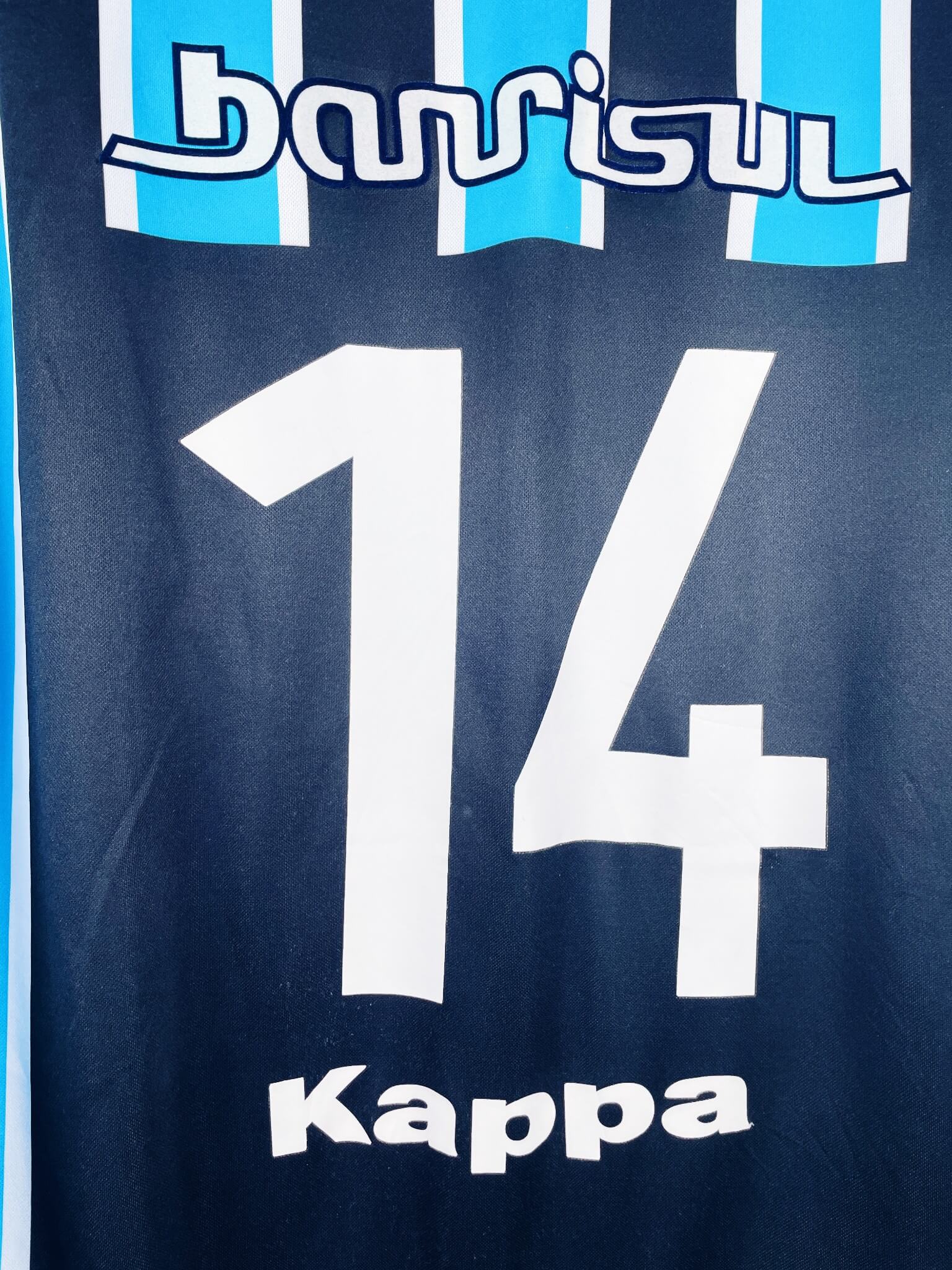 Taille : XL Largeur : 56cm (aisselle à aisselle) Longueur : 77cm (base du col au bas) Si tu veux plus de détails, tu peux nous contacter par mail ou sur les réseaux 😉 Etat : 8/10, très bon état hormis une trace au niveau d’une épaule et on peut voir les contours du sponsor (voir photo) Le maillot : maillot vintage domicile de Grêmio 2004 manches longues. L’écusson et le logo Kappa sont brodés, le sponsor Banrisul est en feutrine, le numéro 14 est floqué. Jolie maillot rétro de Grêmio ! Histoire : très mauvaise saison de Grêmio qui…