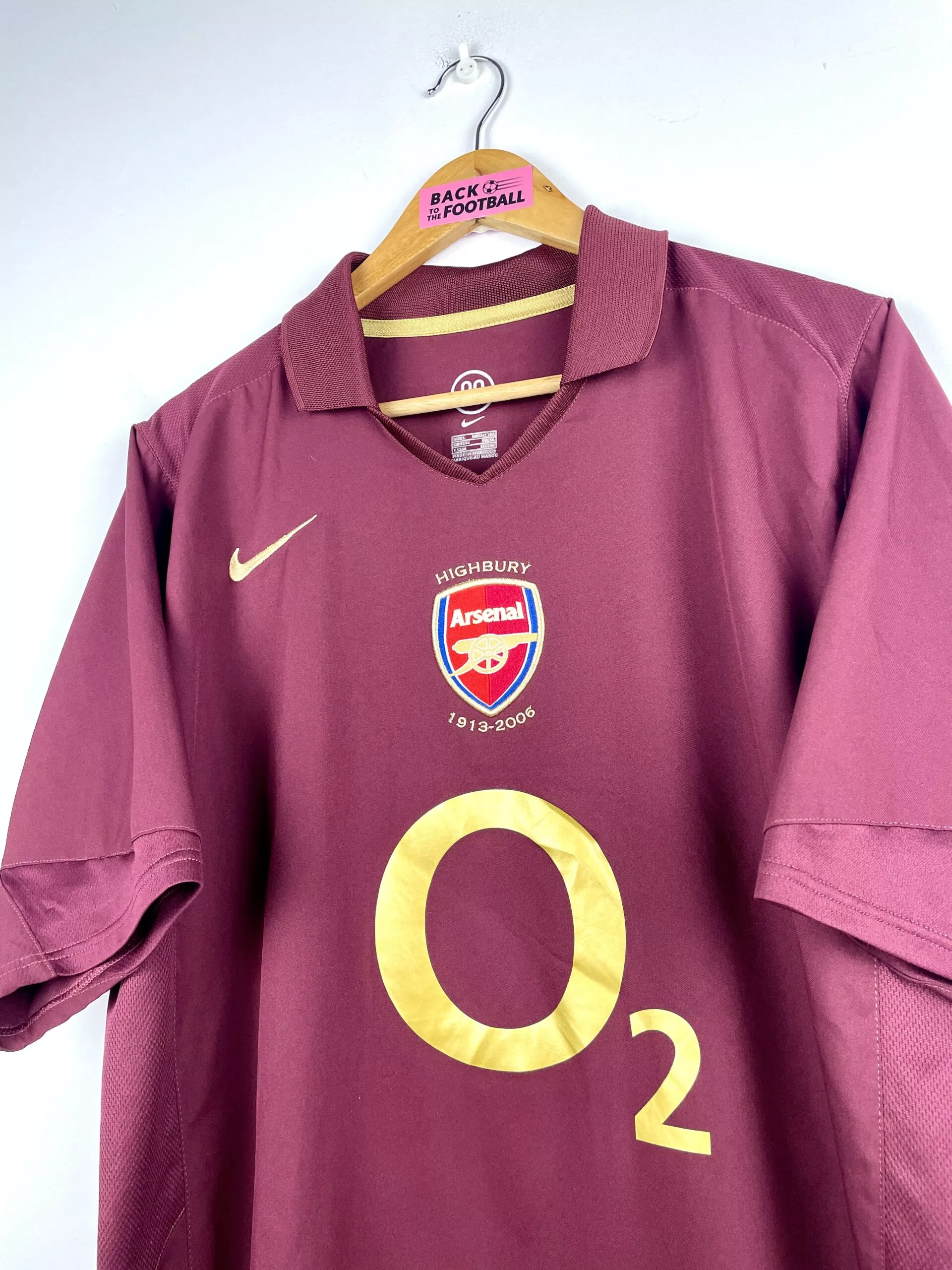 Taille : L Si tu veux plus de détails, tu peux nous contacter par mail ou sur les réseaux 😉 Etat : 8/10, très bon état hormis des traces légères sur les manches (voir photos, ça se voit beaucoup moins en vrai) Le maillot : maillot vintage domicile d’Arsenal 2005/2006 floqué Henry #14. L’écusson spécial pour la dernière saison à Highbury est brodé, le logo Nike aussi. Le sponsor mythique O2 est floqué. Henry au dos est en feutrine. Très beau maillot rétro d’Arsenal ! Histoire : dernière saison jouée à Highbury pour les Gunners d’Arsène Wenger. Une 4ème place…