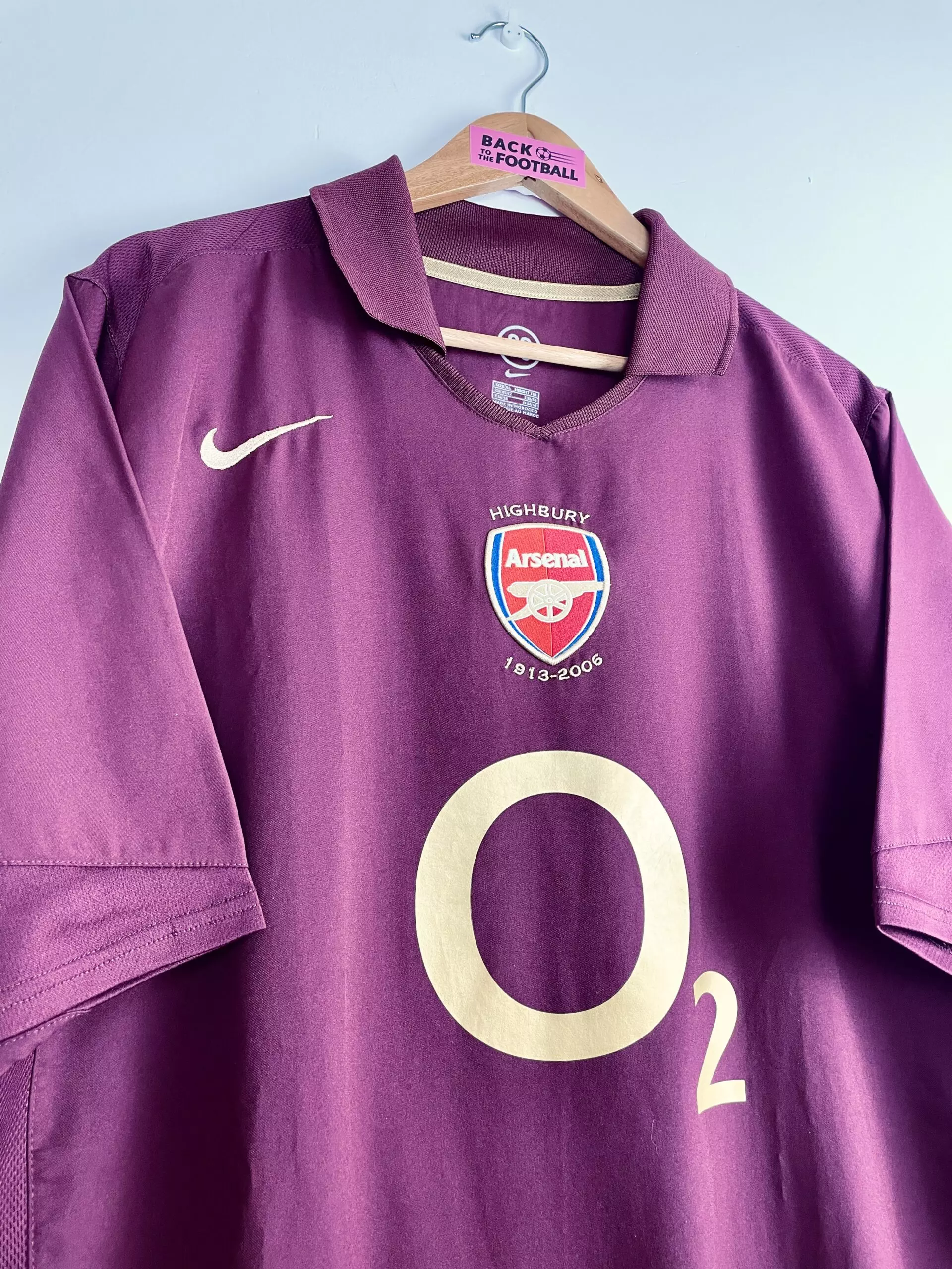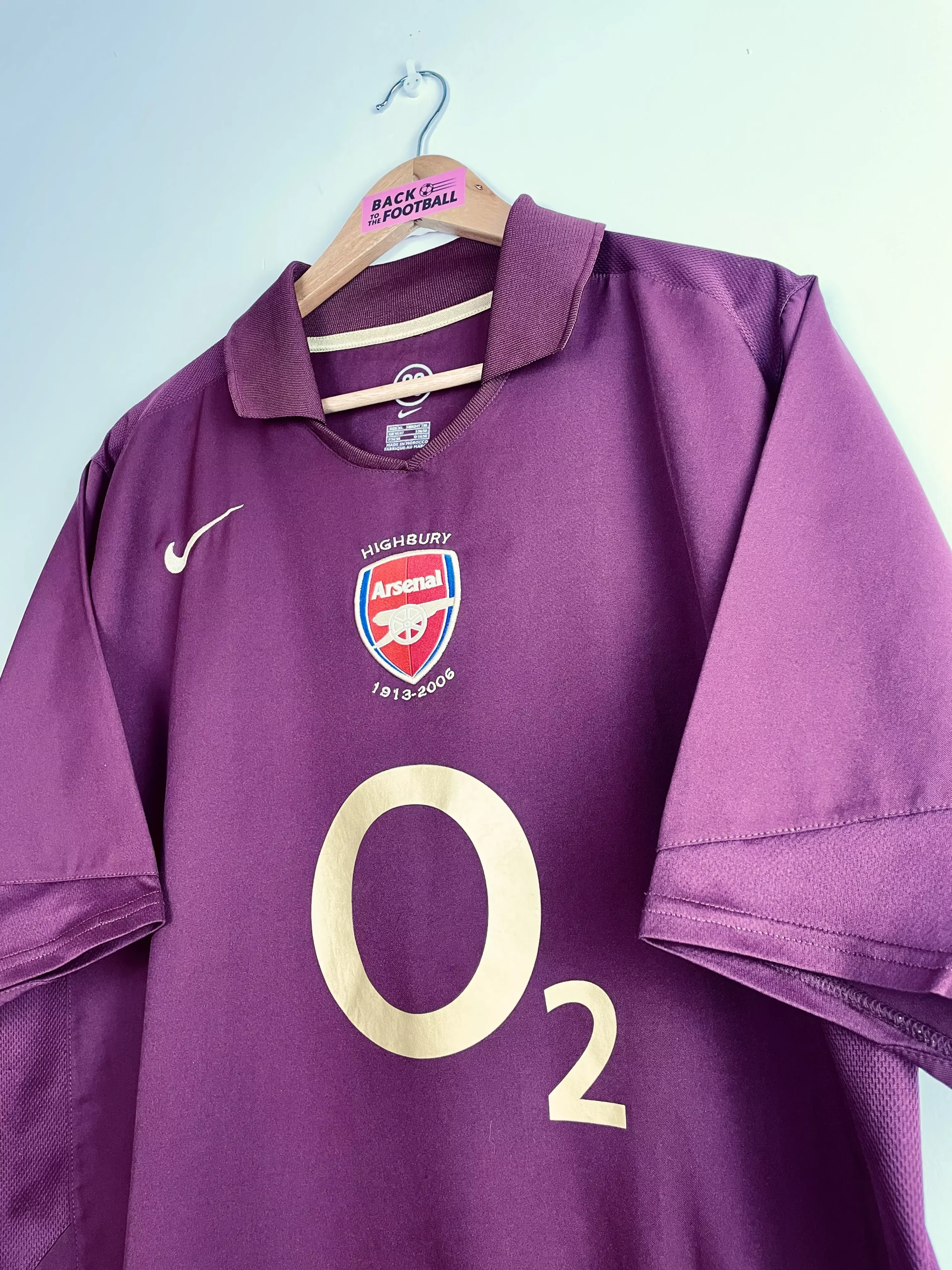 Taille : XL Etat : 8/10, très bon état, le flocage est très légèrement abimé Le maillot : maillot vintage domicile d’Arsenal 2005/2006 floqué Henry #14. L’écusson spécial pour la dernière saison à Highbury est brodé, le logo Nike aussi. Le sponsor mythique O2 est floqué. Henry au dos est floqué. Très beau maillot rétro d’Arsenal ! Histoire : dernière saison jouée à Highbury pour les Gunners d’Arsène Wenger. Une 4ème place en Premier League, derrière Chelsea, Manchester United et Liverpool. Arsenal fera une très belle campagne en Ligue des Champions. Après une 1ère place en phase de groupe, devant…