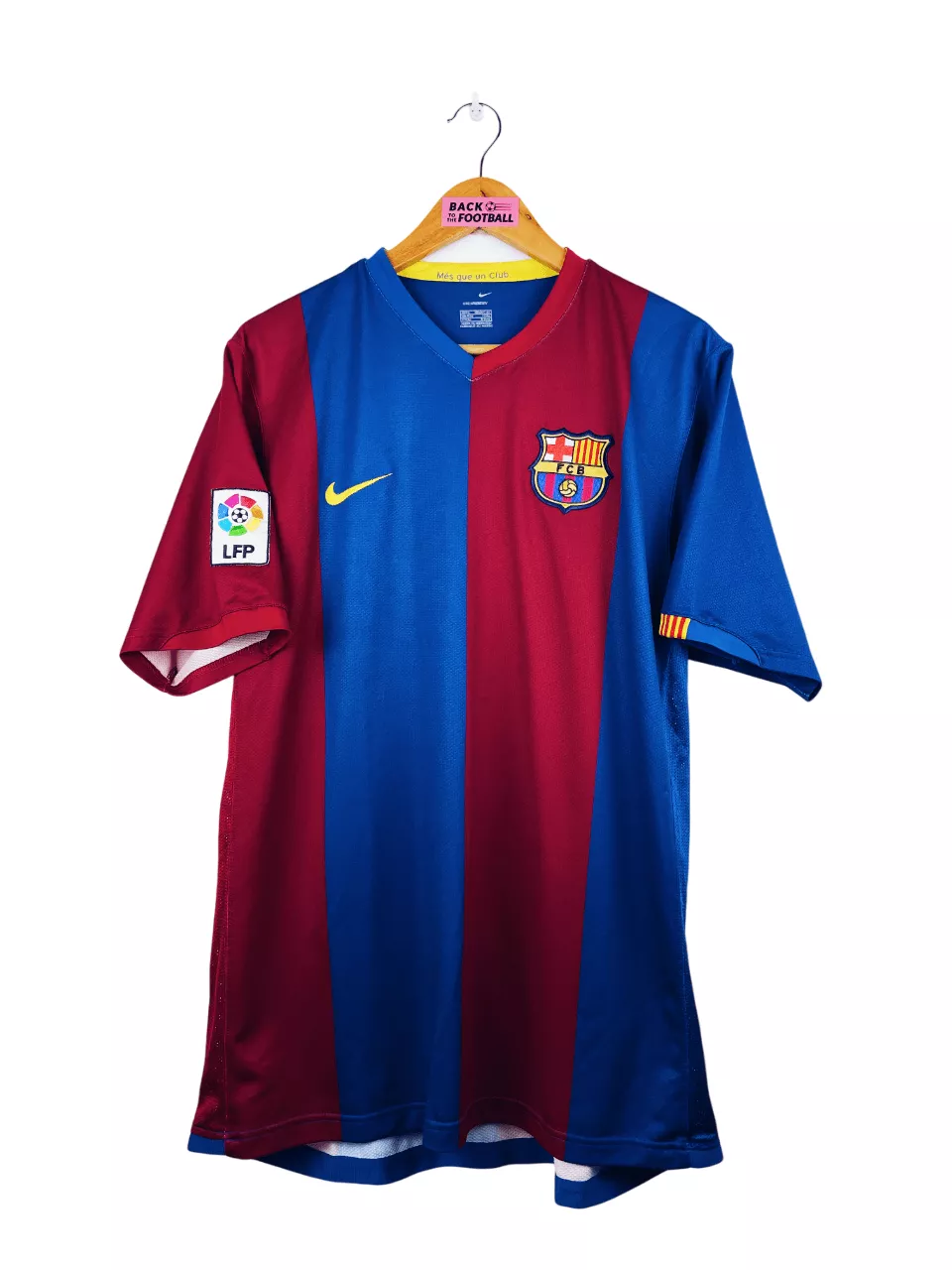 Taille : L Si tu veux plus de détails, tu peux nous contacter par mail ou sur les réseaux 😉 Etat : 8/10, très bon état, minis accrocs sur un côté (voir photo) Le maillot : maillot vintage domicile du FC Barcelone 2006/2007 floqué Messi #19. L’écusson et le logo Nike sont brodés. Le patch LFP sur la manche est brodé. Messi #19 au dos est floqué. Le flocage semble avoir été posé récemment. Pas de sponsor sur cette version. Très beau maillot rétro de Barcelone ! Histoire : saison frustrante pour le Barca avec une seconde place en Liga…
