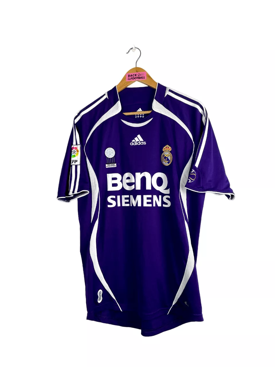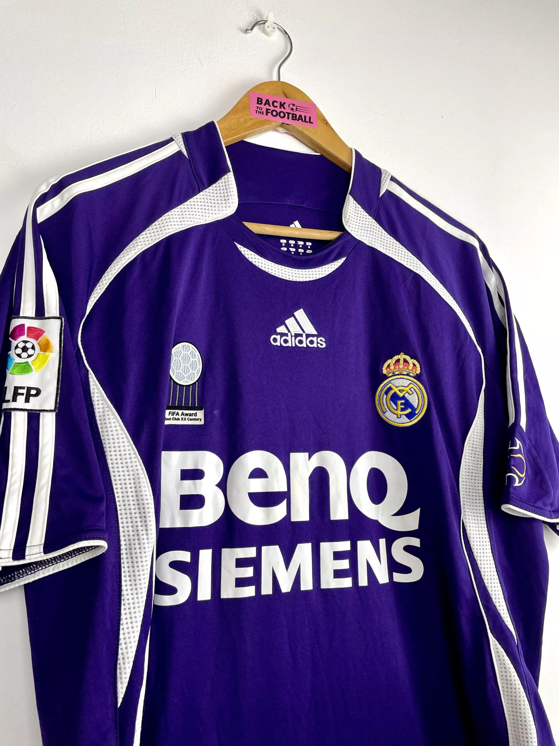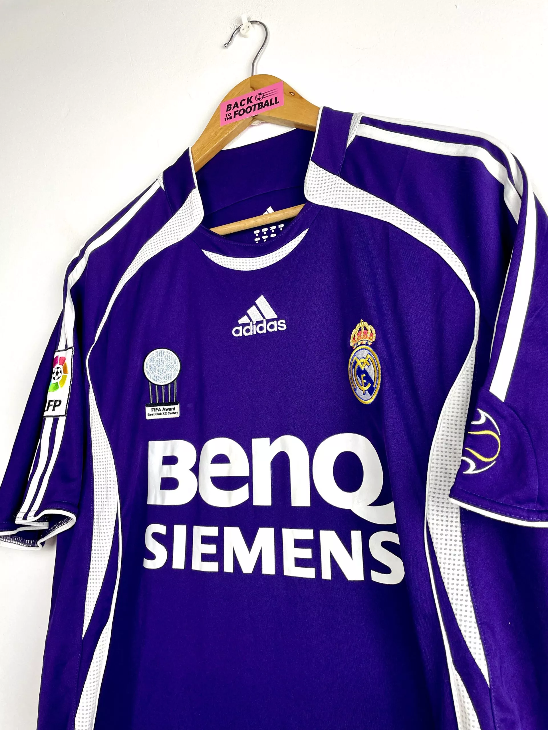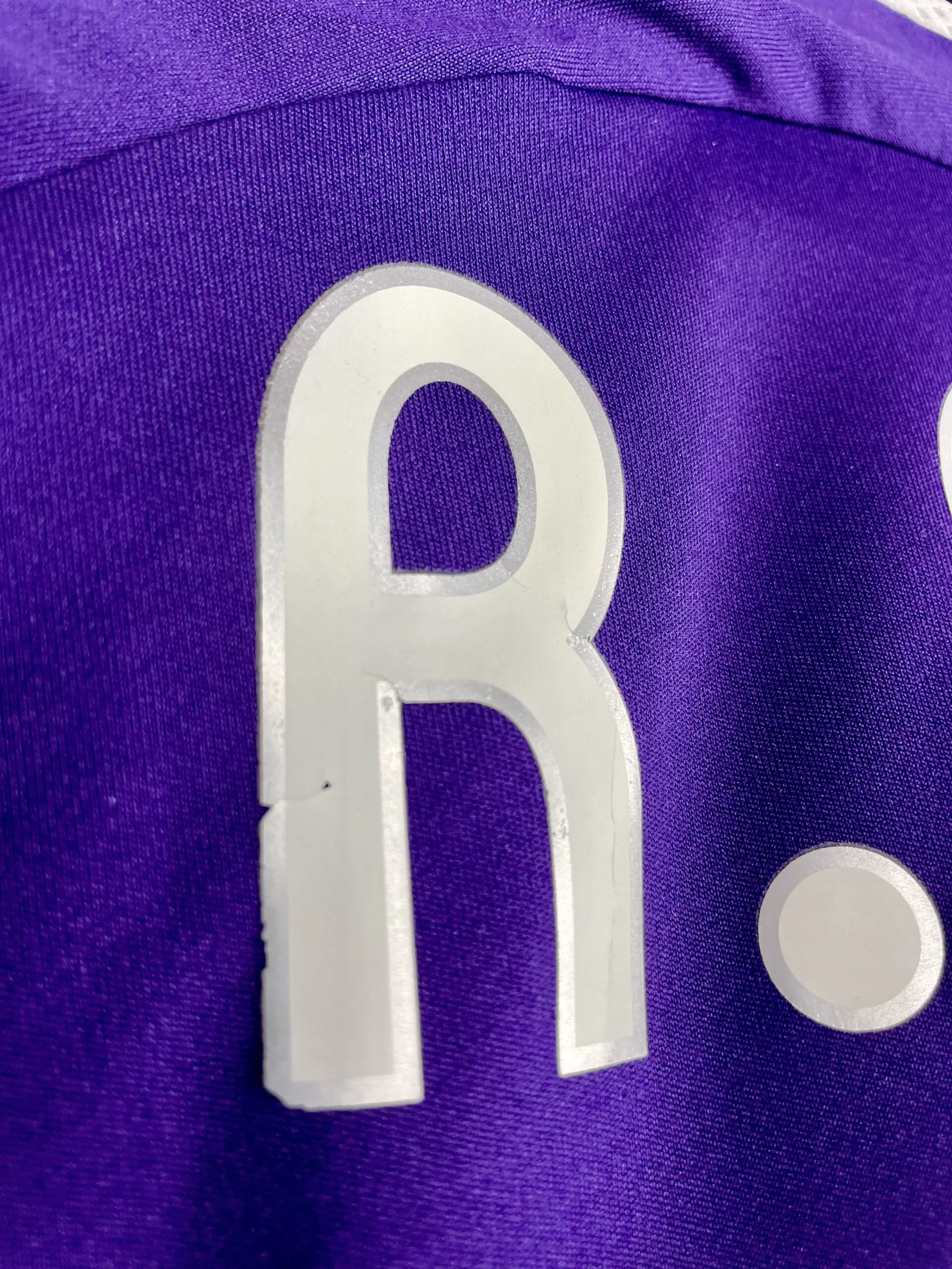 Taille : L Si tu veux plus de détails, tu peux nous contacter par mail ou sur les réseaux 😉 Etat : 8/10, très bon état, léger défaut sur le « R » et le « S » du flocage au dos (voir photos) Le maillot : maillot vintage third du Real Madrid 2006/2007 floqué R. Carlos #3. L’écusson et le logo Adidas sont brodés, le logo « best club XX century » est en feutrine, le sponsor est floqué, le patch LFP est brodé et R. Carlos au dos est floqué. Très beau maillot rétro du Real Madrid ! Histoire : belle saison du Real…