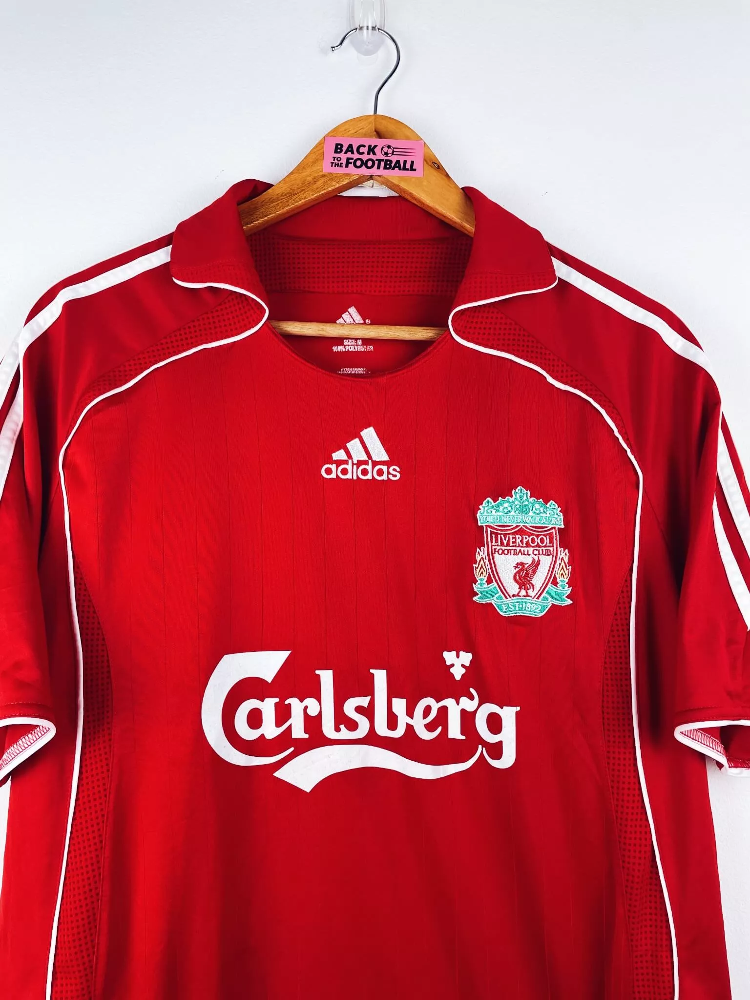La taille : M Largeur : 55cm (aisselle à aisselle) Longueur : 73cm (base du col au bas) Si tu veux plus de détails, tu peux nous contacter par mail ou sur les réseaux 😉 Etat : 8/10, très bon état, le sponsor est un peu abimé (voir photo) Le maillot : maillot vintage domicile de Liverpool 2006/2008. L’écusson et le logo Adidas sont brodés, le sponsor Carlsberg est floqué. Très beau maillot rétro de Liverpool ! Histoire : première grosse saison des reds sous les ordres de Rafa Benitez avec une troisième place sur le podium et surtout une…