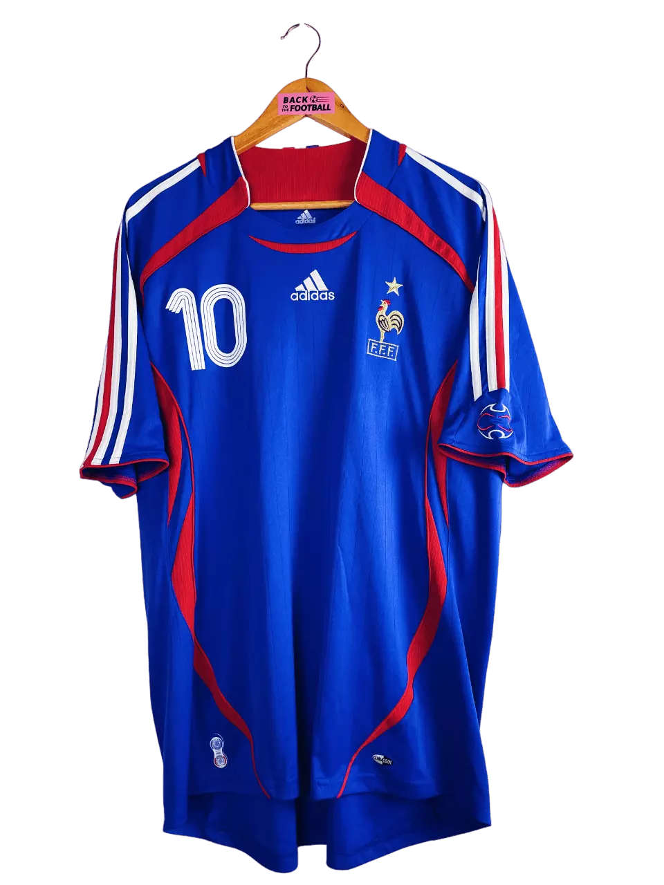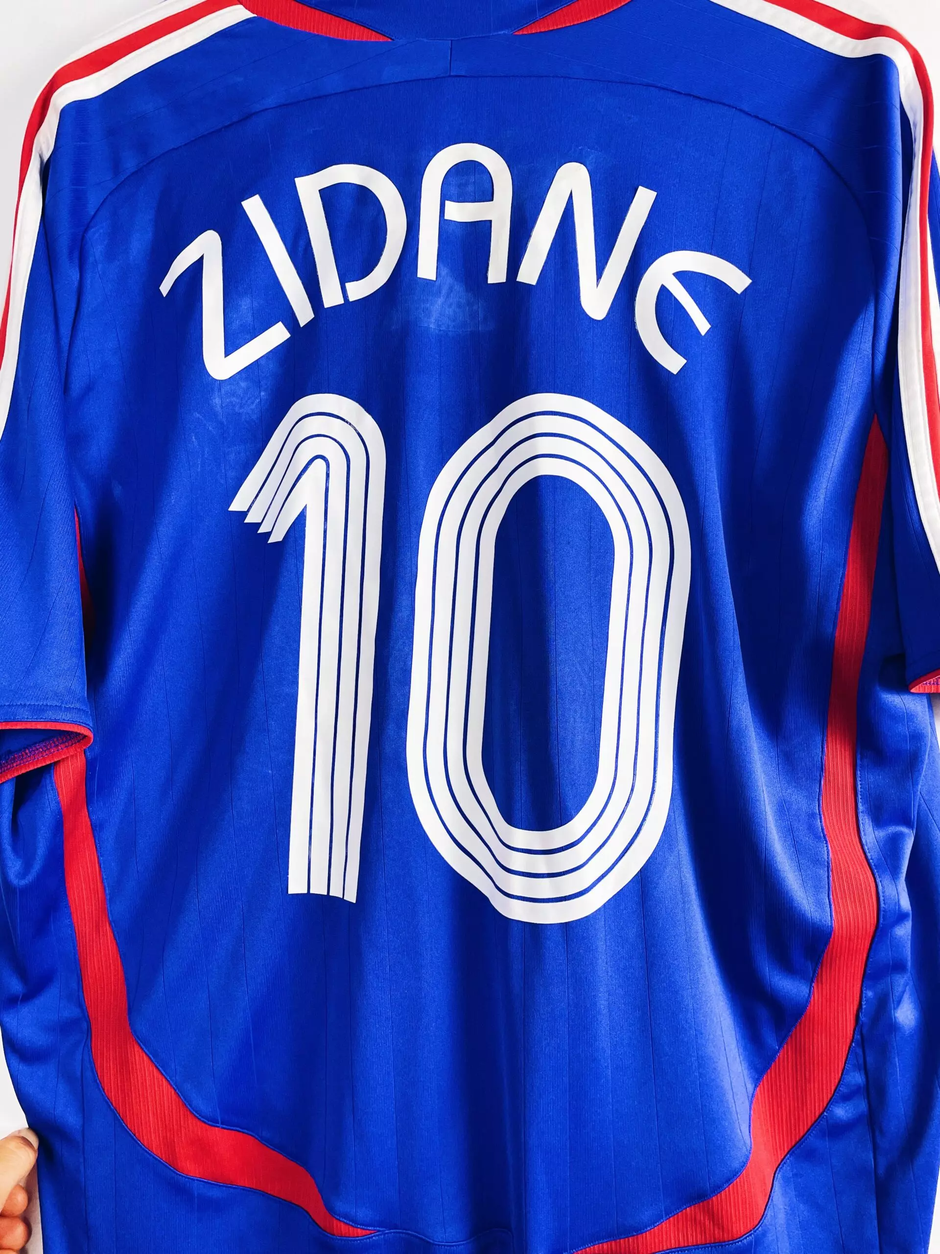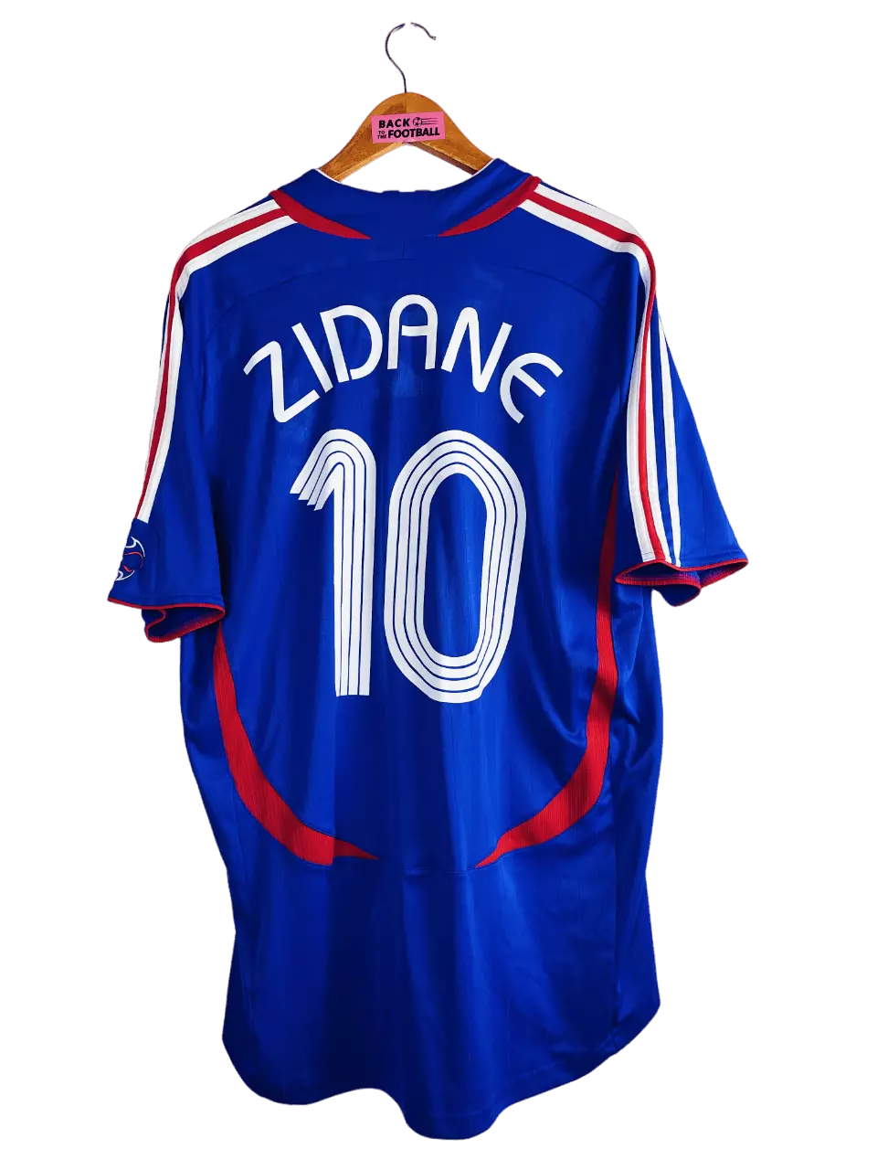 Taille : XL Etat : 7/10, très bon état hormis au niveau du flocage dans le dos où le logo Adidas a déteint (voir photo). D’où le prix. Le maillot : maillot vintage domicile de l’équipe de France pour la Coupe du Monde 2006, floqué Zidane #10. L’écusson avec l’étoile est brodé, comme le logo Adidas. Très beau maillot rétro de la France ! Histoire : après avoir difficilement passé les poules, avec une deuxième place derrière la Suisse, les Bleus lancent vraiment leur compétition en huitièmes de finale face à l’Espagne, qui voulait envoyer à la retraite Zizou. C’est…