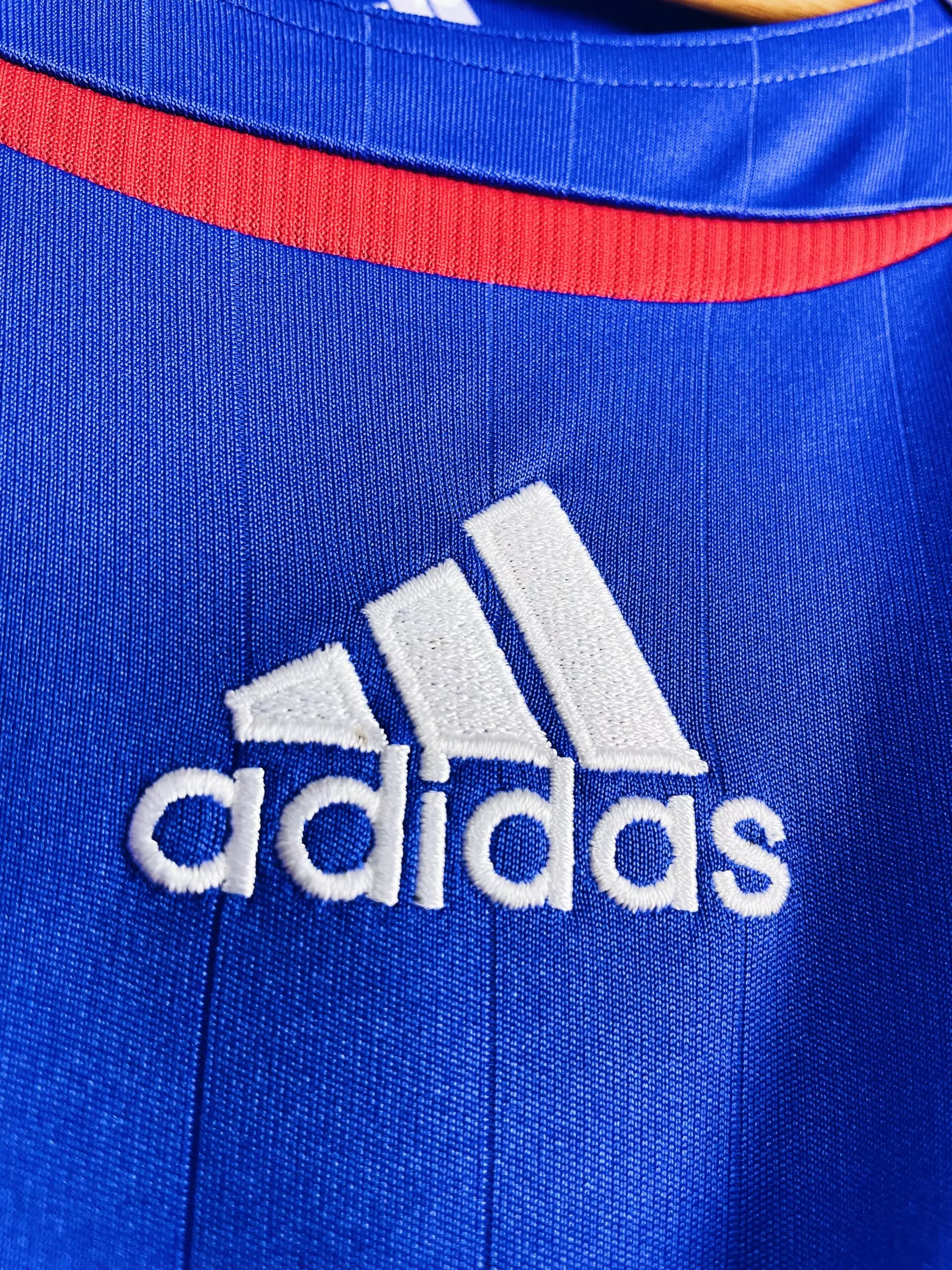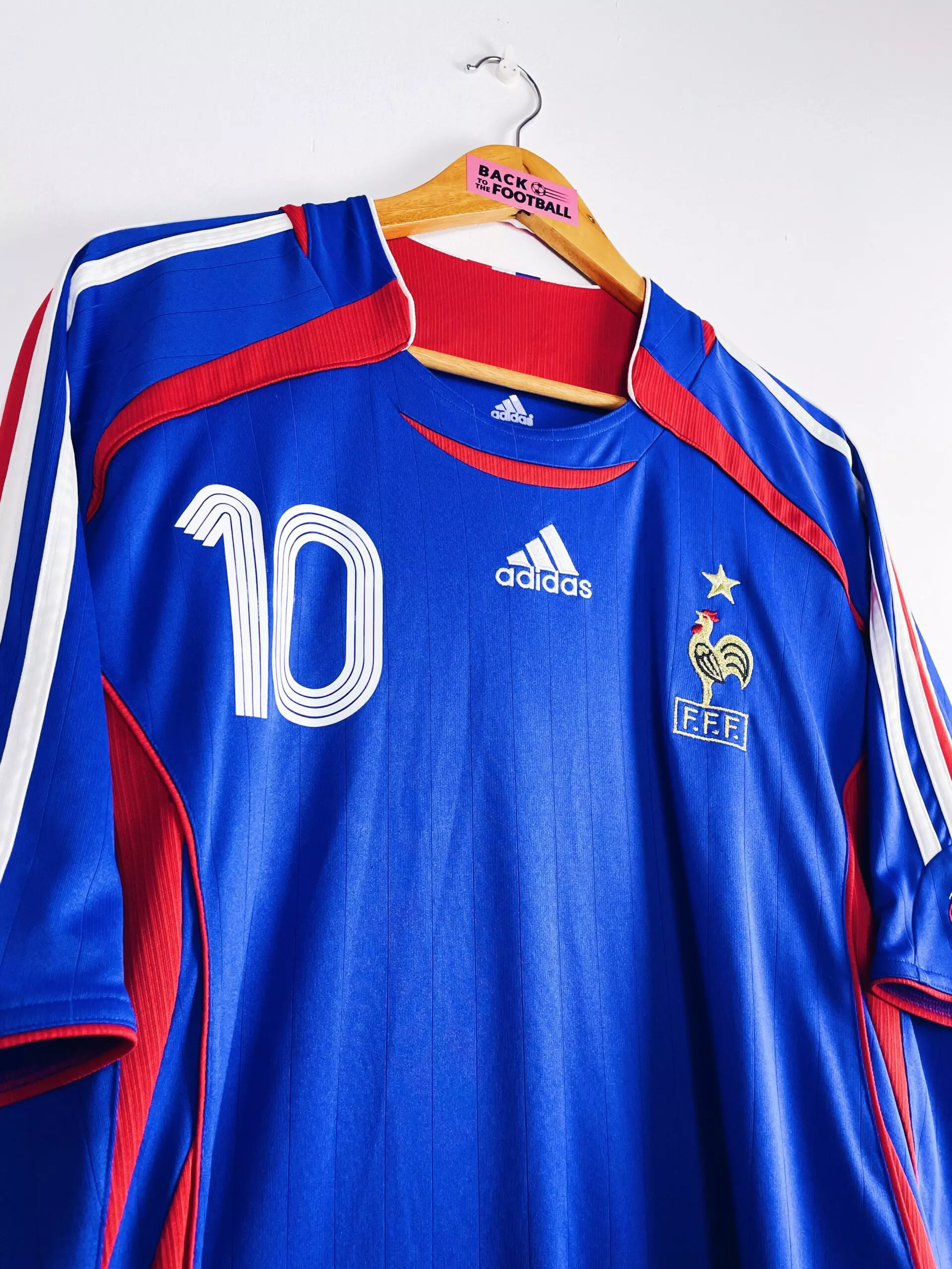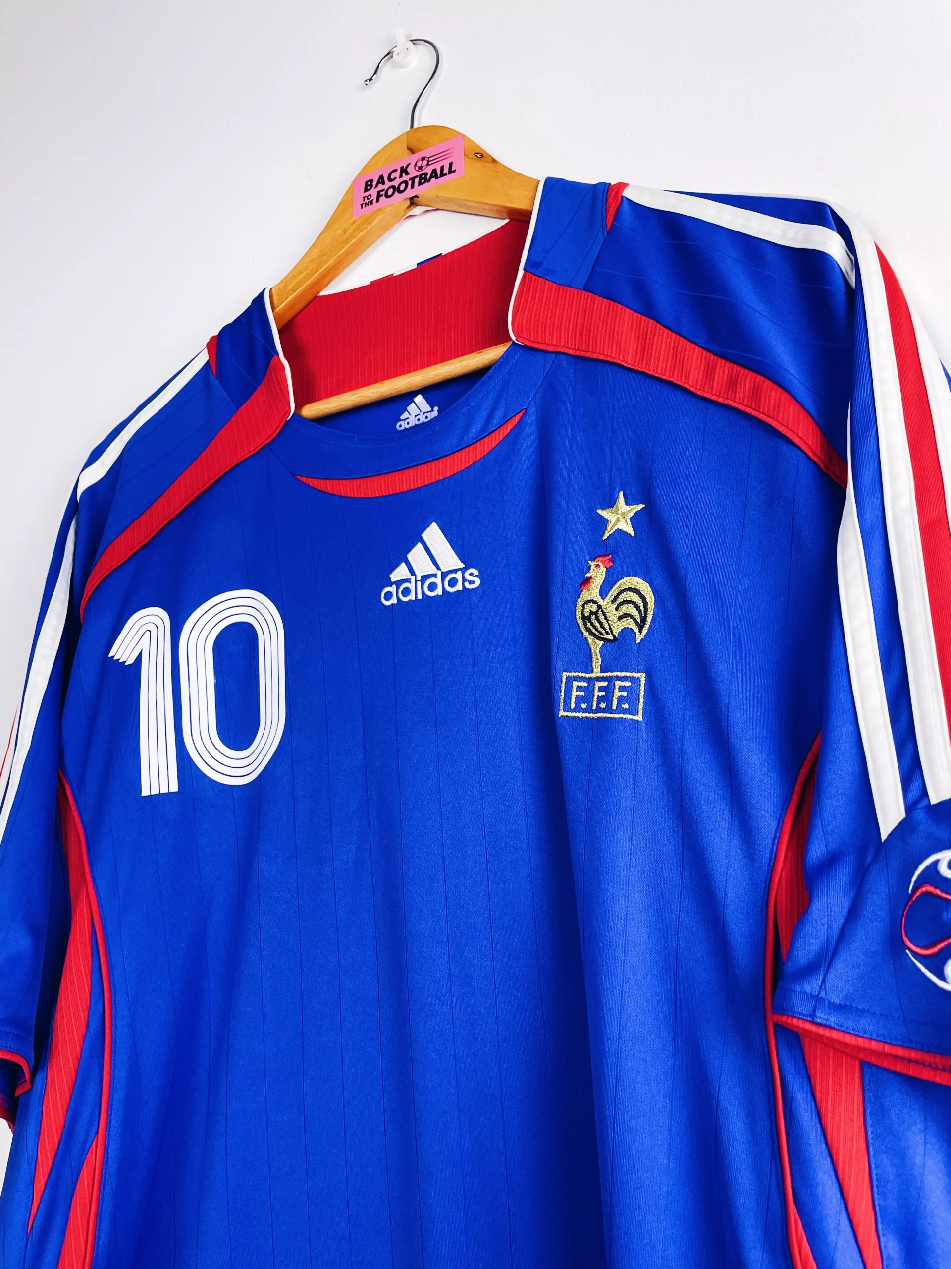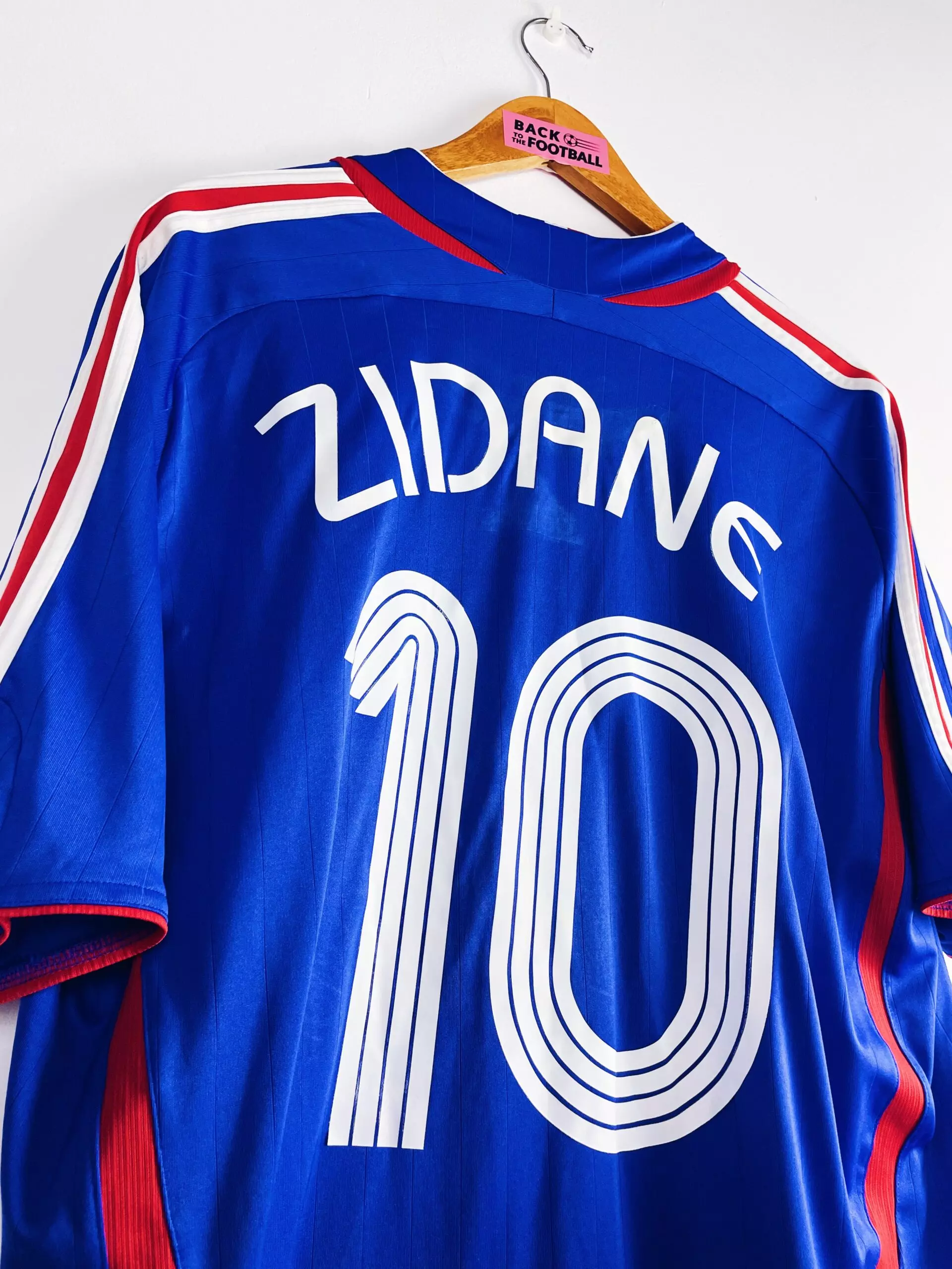 Taille : XL Etat : 7/10, très bon état hormis au niveau du flocage dans le dos où le logo Adidas a déteint (voir photo). D’où le prix. Le maillot : maillot vintage domicile de l’équipe de France pour la Coupe du Monde 2006, floqué Zidane #10. L’écusson avec l’étoile est brodé, comme le logo Adidas. Très beau maillot rétro de la France ! Histoire : après avoir difficilement passé les poules, avec une deuxième place derrière la Suisse, les Bleus lancent vraiment leur compétition en huitièmes de finale face à l’Espagne, qui voulait envoyer à la retraite Zizou. C’est…