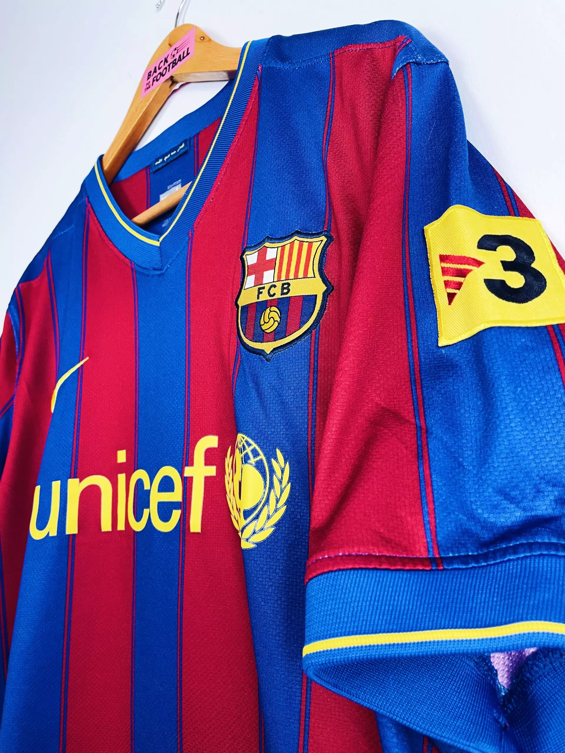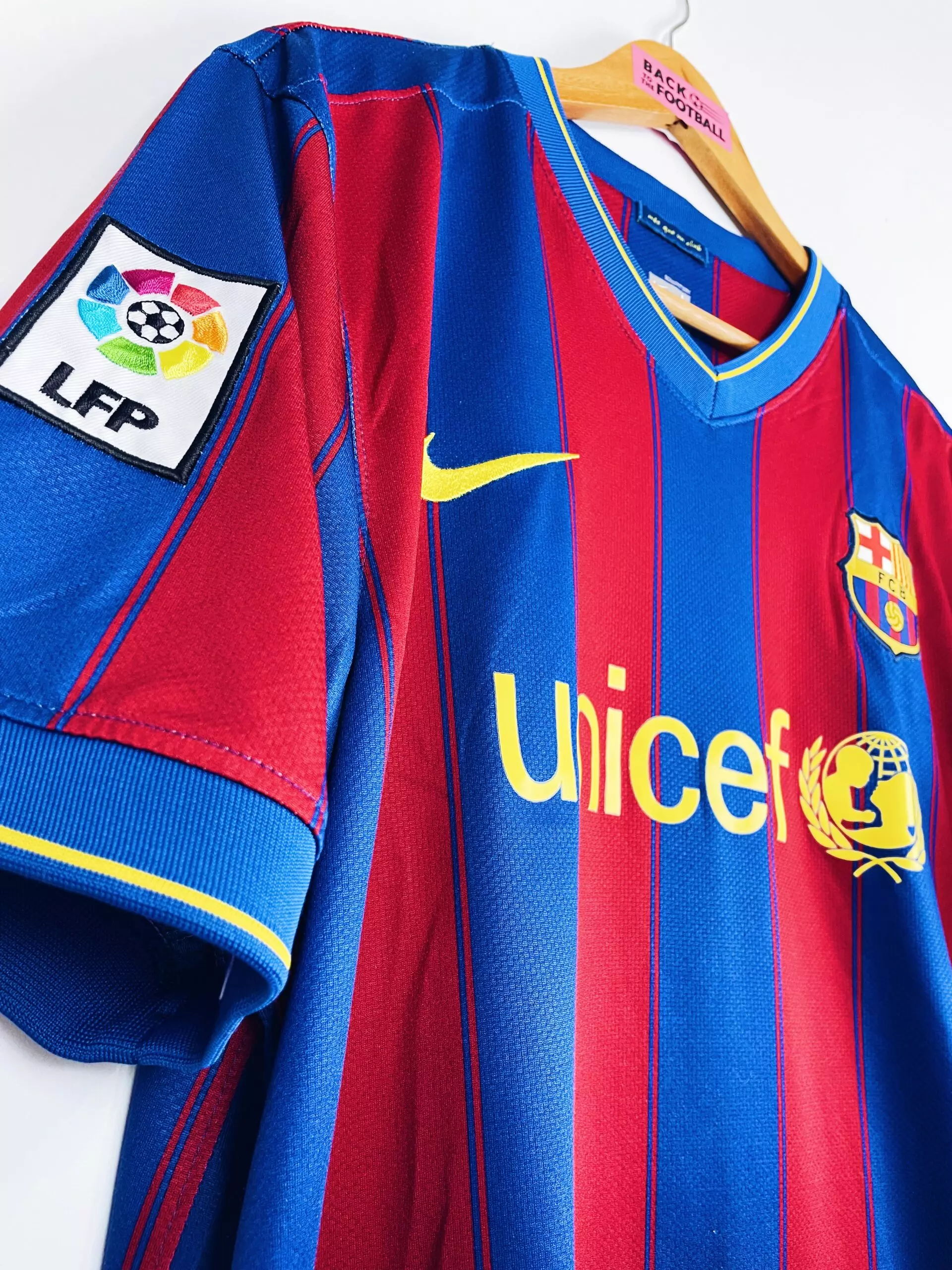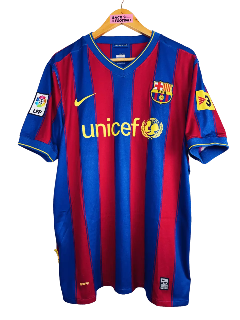 Taille : L Etat : 9/10 très bon état Le maillot : maillot vintage du FC Barcelone 2009/2010 floqué Messi. L’écusson et le logo Nike sont brodés. Le sponsor Unicef est floqué. Les patchs LFP et TV3 sur les manches sont brodés. Très beau maillot rétro du FC Barcelone ! Histoire : énorme saison des hommes de Guardiola avec un titre de champion de Liga avec 99 points ! Le Real est juste derrière à 96 points. Les Blaugranas gagneront également la Supercoupe d’Espagne, la Supercoupe de l’UEFA et la Coupe du monde des clubs. En Ligue des Champions, ils…