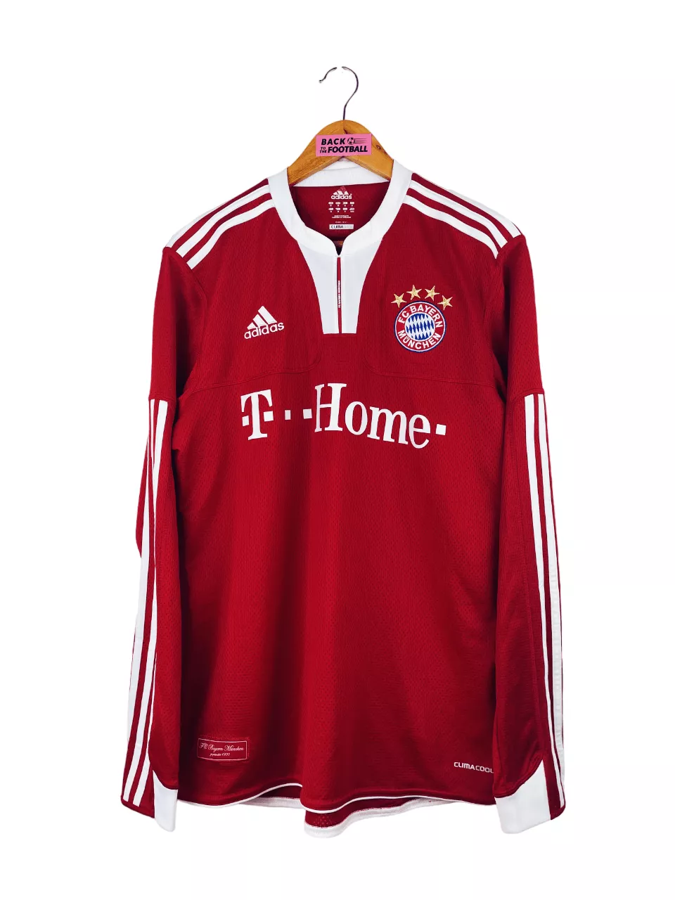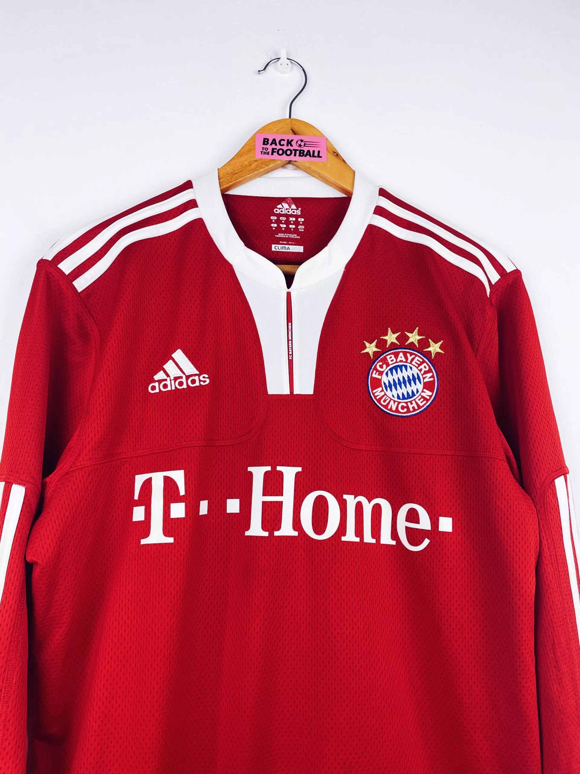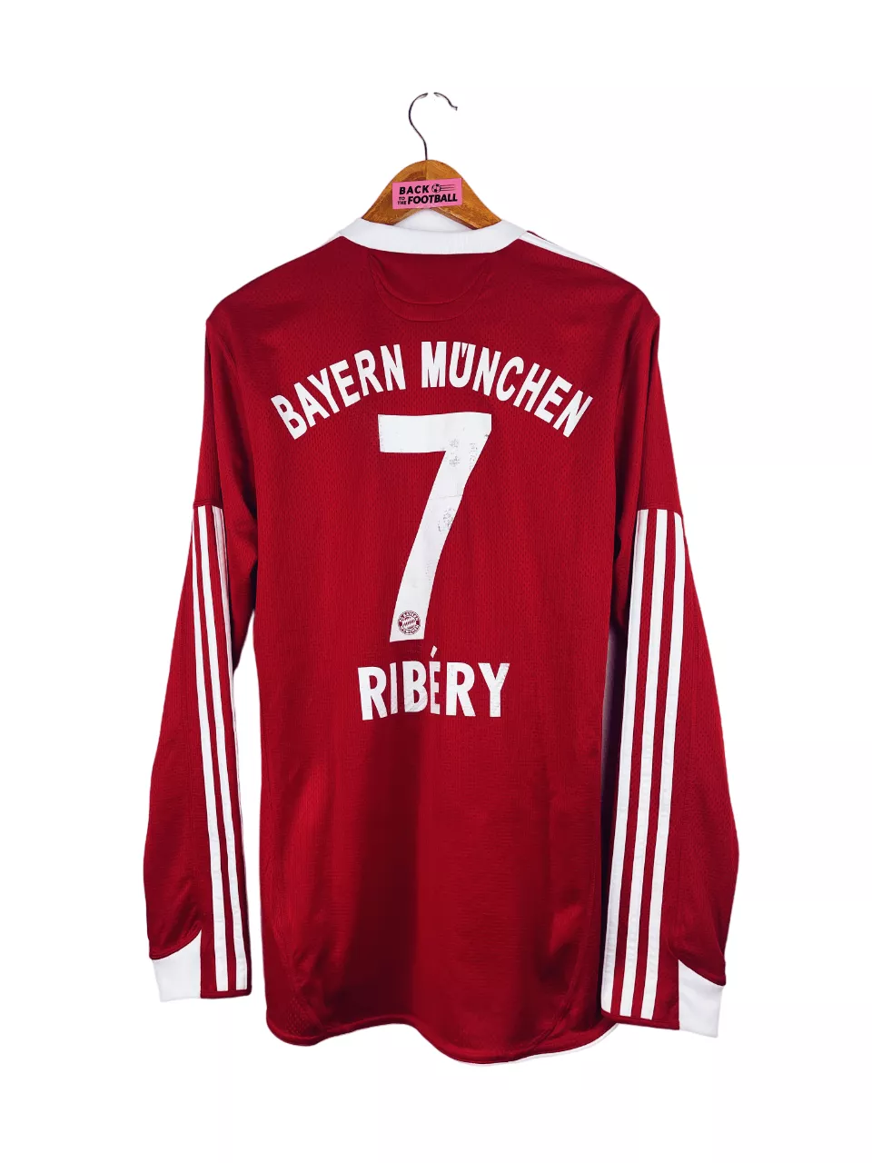 Taille : M Si tu veux plus de détails, tu peux nous contacter par mail ou sur les réseaux 😉 Etat : 8/10, très bon état hormis le flocage de Ribéry qui est un peu abimé (voir photo) Le maillot : maillot vintage domicile du Bayern Munich 2009/2010 manches longues floqué Ribery #7. L’écusson et le logo Adidas sont brodés, le sponsor T. Home est floqué comme Ribery #7 au dos. Très beau maillot rétro du Bayern ! Histoire : grosse saison des bavarois avec une victoire en Bundesliga et en coupe d’Allemagne. En Ligue des Champions, ils s’inclinent en…