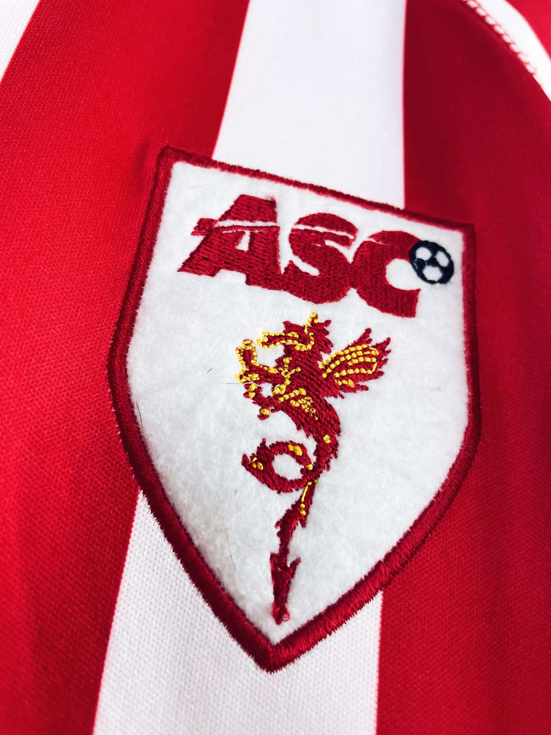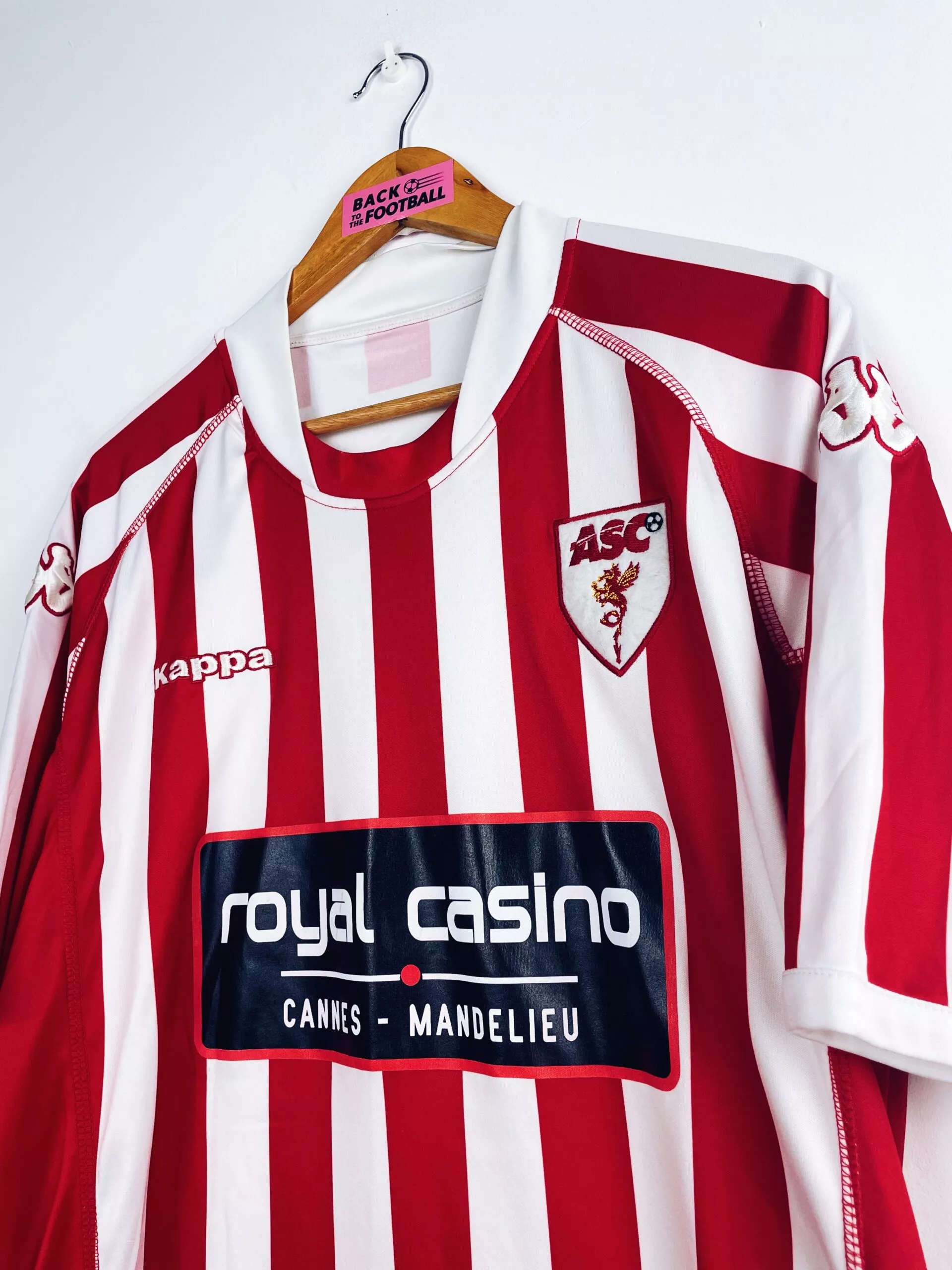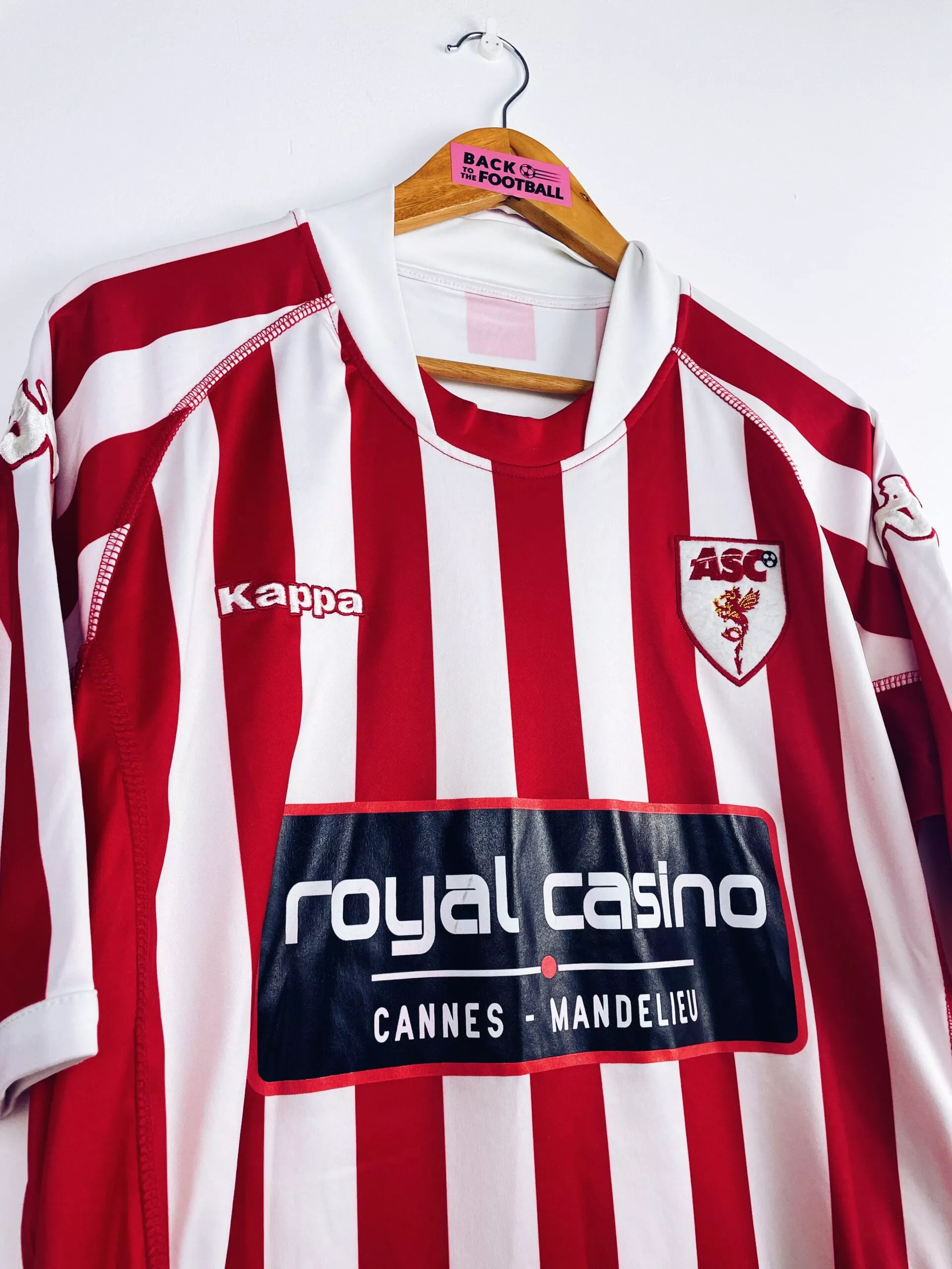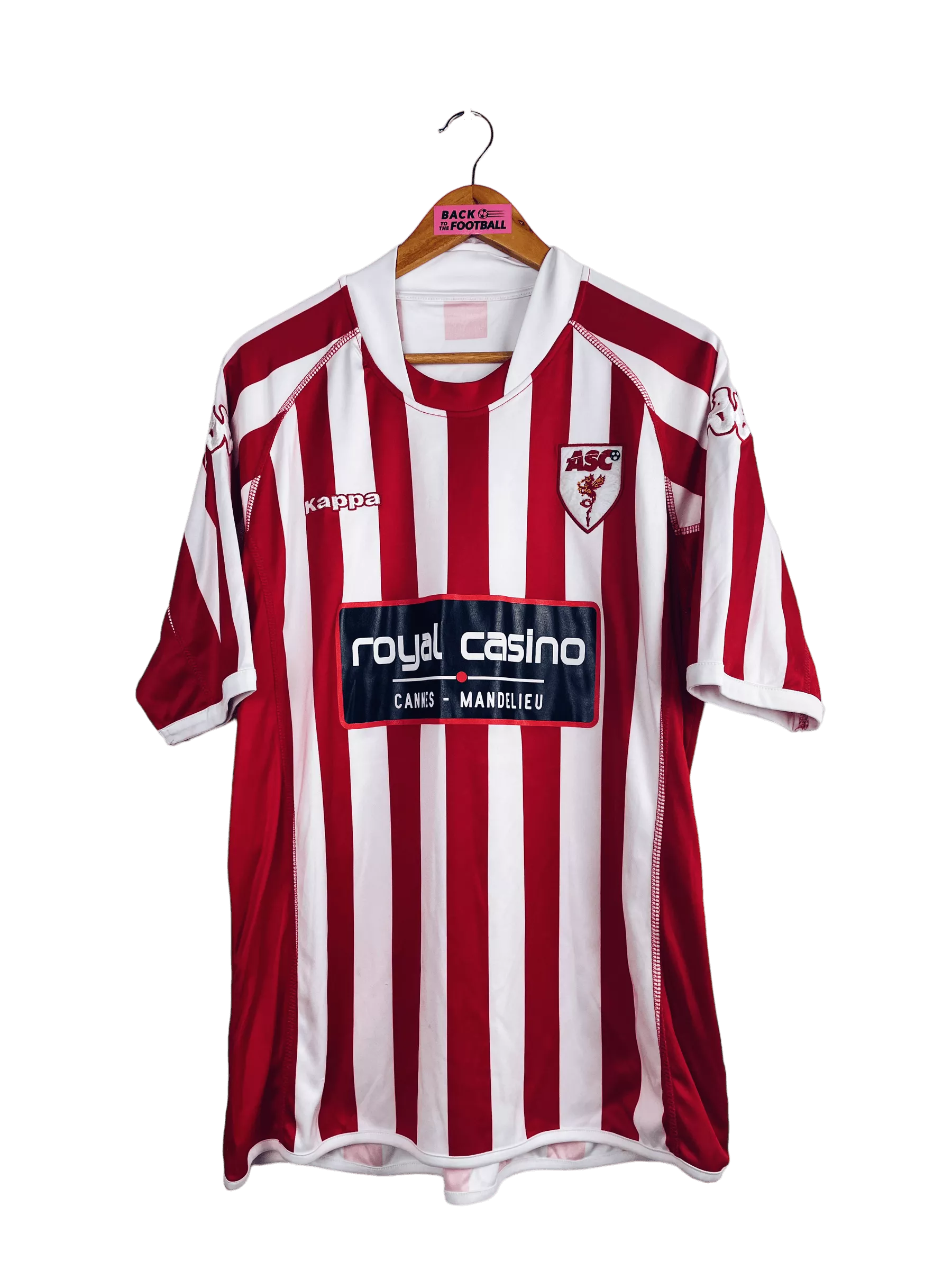 Taille : XL Etat : 8/10, très bon état mais quelques bouloches Le maillot : maillot vintage domicile de l’AS Cannes 2009/2010. L’écusson et le logo Kappa sont brodés, le sponsor Royal Casino est floqué. Très beau maillot rétro de l’AS Cannes ! Histoire : l’AS Cannes termine à la 9ème place de National cette saison.