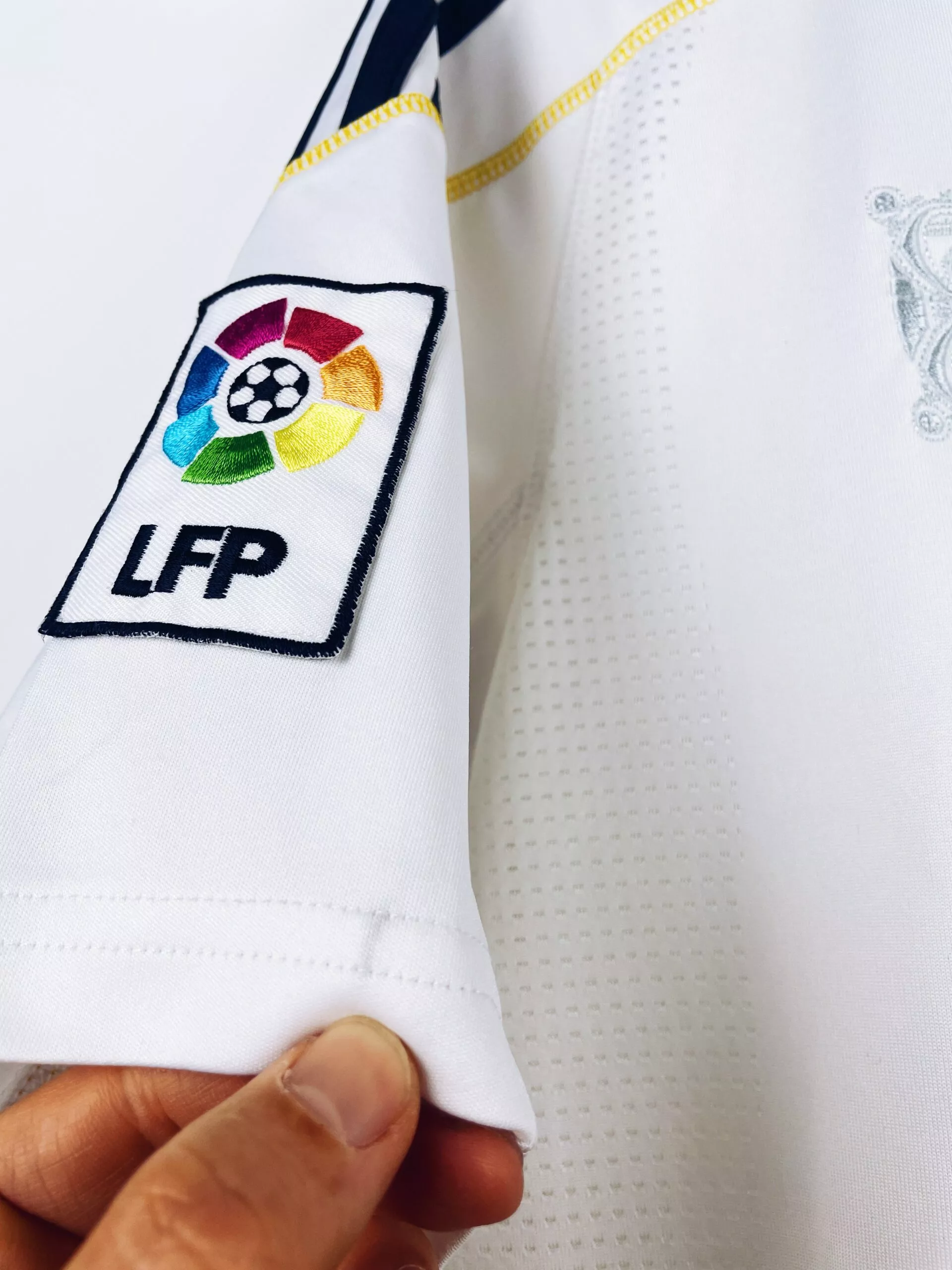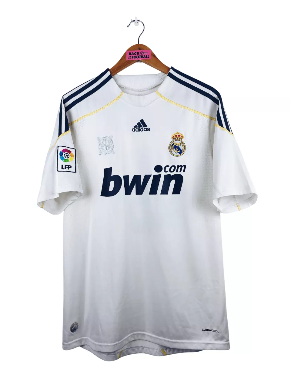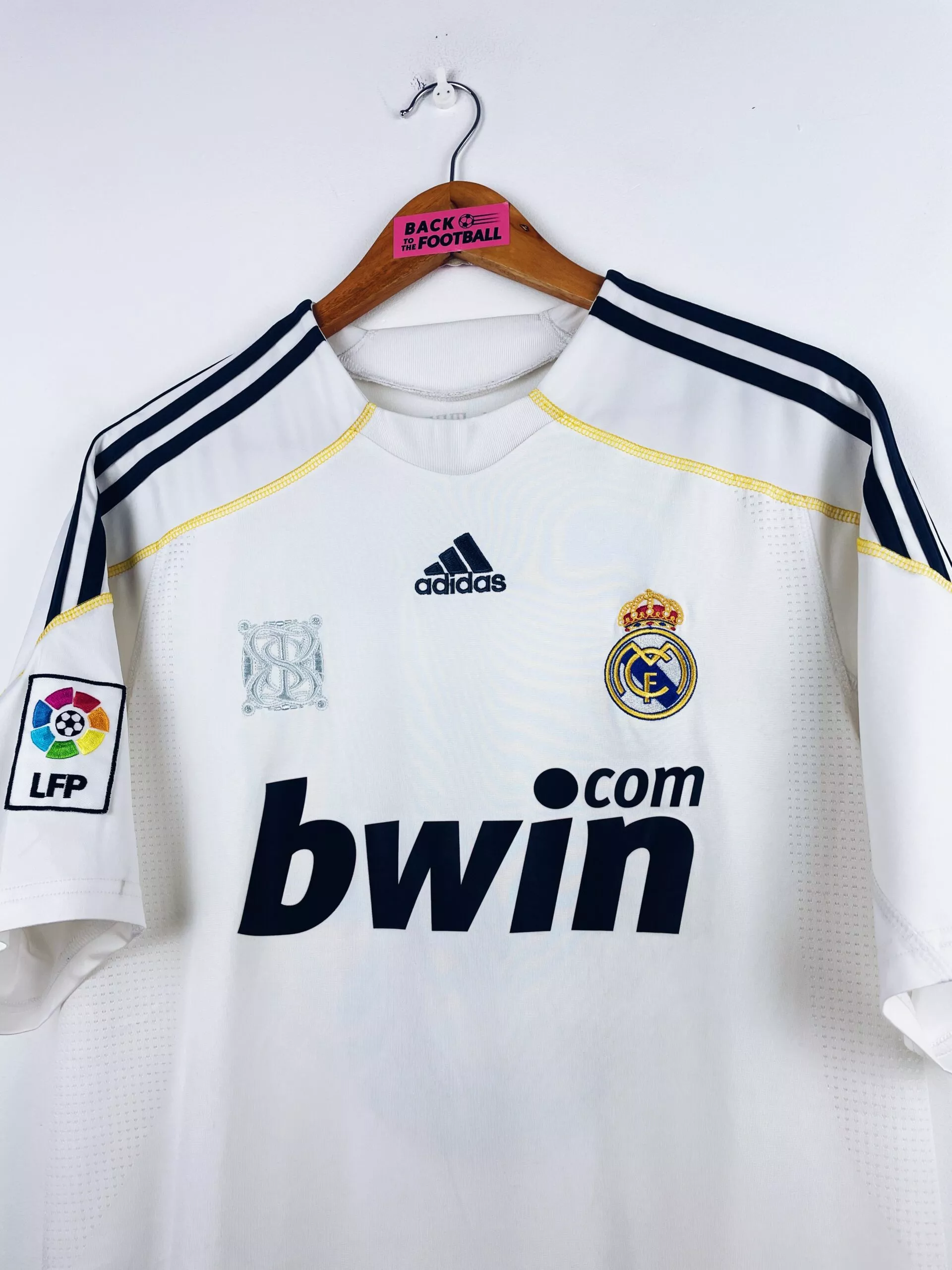 Taille : M Largeur : 51cm (aisselle à aisselle) Longueur : 73cm (base du col au bas) Si tu veux plus de détails, tu peux nous contacter par mail ou sur les réseaux 😉 Etat : 8.5/10, excellent état, mini trace à côté du patch LFP (voir photo) Le maillot : maillot vintage du Real Madrid 2009/2010 domicile floqué Ronaldo #9. L’écusson et le logo Adidas sont brodés, le sponsor Bwin est floqué. CR9 au dos est floqué aussi. Le patch Liga sur la manche est brodé. Très beau maillot rétro du Real Madrid ! Histoire : saison sans trophées…