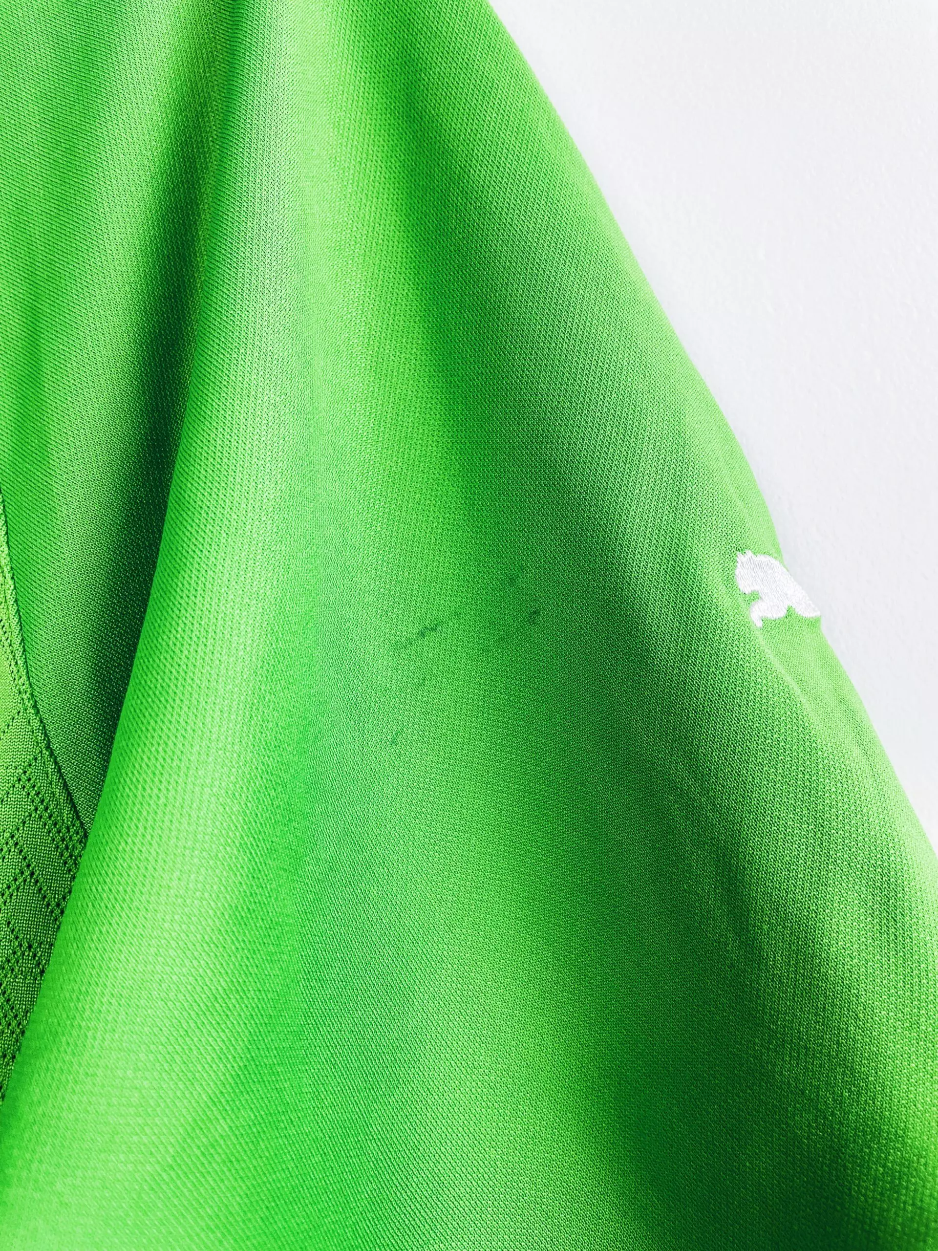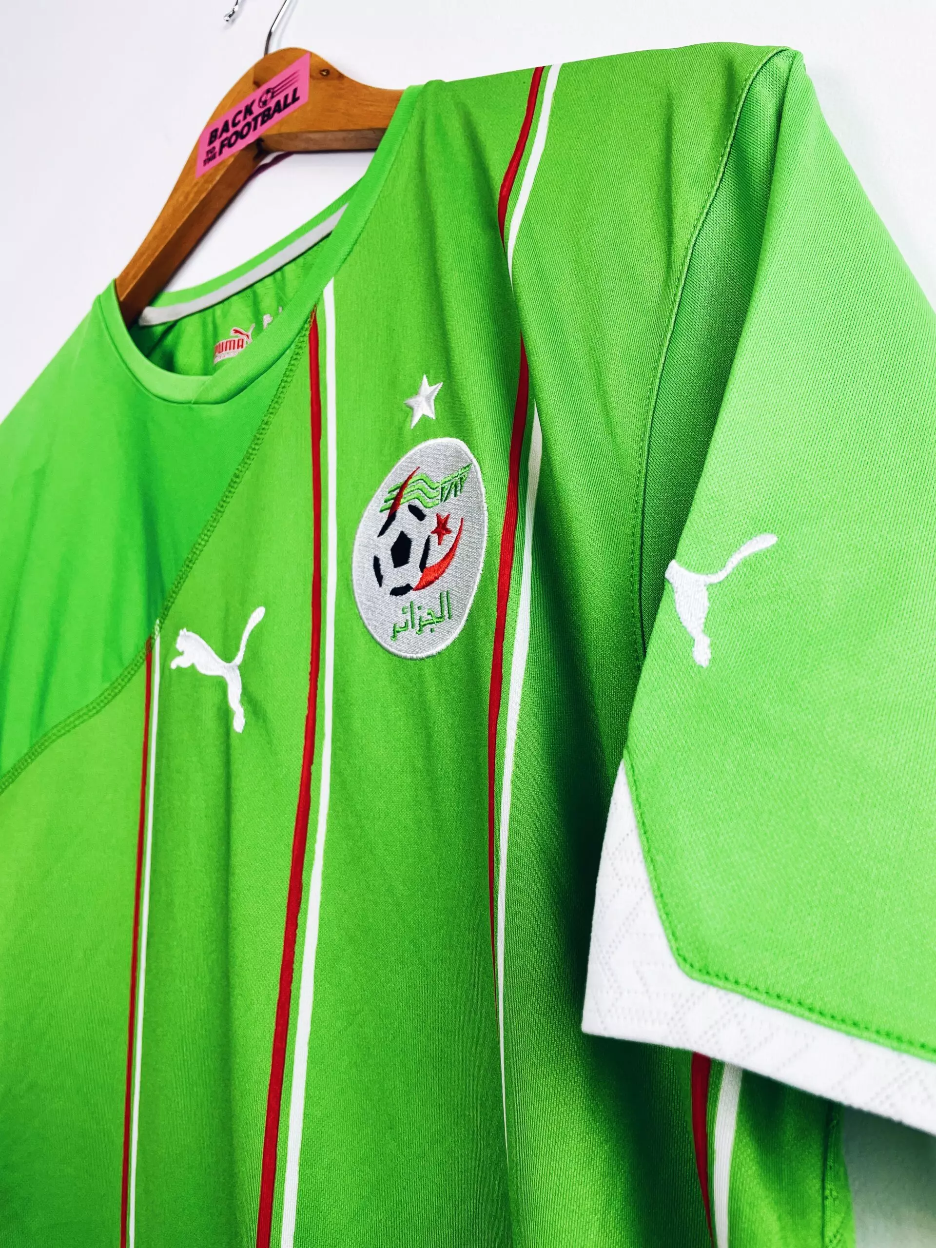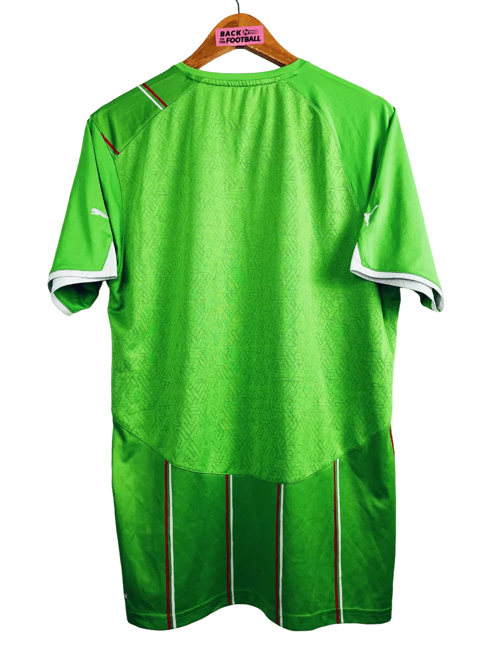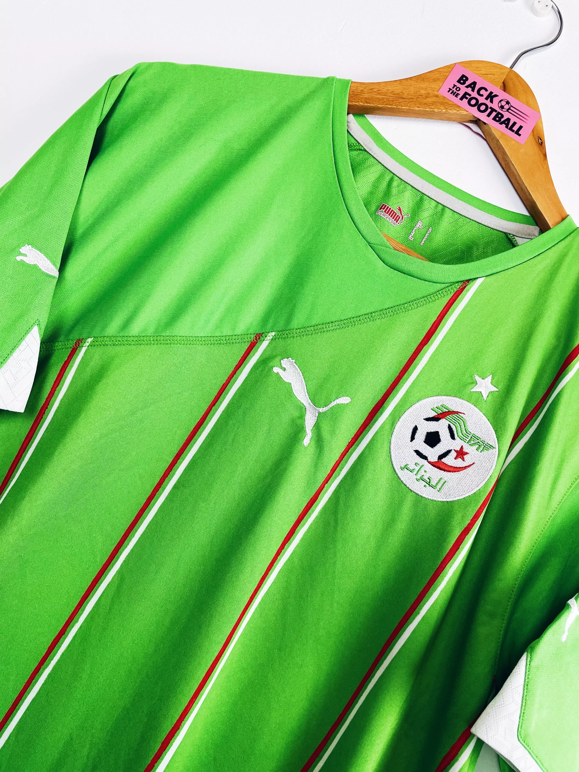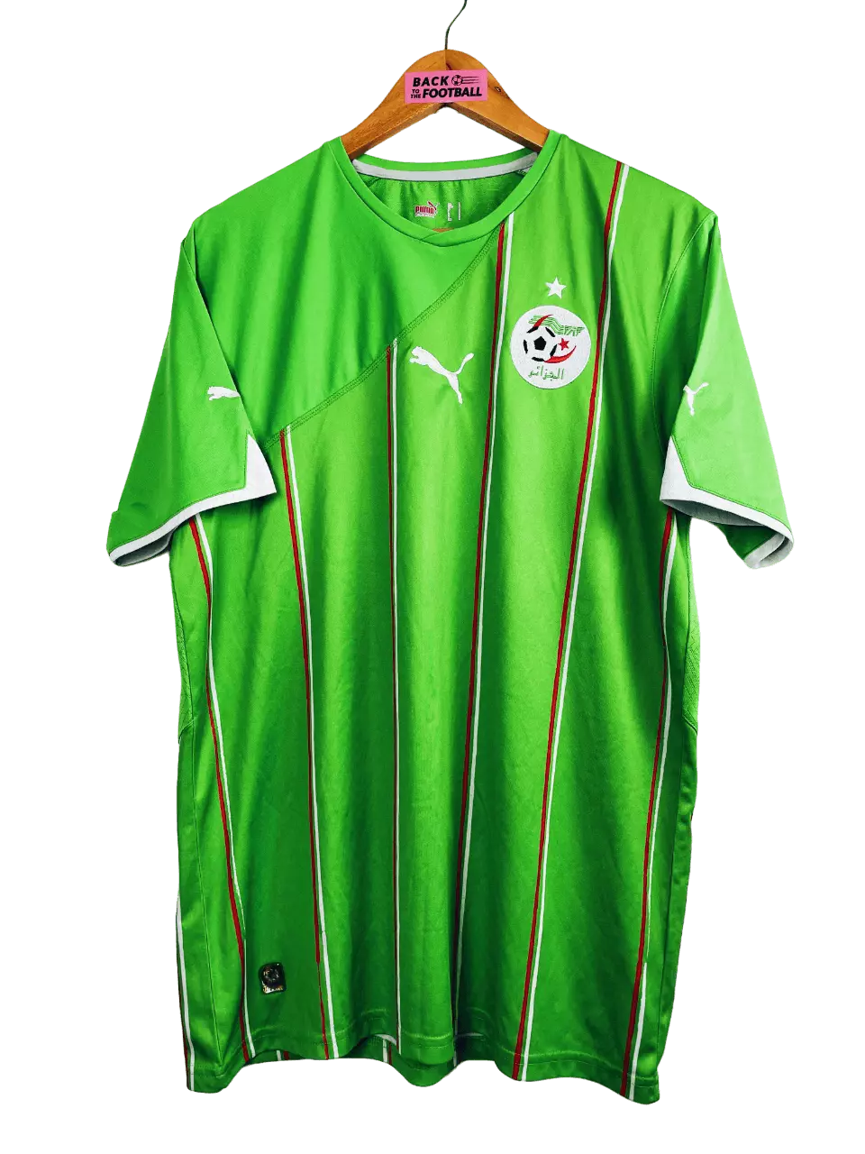 Taille : L Etat : 7/10, très bon état mais légères traces sur la manche (voir photo) Le maillot : maillot vintage domicile de l’Algérie 2010 utilisé pour la Coupe du Monde. L’écusson et le logo Puma sont brodés. Très beau maillot rétro de l’Algérie ! Histoire : les Fennecs ne passeront pas la phase de poule de la Coupe du Monde 2010 avec une dernière place de leur groupe avec un match nul contre l’Angleterre et deux défaites contre les USA et la Slovénie. Quelques joueurs : Yahia, Matmour, Djebbour, Ziani, Yebda, Bougherra…