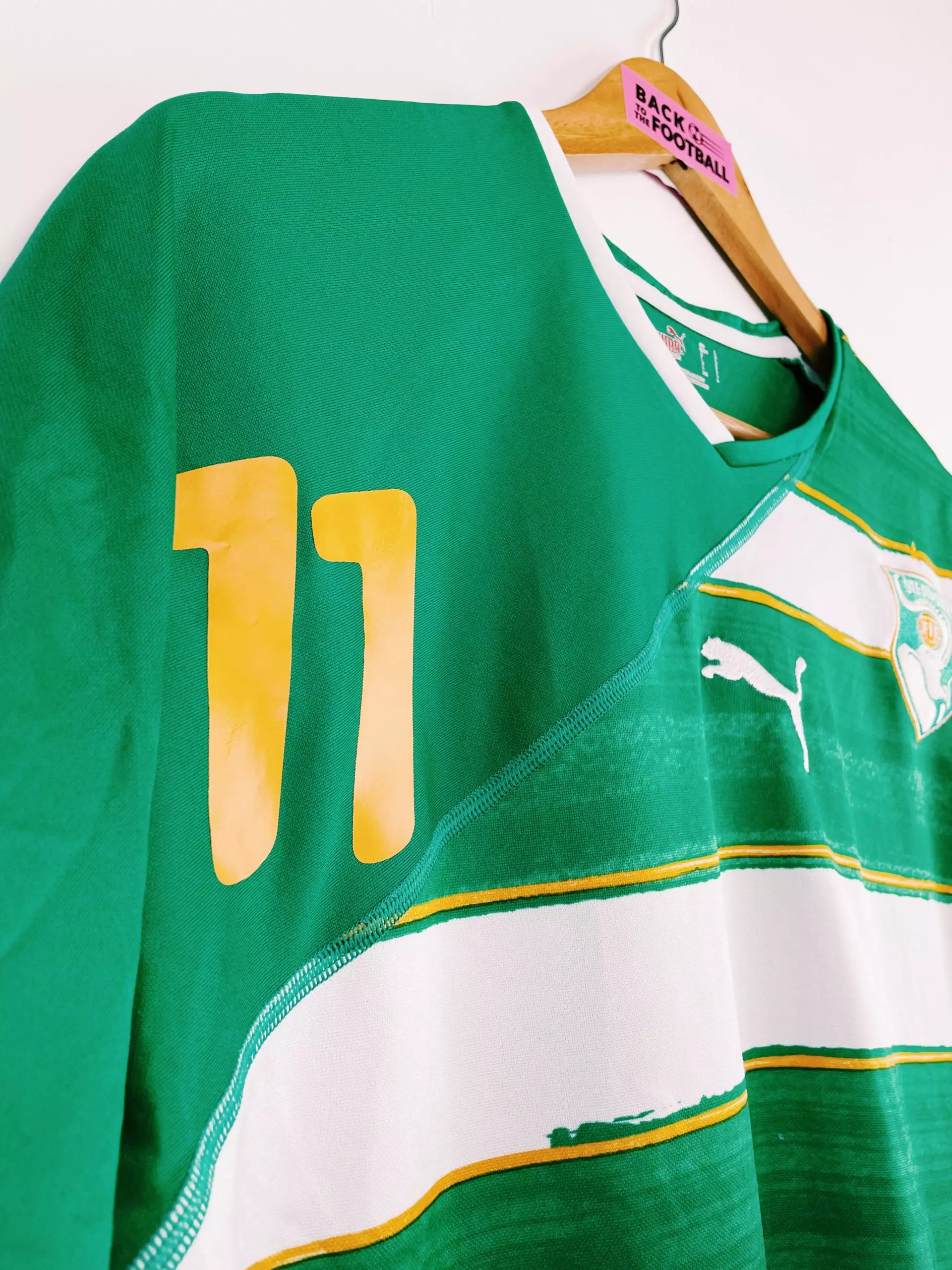 Taille : L Etat : 7/10, très bon état malgré quelques petites bouloches et une petite tache sur la manche (voir photo) Le maillot : maillot vintage extérieur de la Côte d’Ivoire 2010 floqué Didier Drogba #11. L’écusson est brodé comme le logo Puma. Histoire : la Côte d’Ivoire tombe dans un groupe très compliqué lors de la Coupe du Monde 2010, avec le Brésil, le Portugal et la Corée du Nord. Les ivoiriens passent à 2 doigts de la qualification avec 1 point de retard sur le Portugal. Le capitaine Didier Drogba marquera 1 but. Quelques joueurs : Kolo…
