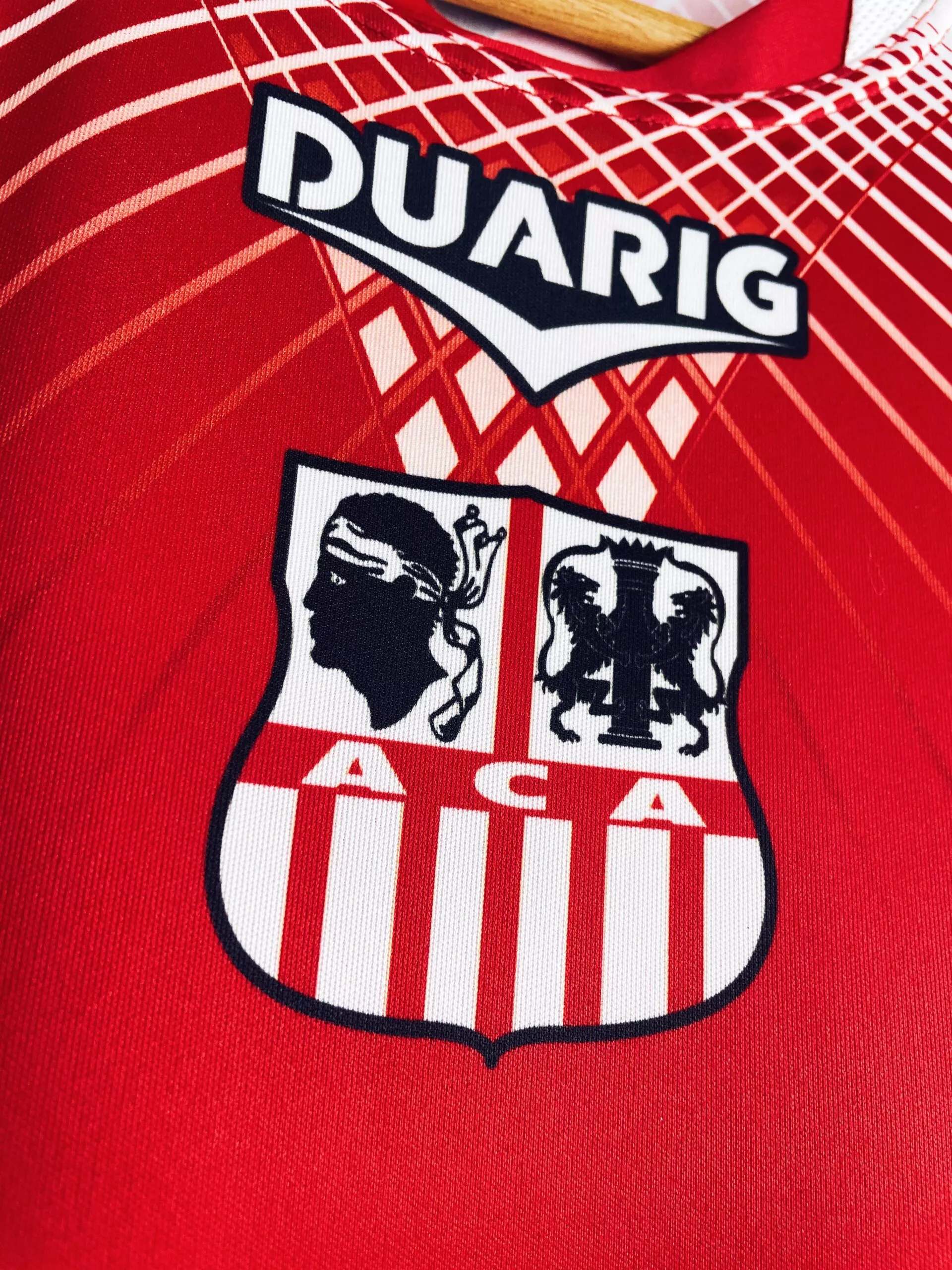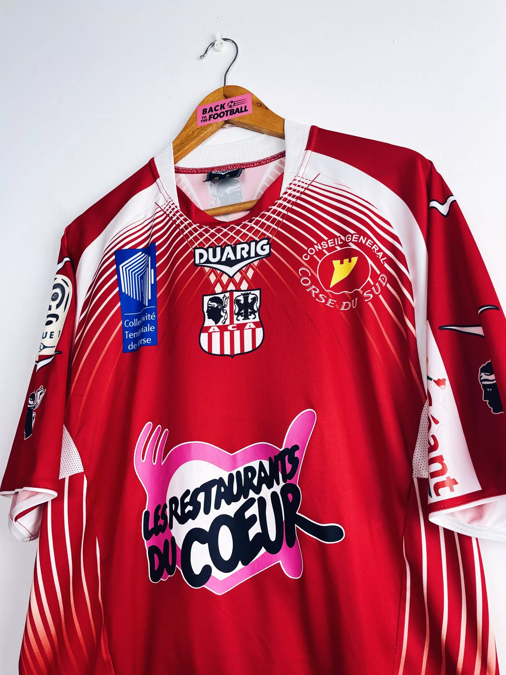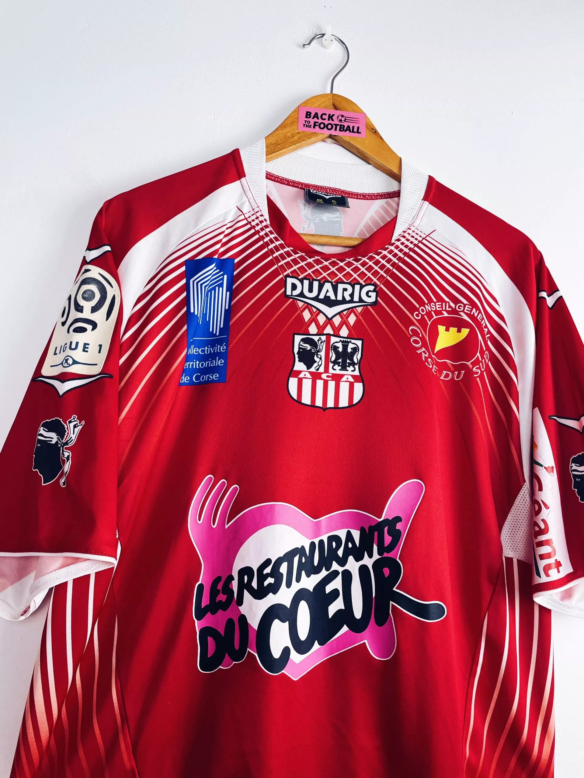 Taille : XL Etat : 8/10, très bon état hormis le sponsor Géant sur la manche qui est un peu abimé (voir photo) Le maillot : maillot vintage domicile de l’AC Ajaccio 2011/2012 préparé (match issue) ou porté (match worn) par Mehdi Mostefa : patch, full sponsors, bonne taille. L’écusson et le logo Duarig sont incrustés. Les sponsors sont floqués. Le patch Ligue 1 sur la manche est en feutrine. Et les têtes de Maure sont incrustés sur les manches. Très beau maillot rétro de l’AC Ajaccio ! Histoire : l’AC Ajaccio revient dans l’élite après plusieurs années en Ligue…