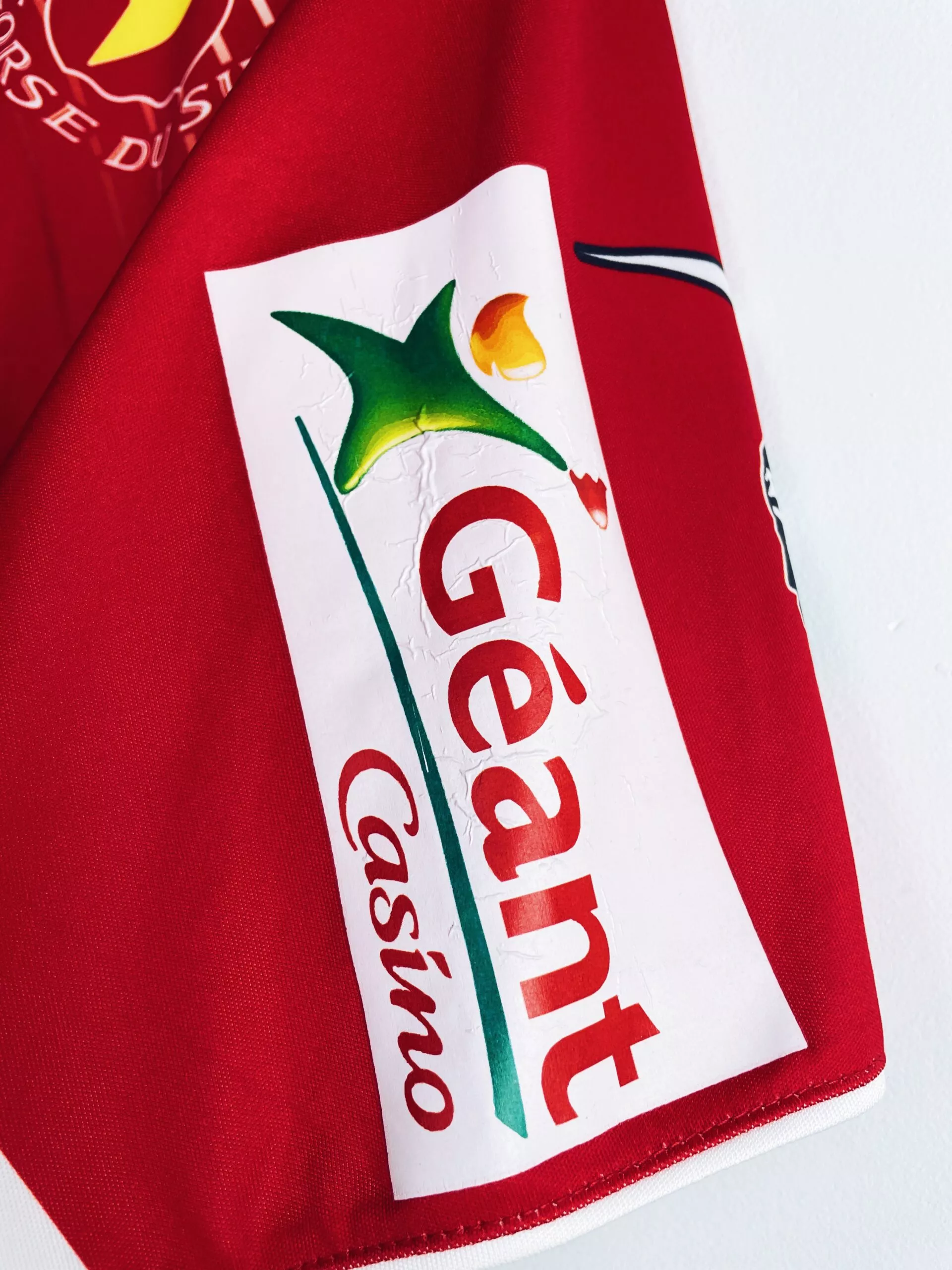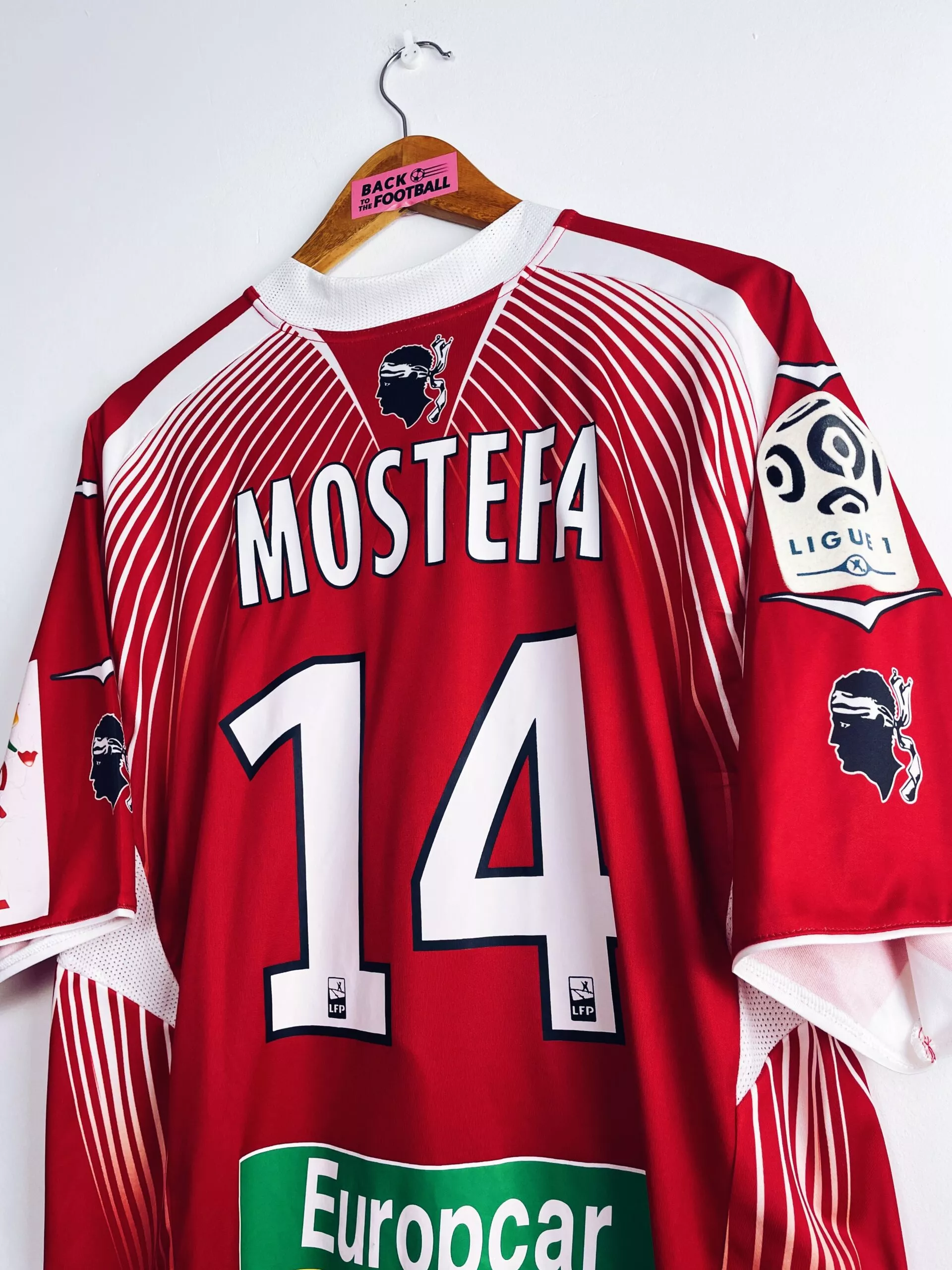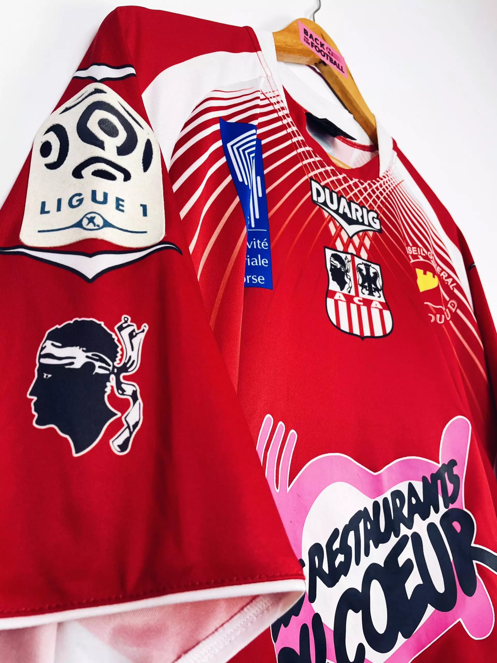 Taille : XL Etat : 8/10, très bon état hormis le sponsor Géant sur la manche qui est un peu abimé (voir photo) Le maillot : maillot vintage domicile de l’AC Ajaccio 2011/2012 préparé (match issue) ou porté (match worn) par Mehdi Mostefa : patch, full sponsors, bonne taille. L’écusson et le logo Duarig sont incrustés. Les sponsors sont floqués. Le patch Ligue 1 sur la manche est en feutrine. Et les têtes de Maure sont incrustés sur les manches. Très beau maillot rétro de l’AC Ajaccio ! Histoire : l’AC Ajaccio revient dans l’élite après plusieurs années en Ligue…
