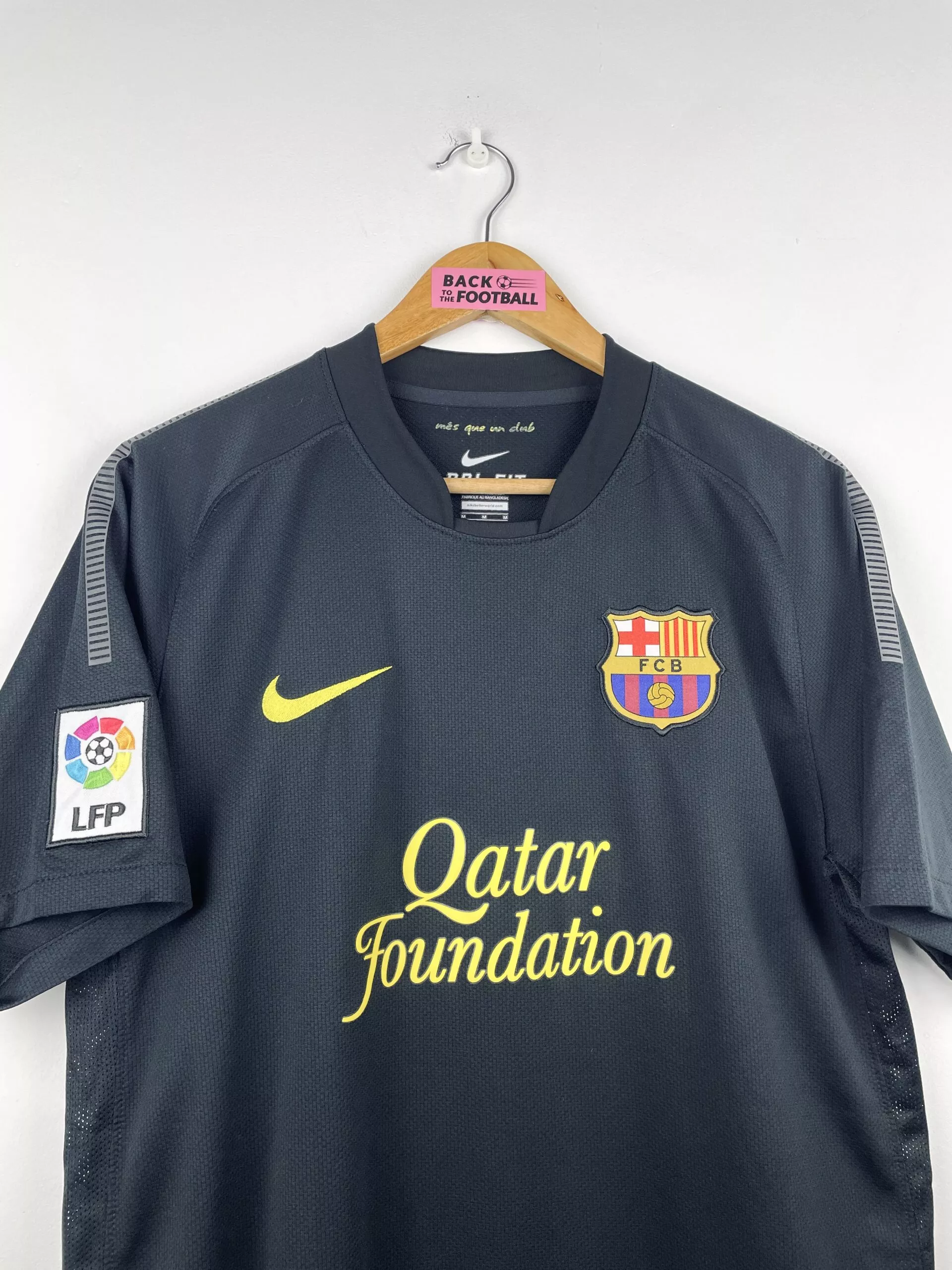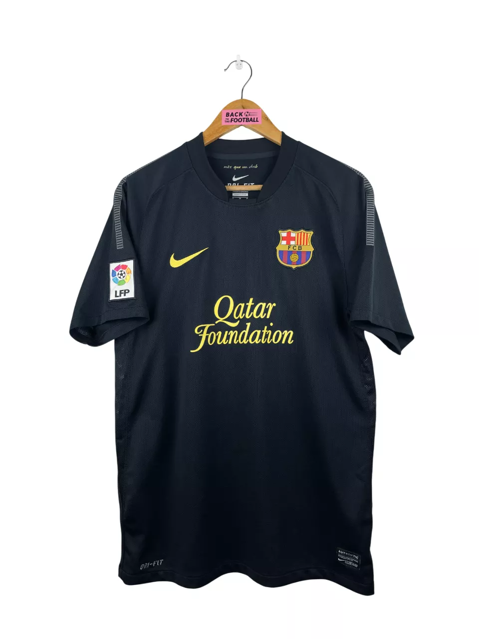 Taille : M Si tu veux plus de détails, tu peux nous contacter par mail ou sur les réseaux 😉 Etat : 8.5/10, excellent état Le maillot : maillot vintage extérieur du FC Barcelone 2011/2012 floqué Messi #10. L’écusson et le logo Nike sont brodés. Le sponsor Qatar Foundation et Messi au dos sont floqués. Patch LFP brodé sur la manche. Très beau maillot rétro de Barcelone ! Histoire : dernière saison à Barcelone pour Pep Guardiola. Les Blaugranas termineront 2èmes de Liga, derrière le Real Madrid… Ils seront éliminés en demi-finale de Ligue des Champions face à Chelsea, futur…