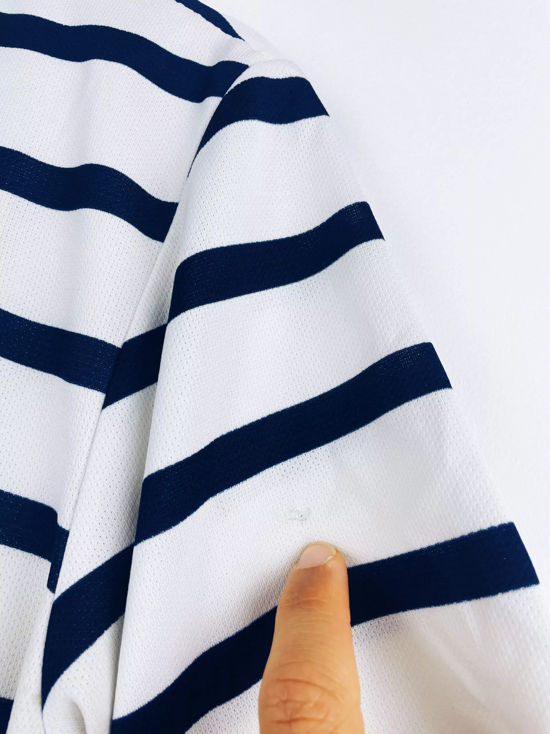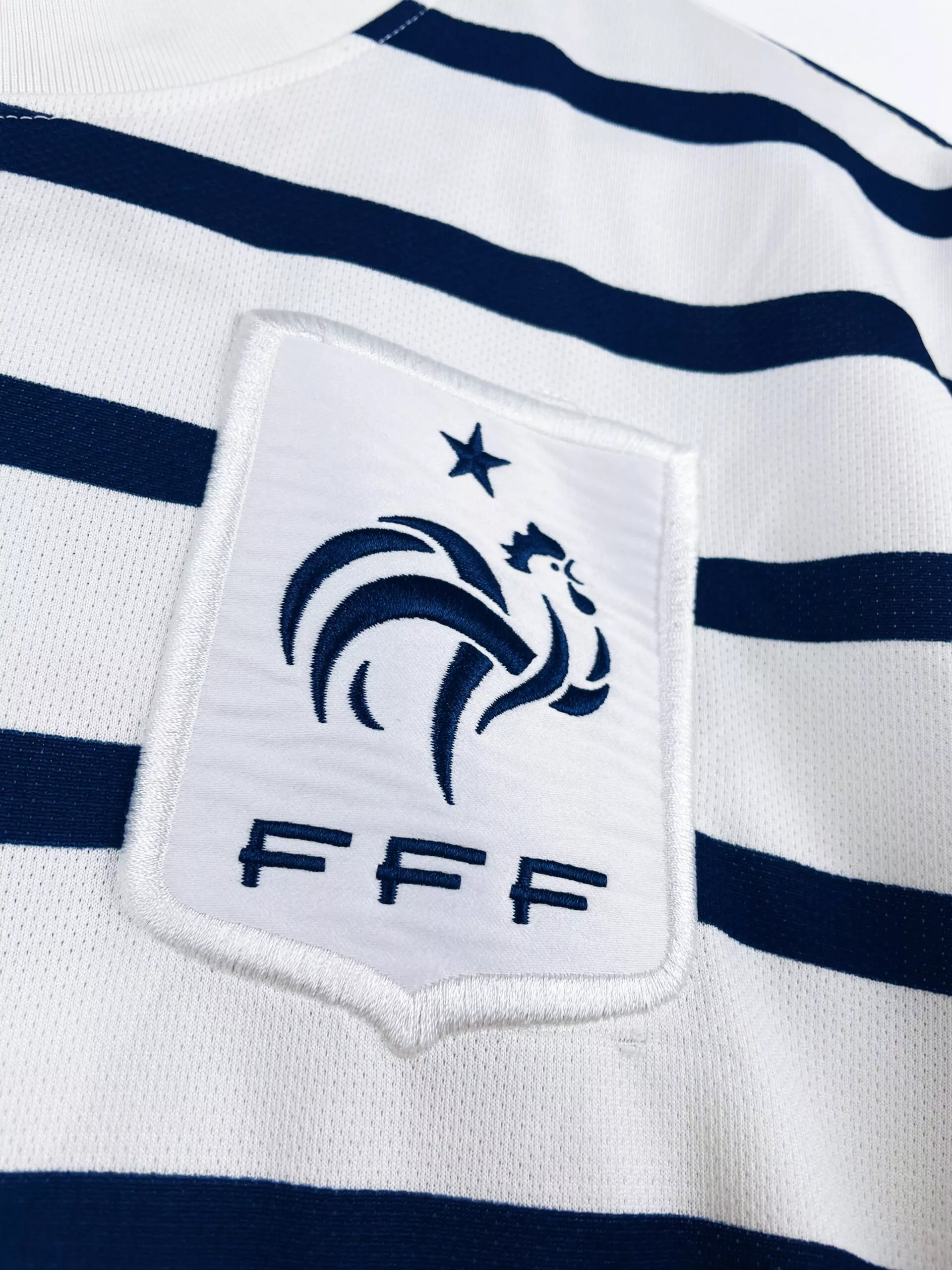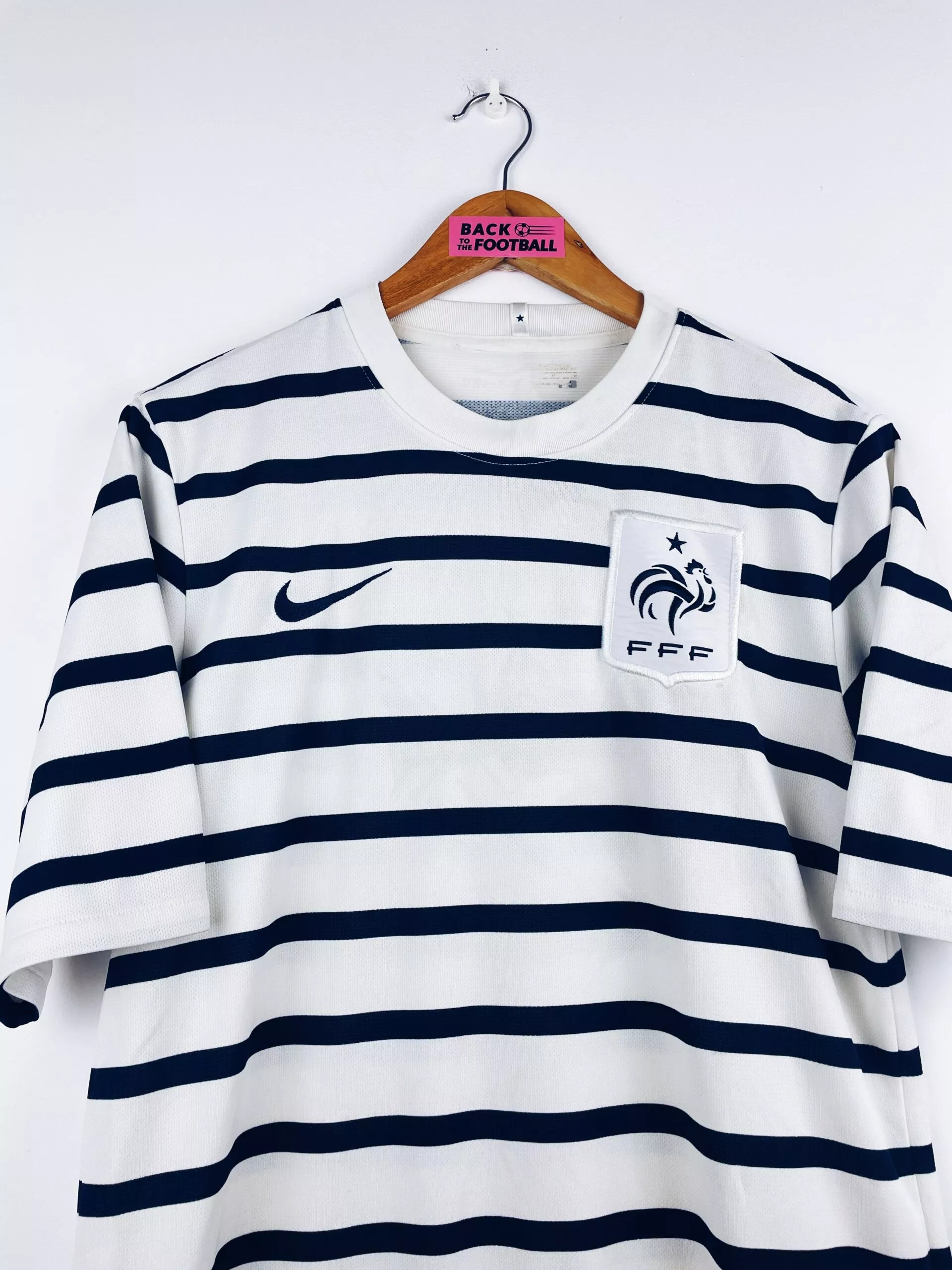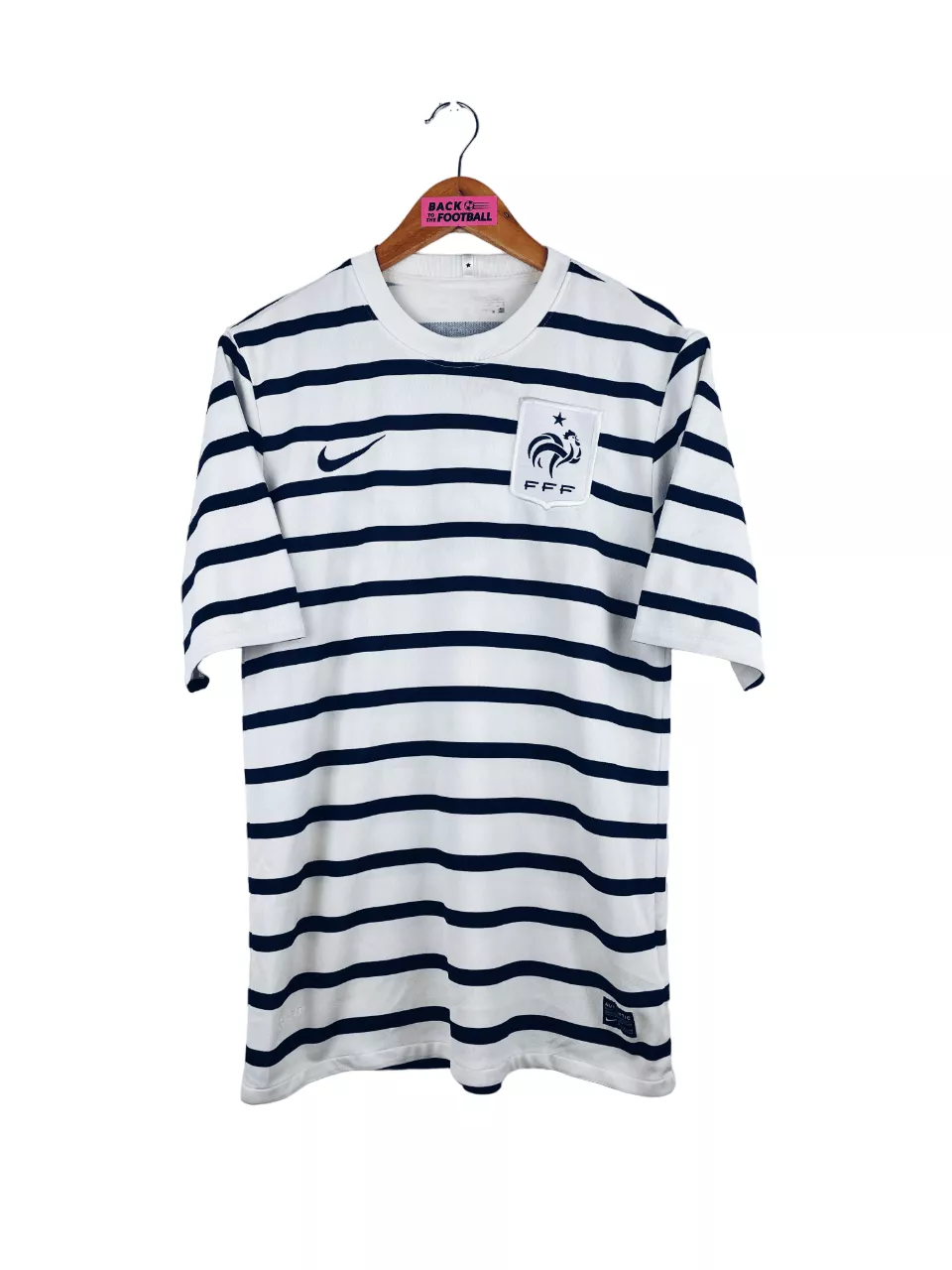 Taille : M Si tu veux plus de détails, tu peux nous contacter par mail ou sur les réseaux 😉 Etat : 7.5/10, mini accro en dessous de l’écusson et sur la manche (voir photos) Le maillot : maillot vintage domicile de l’équipe de France 2011/2012. La fameuse marinière. L’écusson et le logo Nike sont brodés. Très beau maillot rétro de la France ! Histoire : les Bleus porteront ce fameux maillot marinière pendant les qualifications à l’Euro 2012. Dans un groupe serré, les Bleus de Laurent Blanc terminent à la première place, un point devant la Bosnie, et valident…