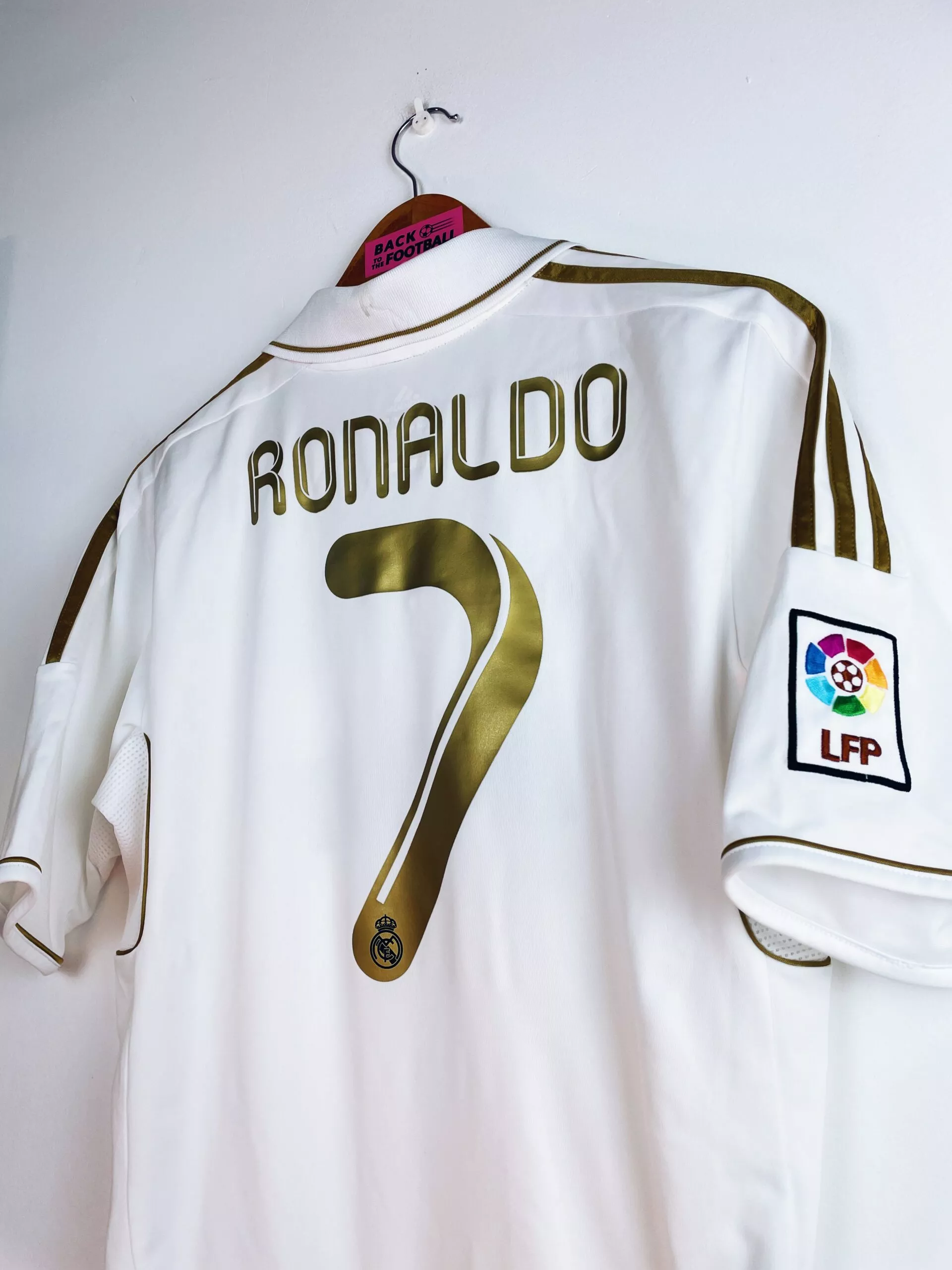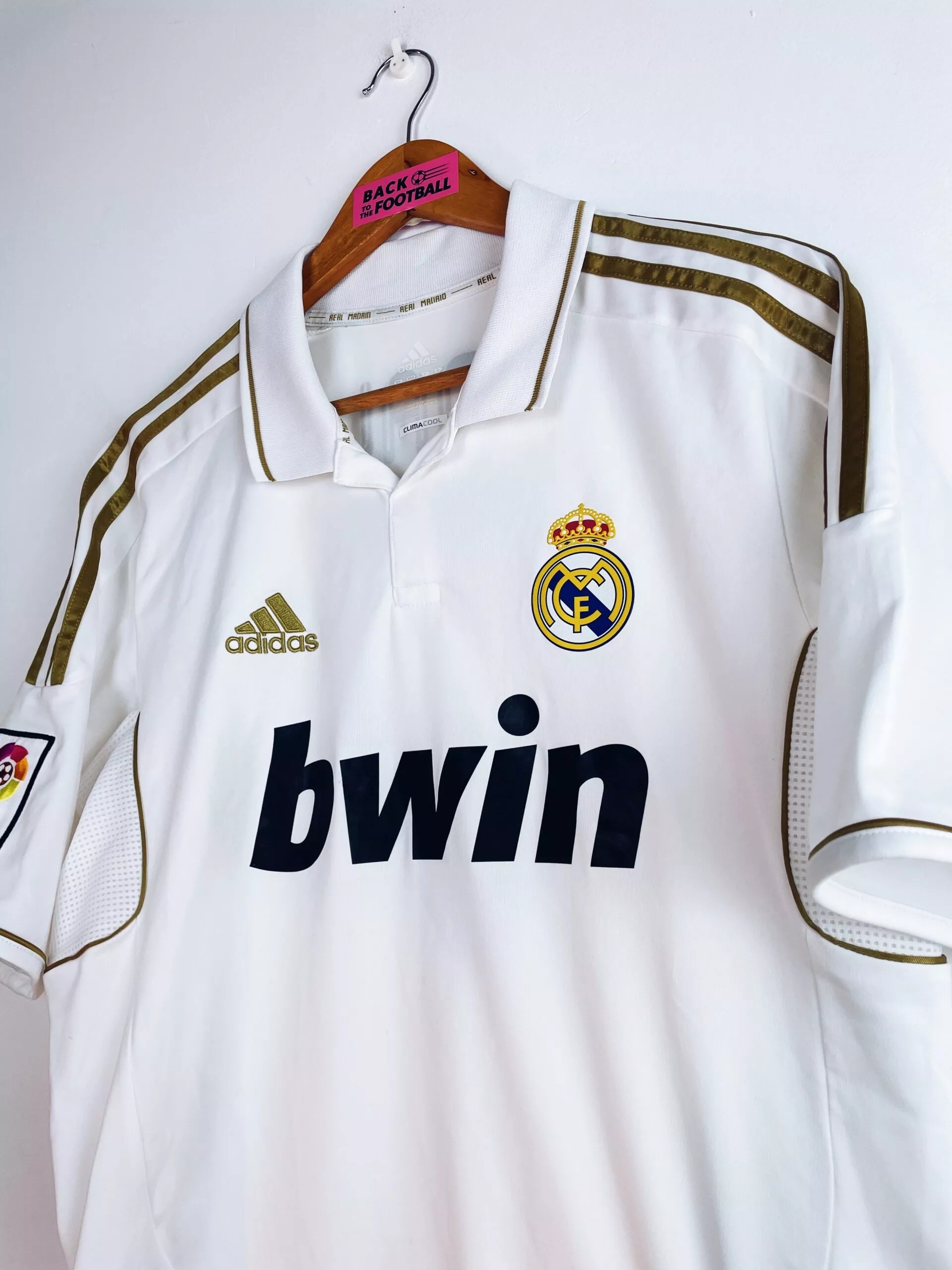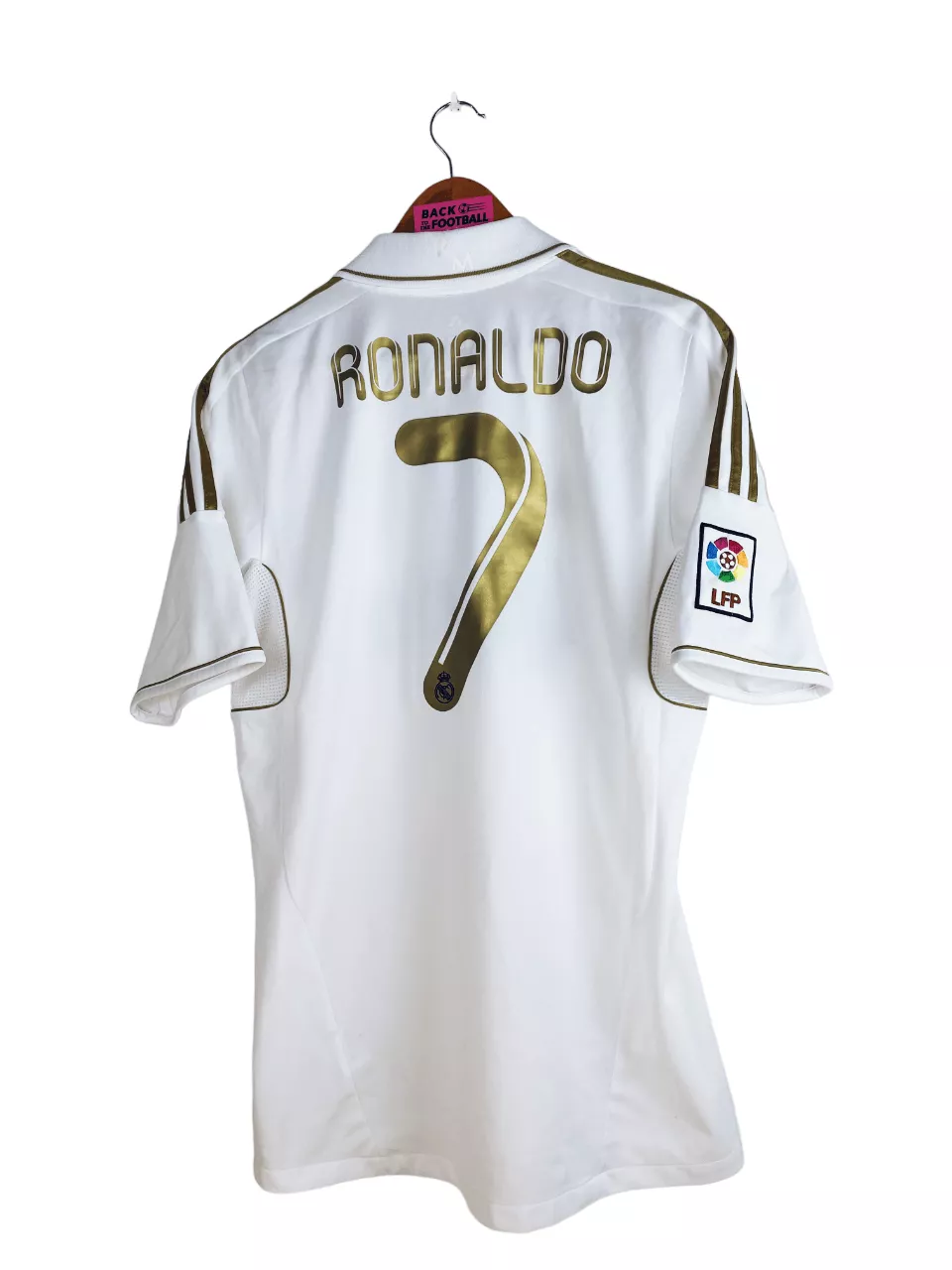 Taille : M Si tu veux plus de détails, tu peux nous contacter par mail ou sur les réseaux 😉 Etat : 7.5/10, très bon état mais l’arrière du col est légèrement jauni, le patch LFP est décoloré et une micro trace dans le dos (voir photos) Le maillot : maillot vintage du Real Madrid 2011/2012 domicile floqué Ronaldo #9. L’écusson est thermocollé, le logo Adidas est brodé, le sponsor Bwin est floqué. CR7 au dos est floqué aussi. Le patch Liga sur la manche est brodé. Très beau maillot rétro du Real Madrid ! Histoire : les Merengues de…
