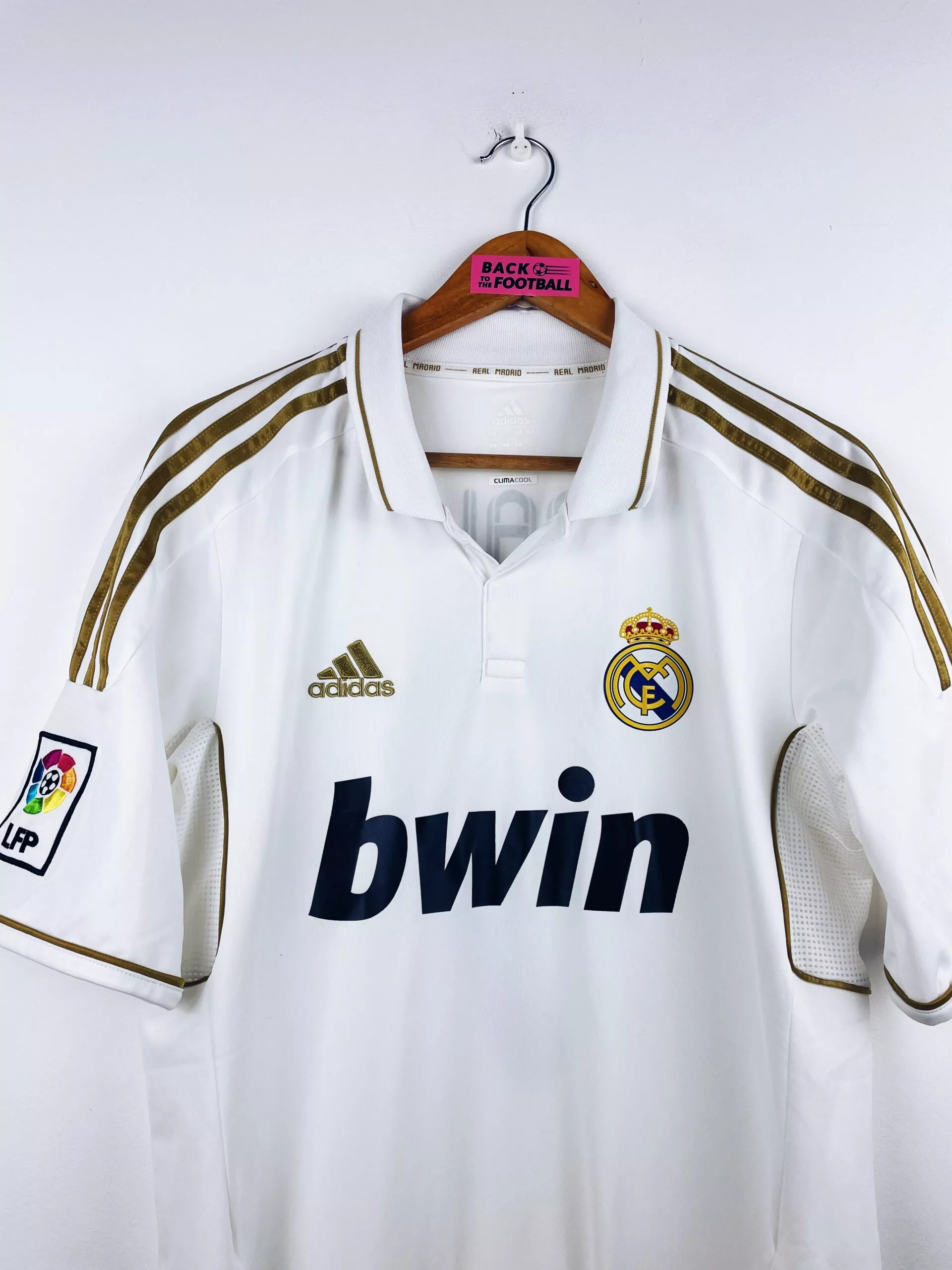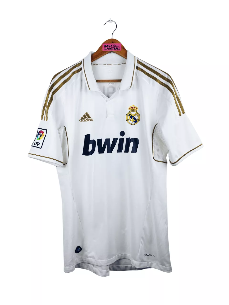 Taille : M Si tu veux plus de détails, tu peux nous contacter par mail ou sur les réseaux 😉 Etat : 8.5/10, excellent état Le maillot : maillot vintage du Real Madrid 2011/2012 domicile floqué Ronaldo #9. L’écusson est thermocollé, le logo Adidas est brodé, le sponsor Bwin est floqué. CR7 au dos est floqué aussi. Le patch Liga sur la manche est brodé. Très beau maillot rétro du Real Madrid ! Histoire : les Merengues de Mourinho remportent la Liga avec 100 points, devant Barcelone. Ils seront éliminés en quart de Copa del Rey contre Barcelone. En Ligue…