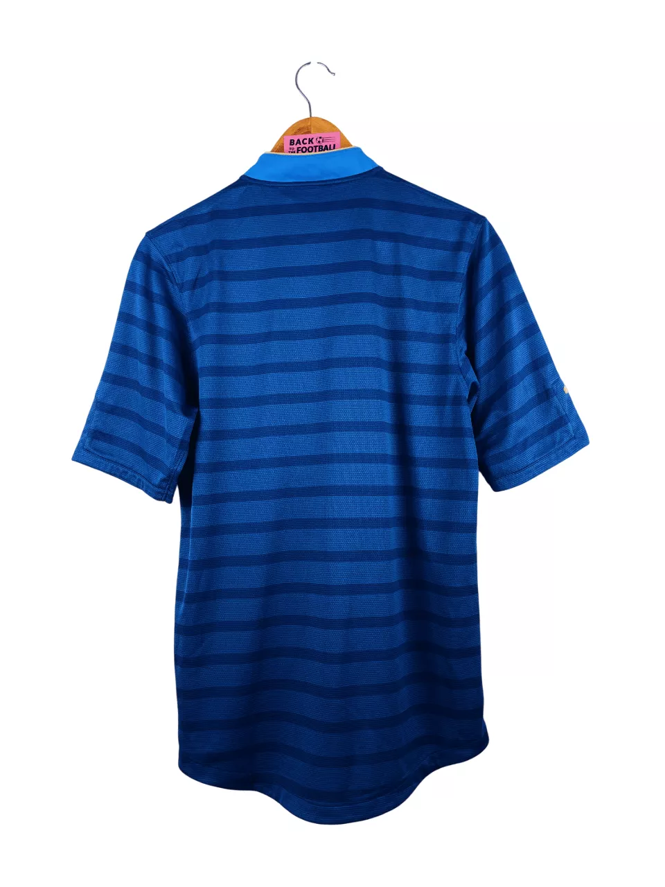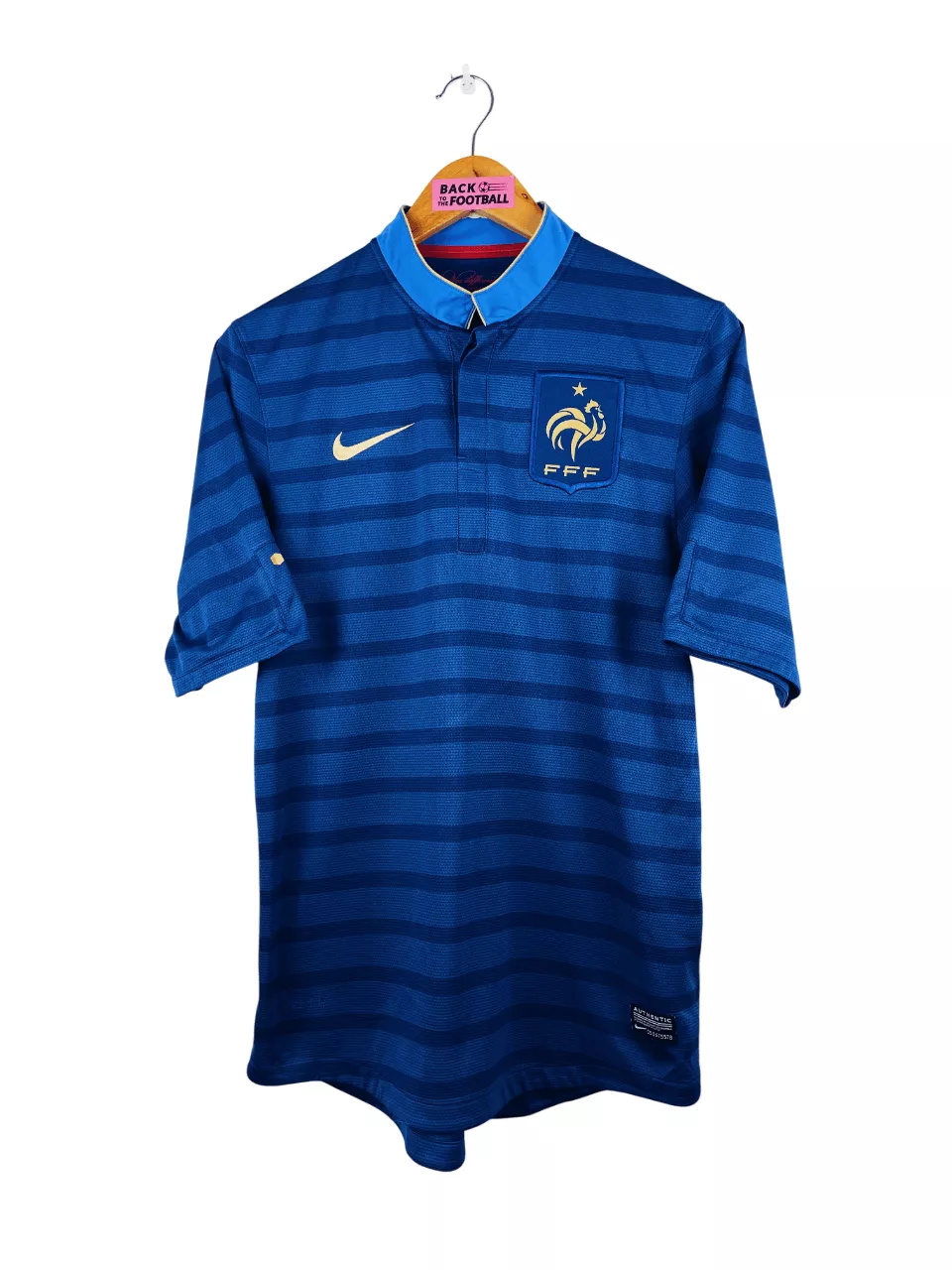 Taille : S Largeur : 46cm (aisselle à aisselle) Longueur : 69cm (base du col au bas) Si tu veux plus de détails, tu peux nous contacter par mail ou sur les réseaux 😉 Etat : 9/10, excellent état Le maillot : maillot vintage domicile de l’équipe de France 2012/2013. L’écusson et le logo Nike sont brodés. L’époque des marinières de Nike chez les Bleus. Très beau maillot rétro de la France ! Histoire : les Bleus sortiront 2èmes de leur poule de l’Euro 2012, derrière l’Angleterre. Ils seront éliminés en quart face à l’Espagne, futur vainqueur du tournoi. Quelques…