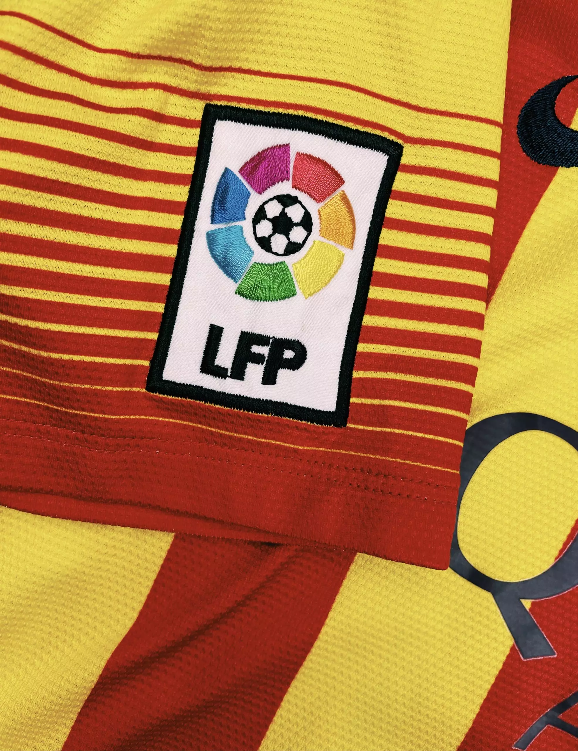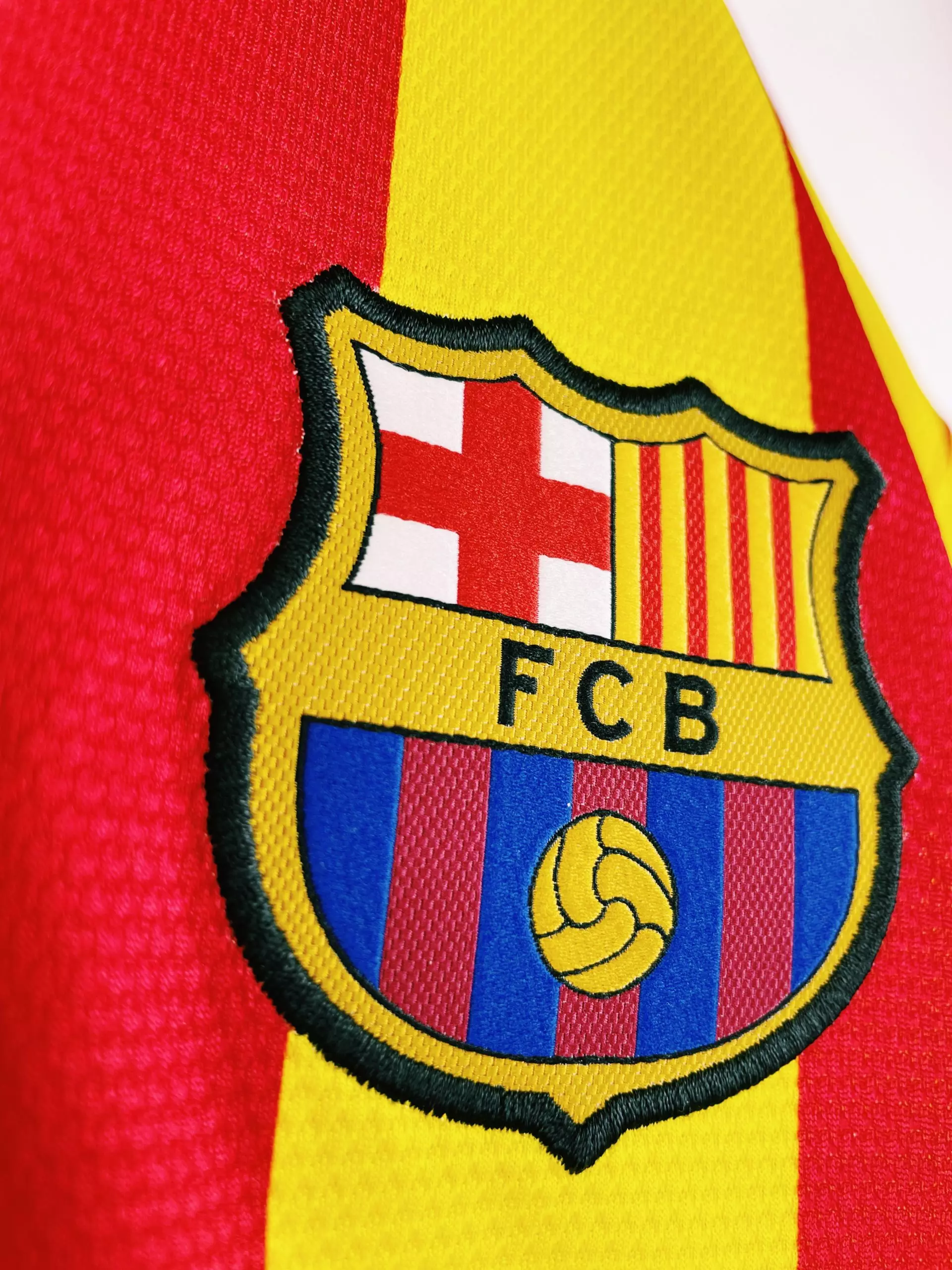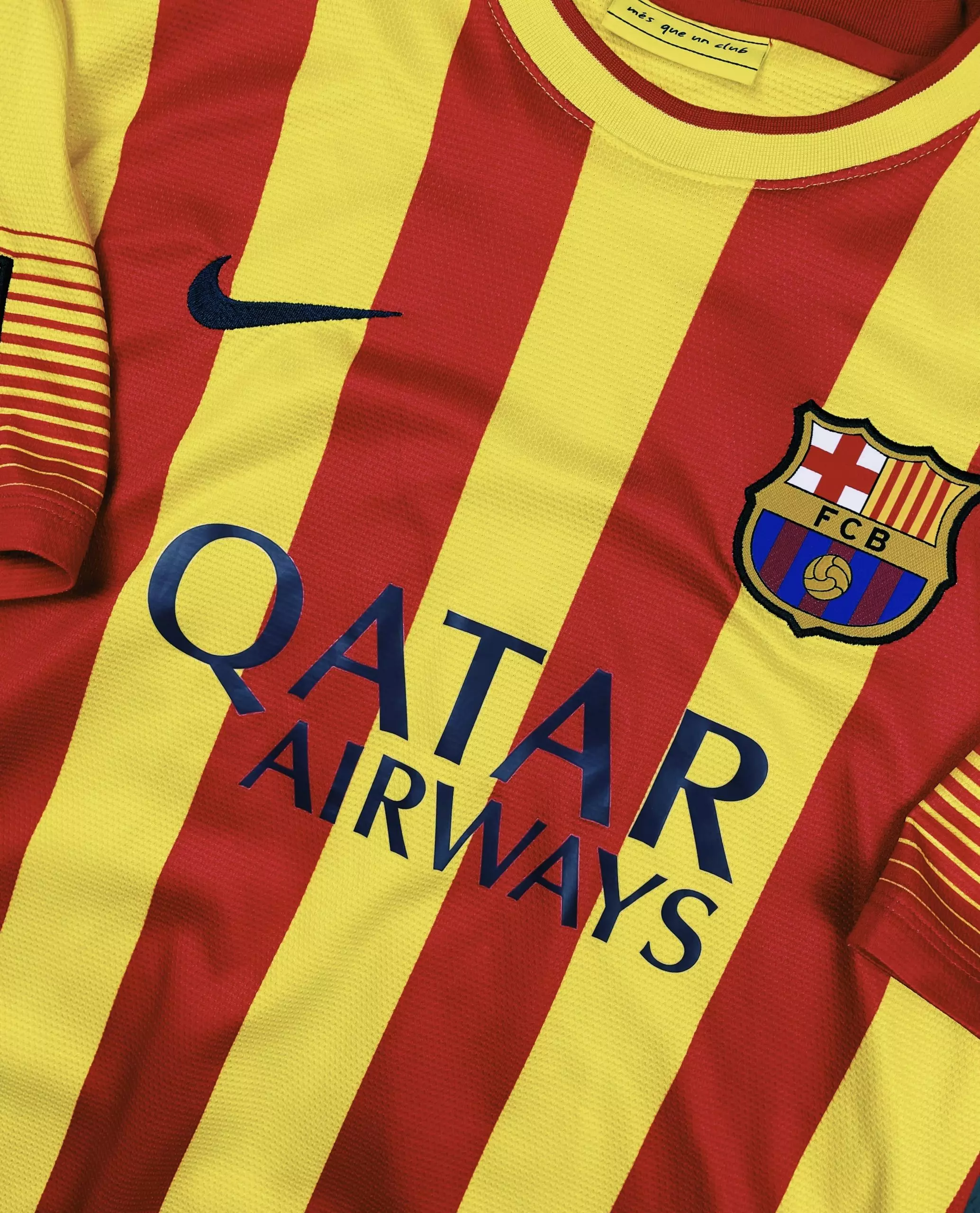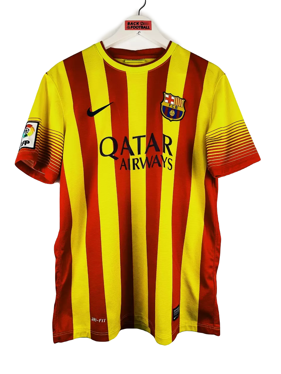 Taille : L Etat : très bon état Le maillot : maillot vintage extérieur du FC Barcelone floqué Messi #10, saison 2013/2014. Le maillot reprend les couleurs de la Catalogne avec les rayures or et rouges. L’écusson, le logo Nike, le patch Liga sont brodés. Les sponsors sont floqués. Histoire : énorme saison pour l’argentin Lionel Messi. Il marquera 41 buts toutes compétitions confondues cette saison, avec une victoire en super coupe d’Espagne et une 2ème place au classement derrière l’Atlético.