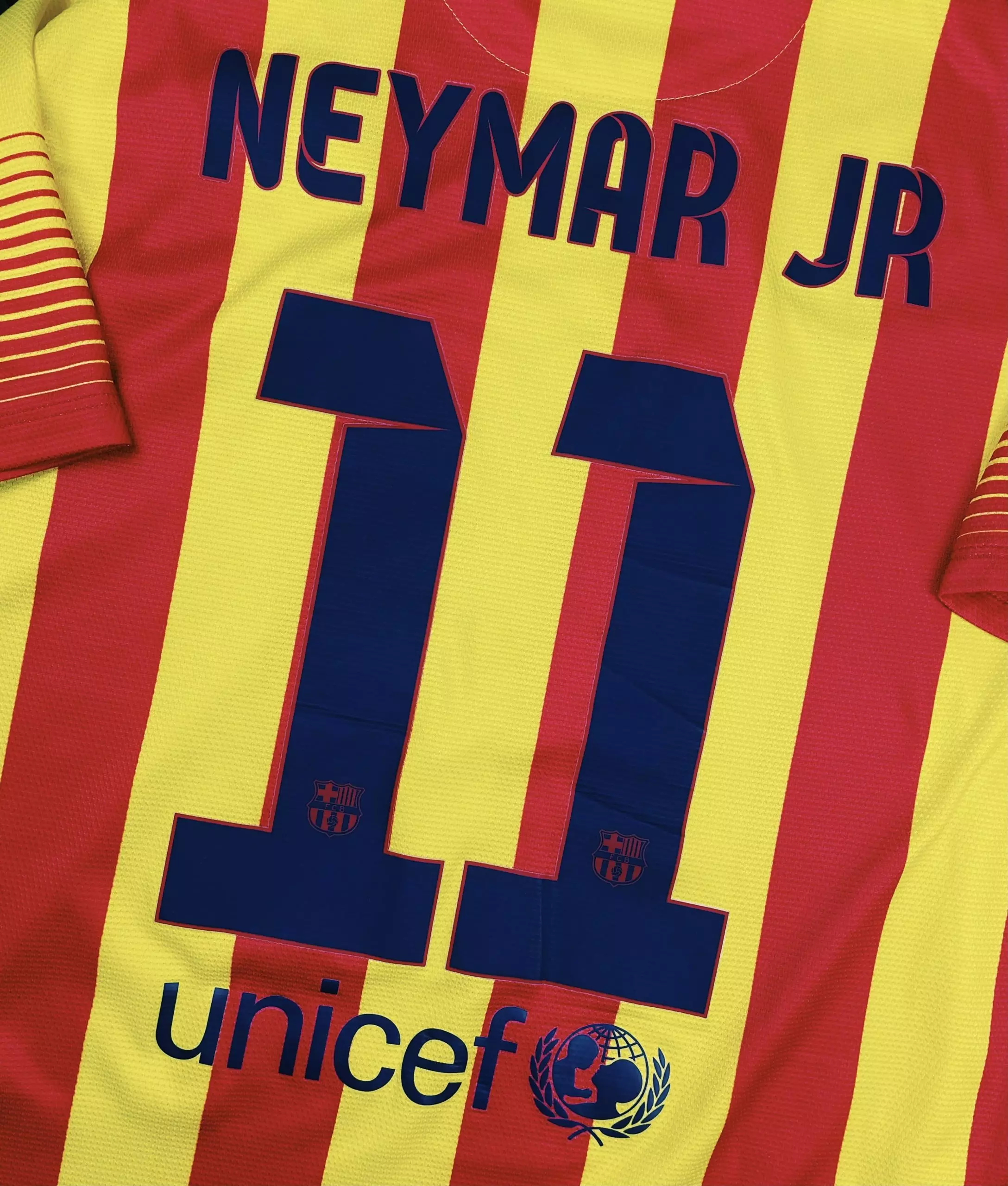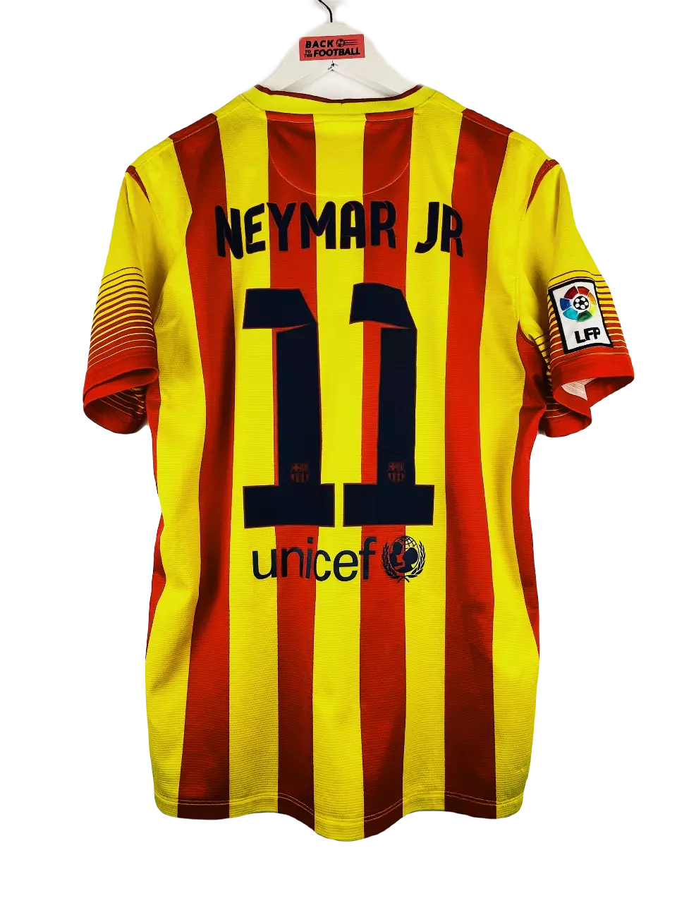 Taille : M Etat : très bon état Le maillot : maillot extérieur du FC Barcelone avec les rayures rouges et or de la Catalogne. Le logo de Nike est brodé comme l’écusson du club. Sponsor Qatar Airways et Unicef dans le dos. Flocage #11 du brésilien Neymar. Histoire : 1ère saison au club pour Neymar avec 15 buts toutes compétitions confondues. A la clé, une victoire en supercoupe d’Espagne et une deuxième place en championnat derrière l’Atlético. Effectif de super stars cette saison avec notamment : Puyol, Piqué, Alves, Fàbregas, Xavi, Iniesta, Messi, Sánchez… l’âge d’or de Barcelone ❤️💛