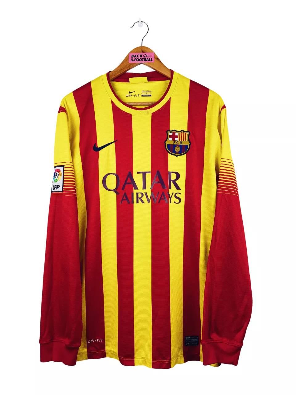 Taille : L Largeur : 54cm (aisselle à aisselle) Longueur : 73cm (base du col au bas) Si tu veux plus de détails, tu peux nous contacter par mail ou sur les réseaux 😉 Etat : 8/10, très bon état, micros traces en haut, quelques fils tirés (voir photos) Le maillot : maillot vintage extérieur du FC Barcelone 2013/2015 manches longues floqué Neymar #11. Le maillot reprend les couleurs de la Catalogne avec les rayures or et rouges. L’écusson, le logo Nike, le patch Liga sont brodés. Les sponsors et Neymar #11 au dos sont floqués. Très beau maillot rétro…