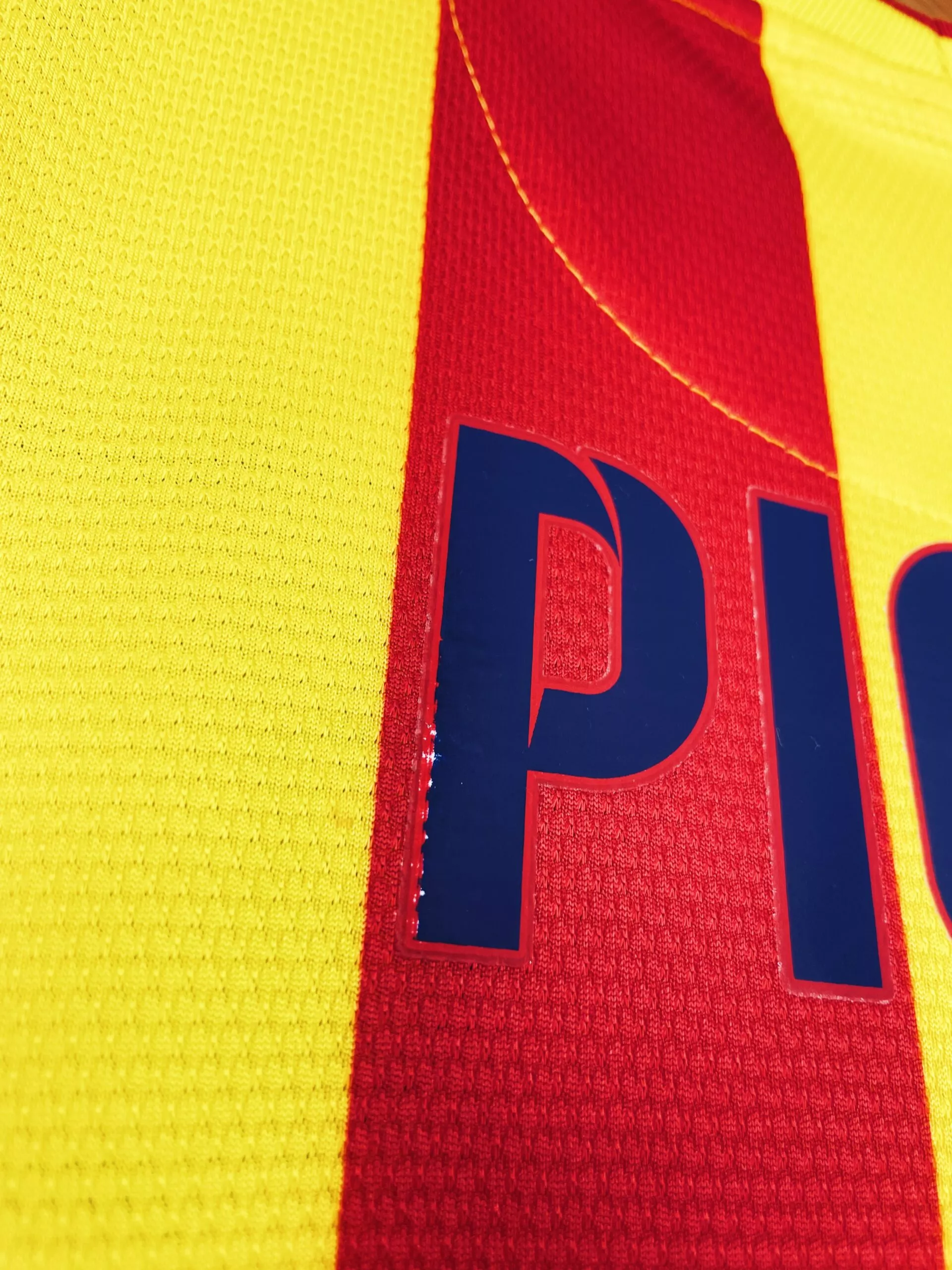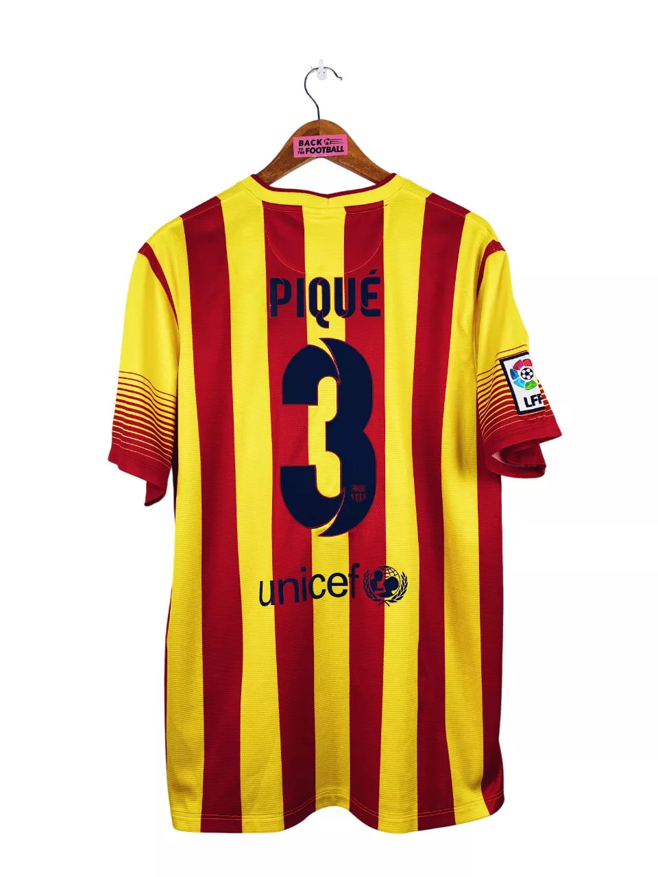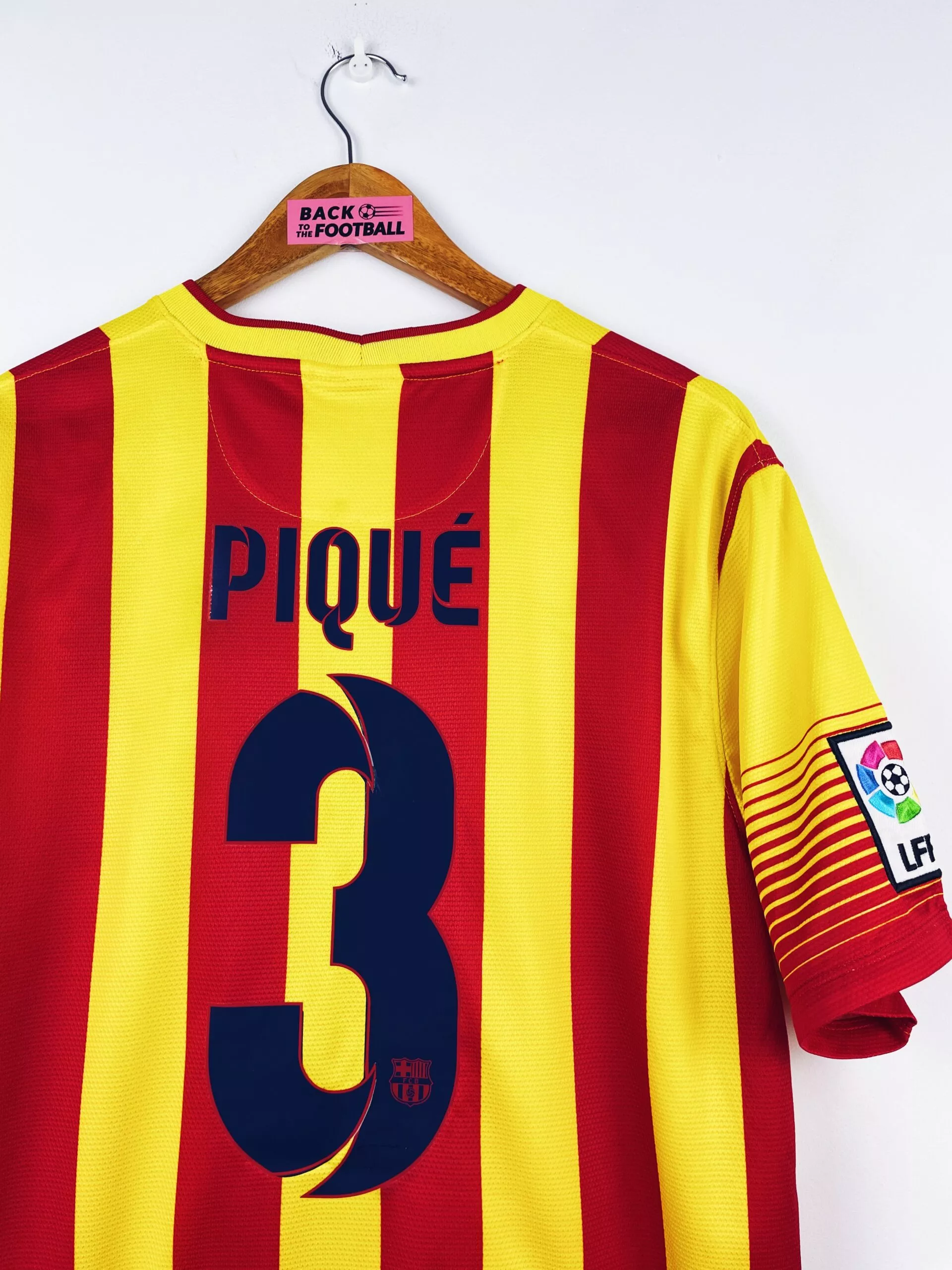 Taille : L Largeur : 55cm (aisselle à aisselle) Longueur : 75cm (base du col au bas) Si tu veux plus de détails, tu peux nous contacter par mail ou sur les réseaux 😉 Etat : 8.5/10, excellent état hormis 2 minis défauts sur le flocage Piqué (voir photos) Le maillot : maillot vintage du FC Barcelone 2013/2015 extérieur floqué Piqué #3. Le maillot reprend les couleurs de la Catalogne avec les rayures or et rouges. L’écusson, le logo Nike, le patch Liga sont brodés. Les sponsors et Piqué au dos sont floqués. Très beau maillot rétro de Barcelone !…