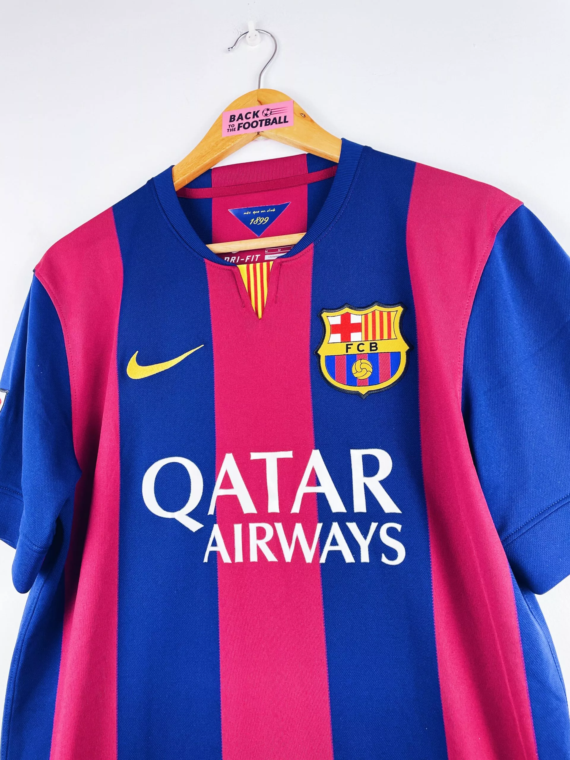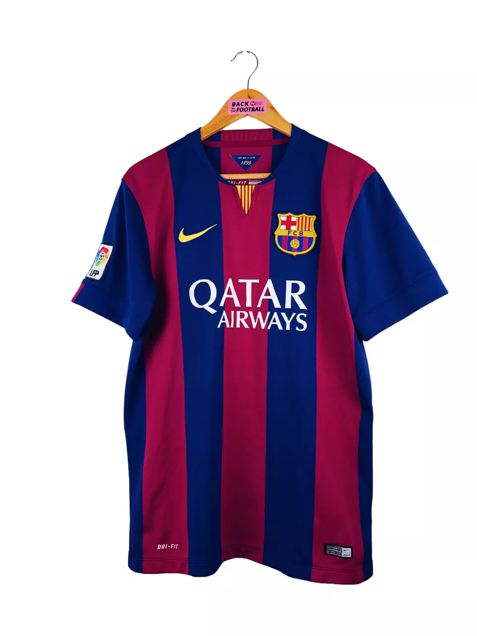 Taille : M Si tu veux plus de détails, tu peux nous contacter par mail ou sur les réseaux 😉 Etat : 8.5/10, excellent état Le maillot : maillot vintage domicile du FC Barcelone 2014/2015 floqué Suarez #9. L’écusson et le logo Nike sont brodés, le sponsor est floqué, Suarez #9 au dos aussi. Très beau maillot rétro de Barcelone ! Histoire : énorme saison des Blaugranas de Luis Enrique qui font le triplé championnat – Coupe du Roi – Ligue des Champions. Luis Suarez marquera 25 buts et fera 21 passes décisives. Quelques joueurs : Messi, Neymar, Iniesta, Rakitić,…