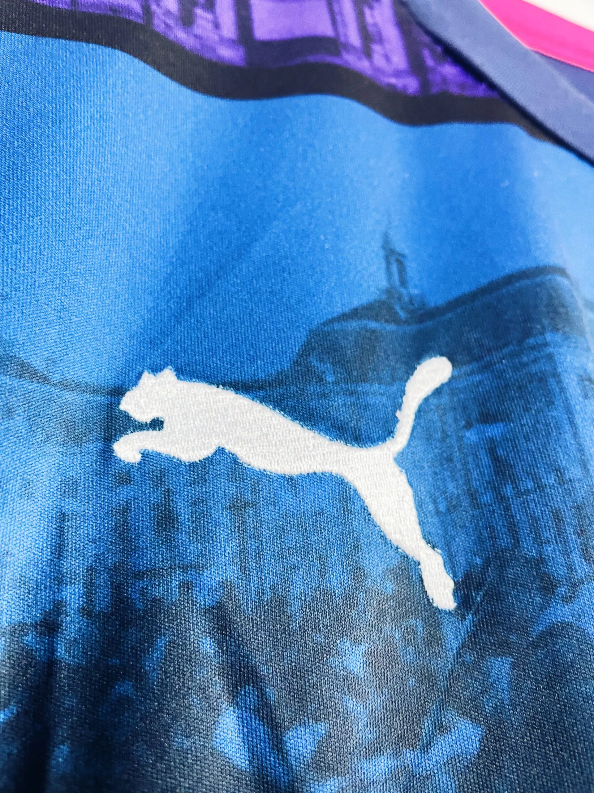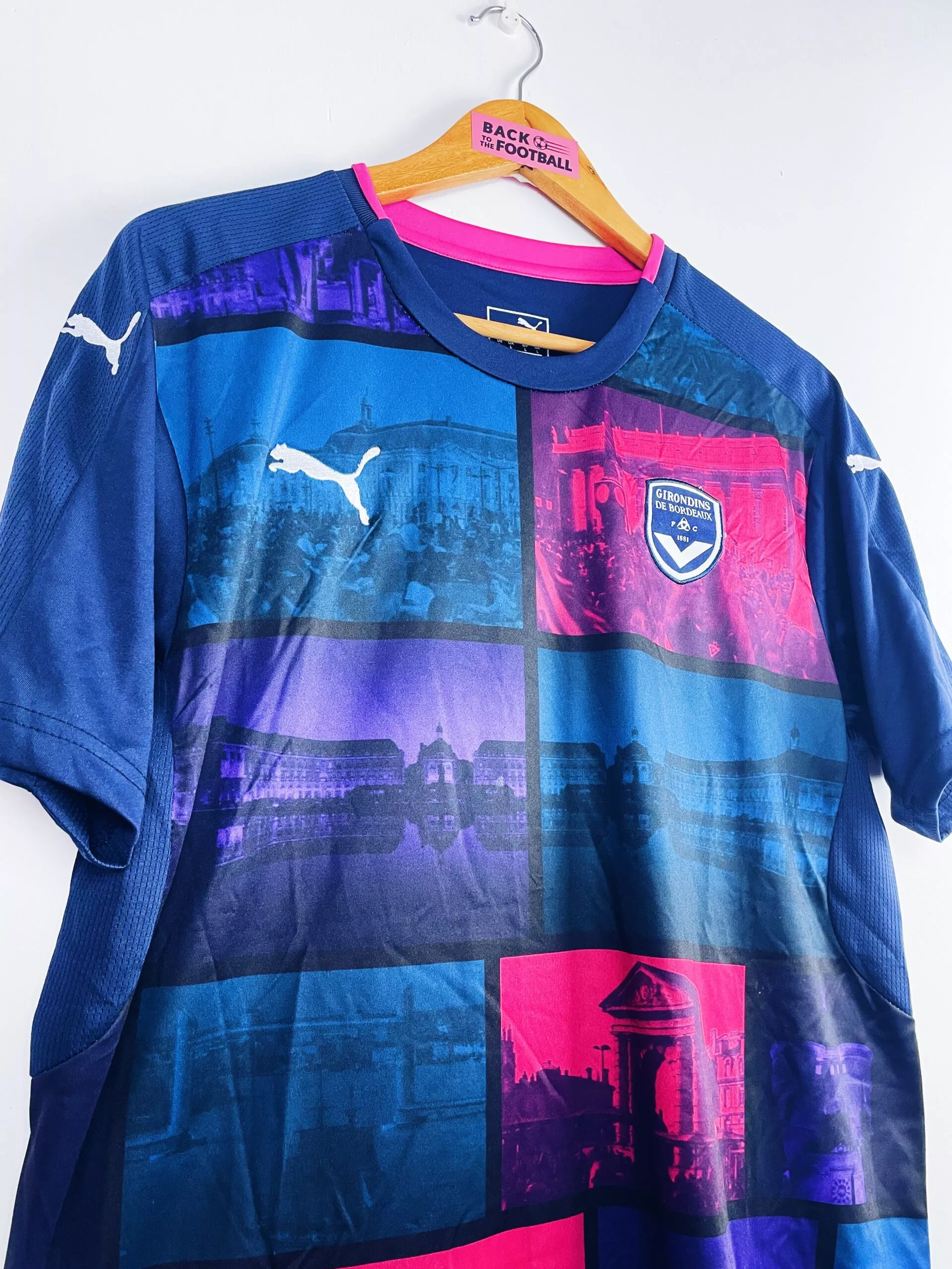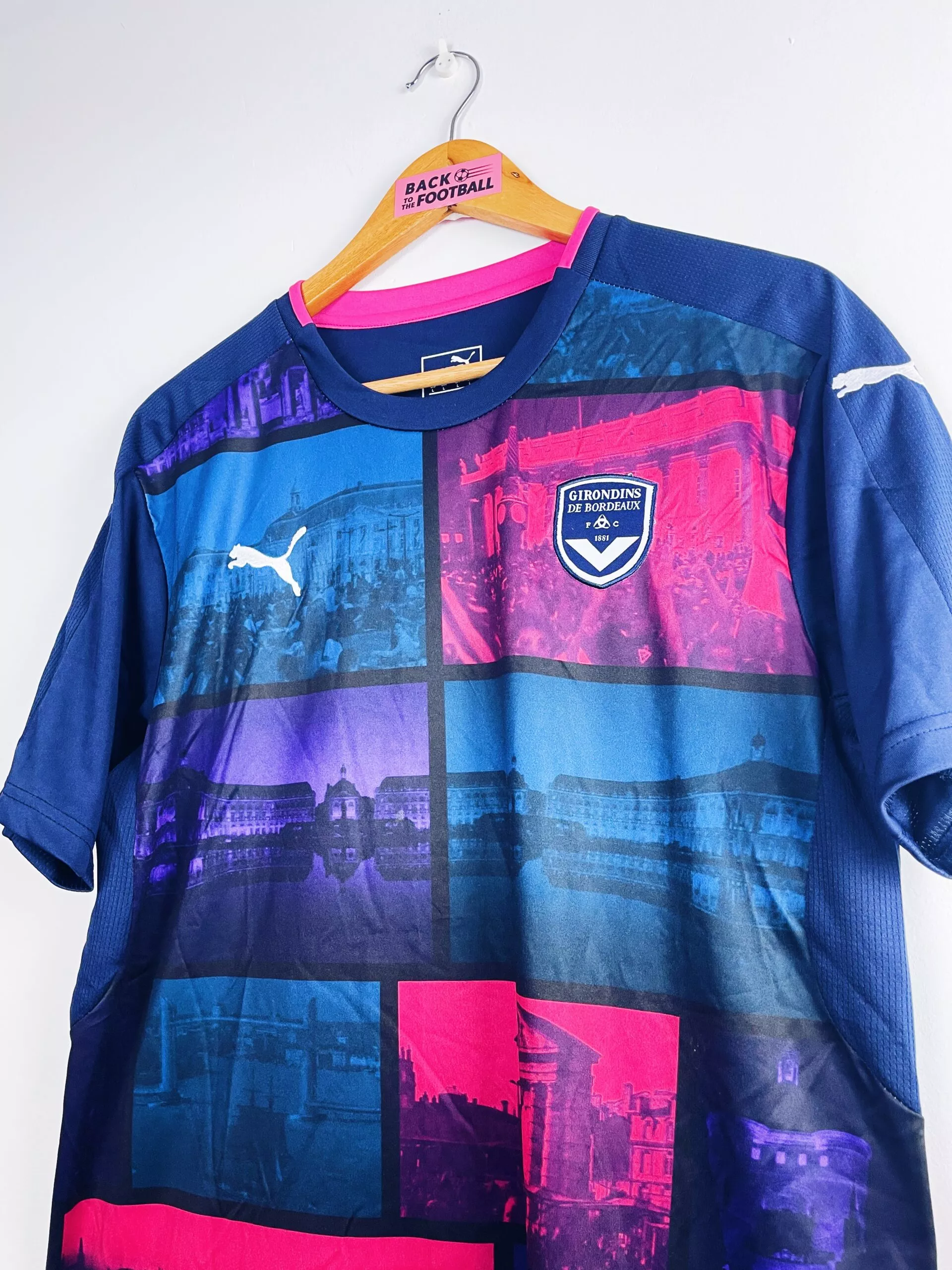 Taille : L Etat : 9/10, excellent état Le maillot : maillot vintage third des Girondins de Bordeaux 2016/2017. L’écusson et le logo Puma sont brodés. Pas de sponsor sur ce maillot. On peut voir plusieurs endroits bien connus des Bordelais : place de la Bourse, les Quinconces, le Grand Théatre, le pont Chaban… Très beau maillot rétro des Girondins de Bordeaux ! Histoire : les Girondins de Jocelyn Gourvennec terminent 6èmes de Ligue 1. Ils seront éliminés en quart en Coupe de France et en demi en Coupe de la Ligue. Laborde sera le meilleur buteur avec 13 réalisations.…