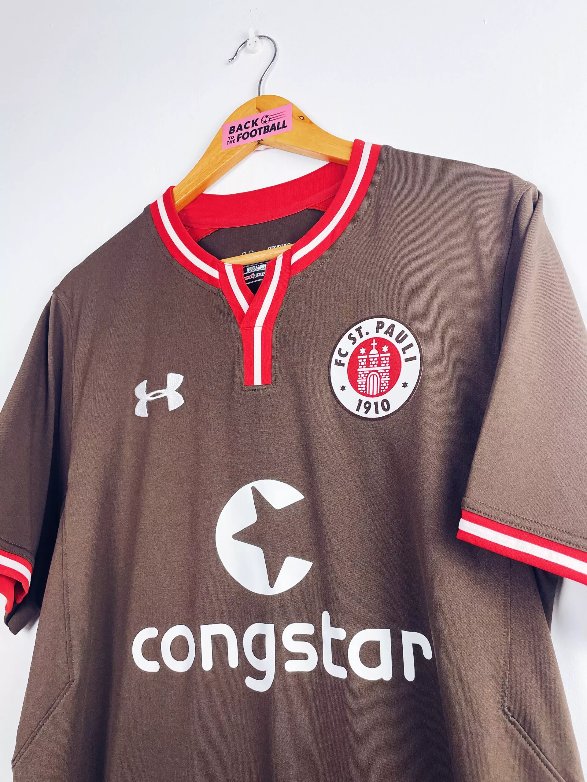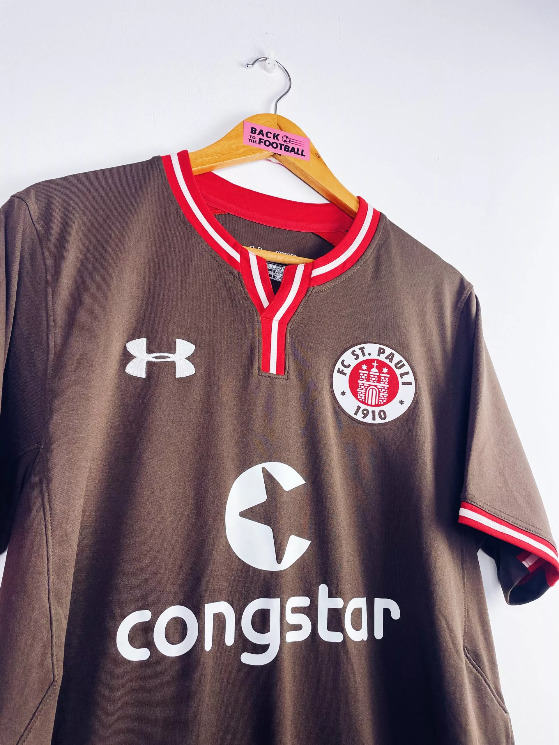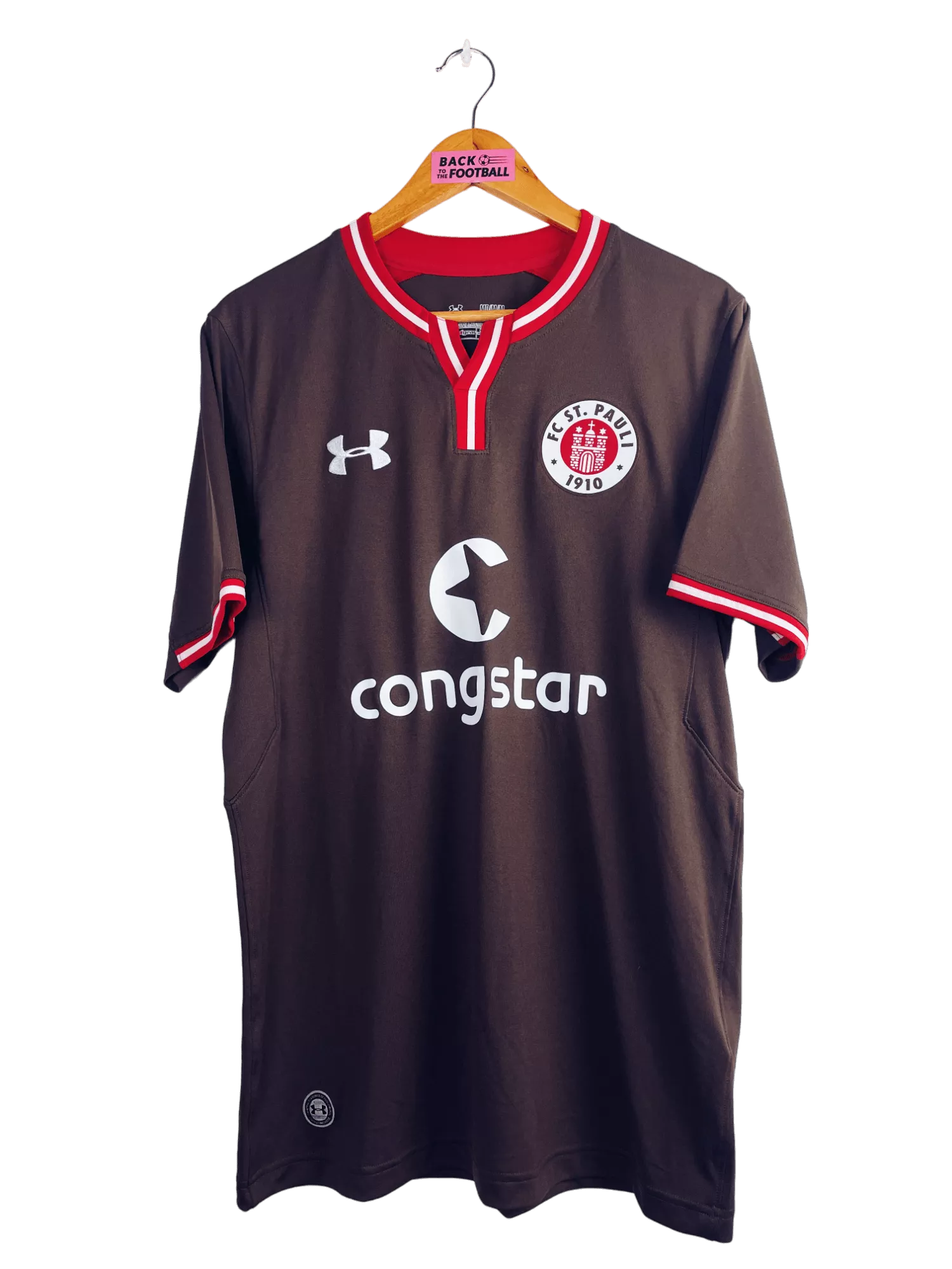 Taille : M Etat : 9/10, excellent état Le maillot : maillot vintage domicile de St Pauli 2016/2017. L’écusson et le logo Under Armour sont brodés, le sponsor est floqué. Très beau maillot rétro de St Pauli ! Histoire : le St. Pauli termine à la 7ème place de Bundesliga 2, après avoir été lanterne rouge une bonne partie de la moitié de saison. Les joueurs s’inclinent au 2ème tour de Coupe d’Allemagne contre le Herta Berlin.