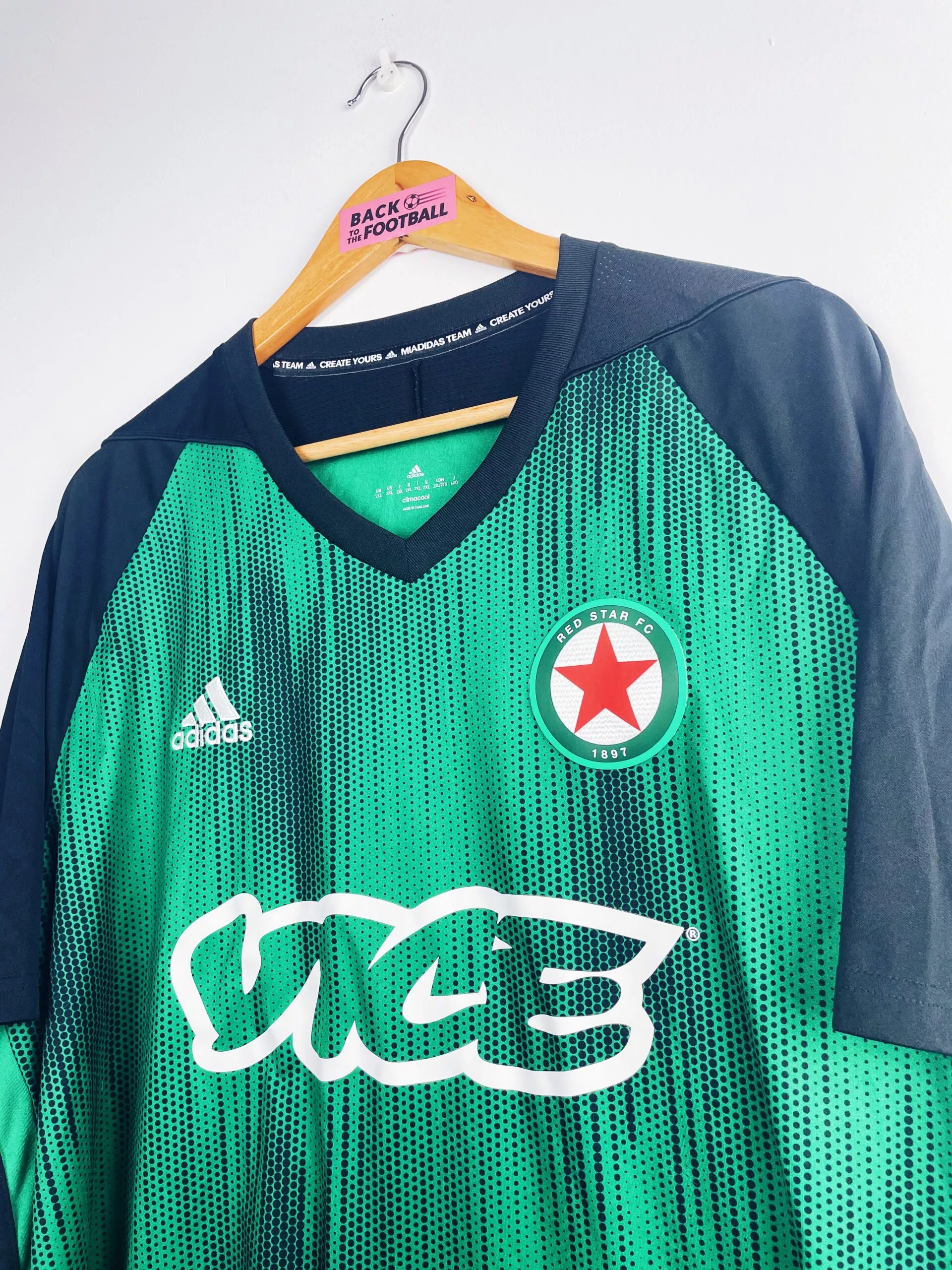 Taille : XXL Etat : 8/10, très bon état Le maillot : maillot domicile du Red Star 2019/2020. L’écusson est en feutrine, le logo Adidas brodé et le sponsor Vice floqué. Très beau maillot du Red Star ! Histoire : les Audoniens terminent à la 5ème place de National, à 5 points de la montée en Ligue 2. Ils iront jusqu’en seizièmes de finale de Coupe de France mais seront battus par l’OGC Nice.