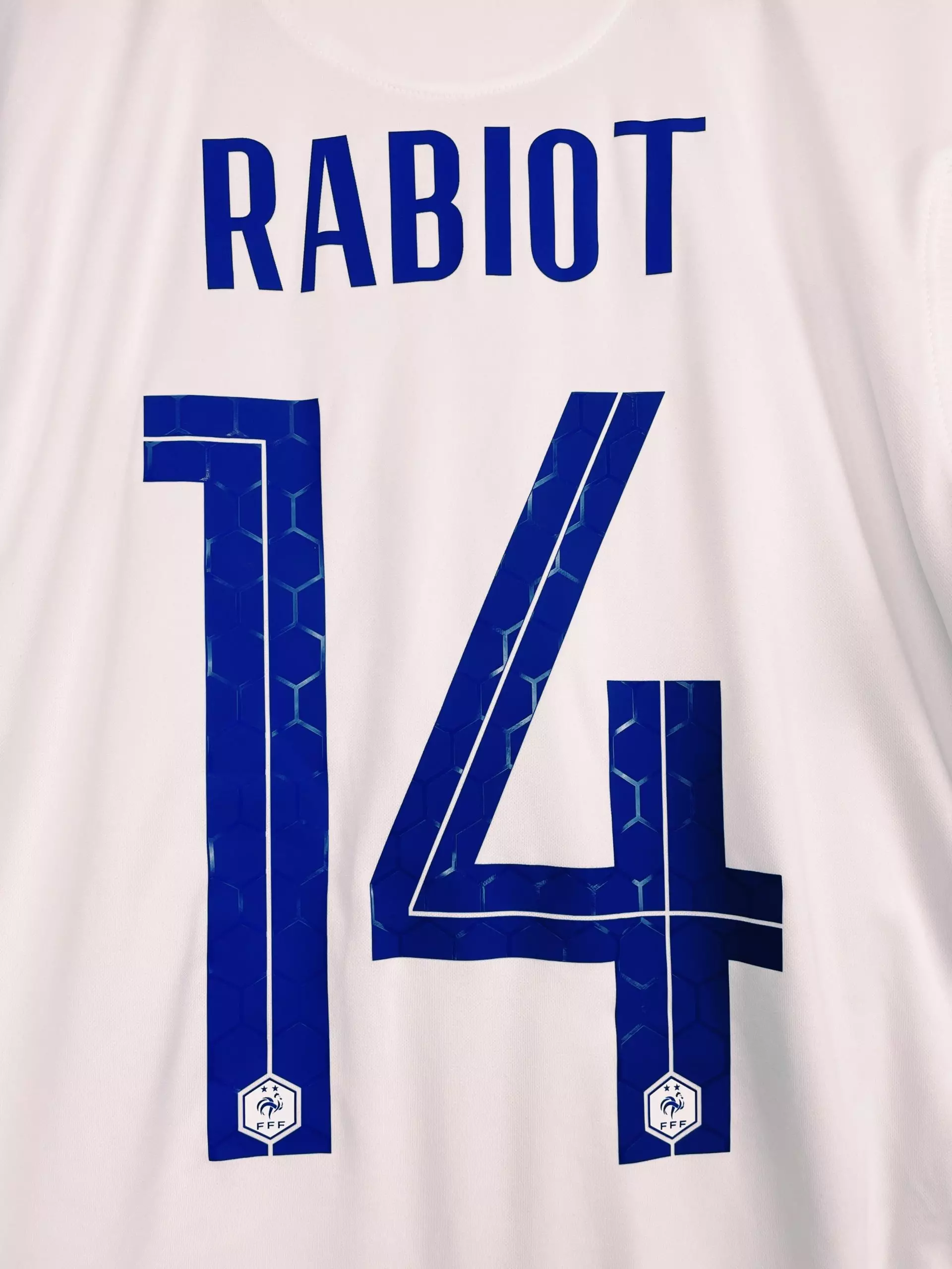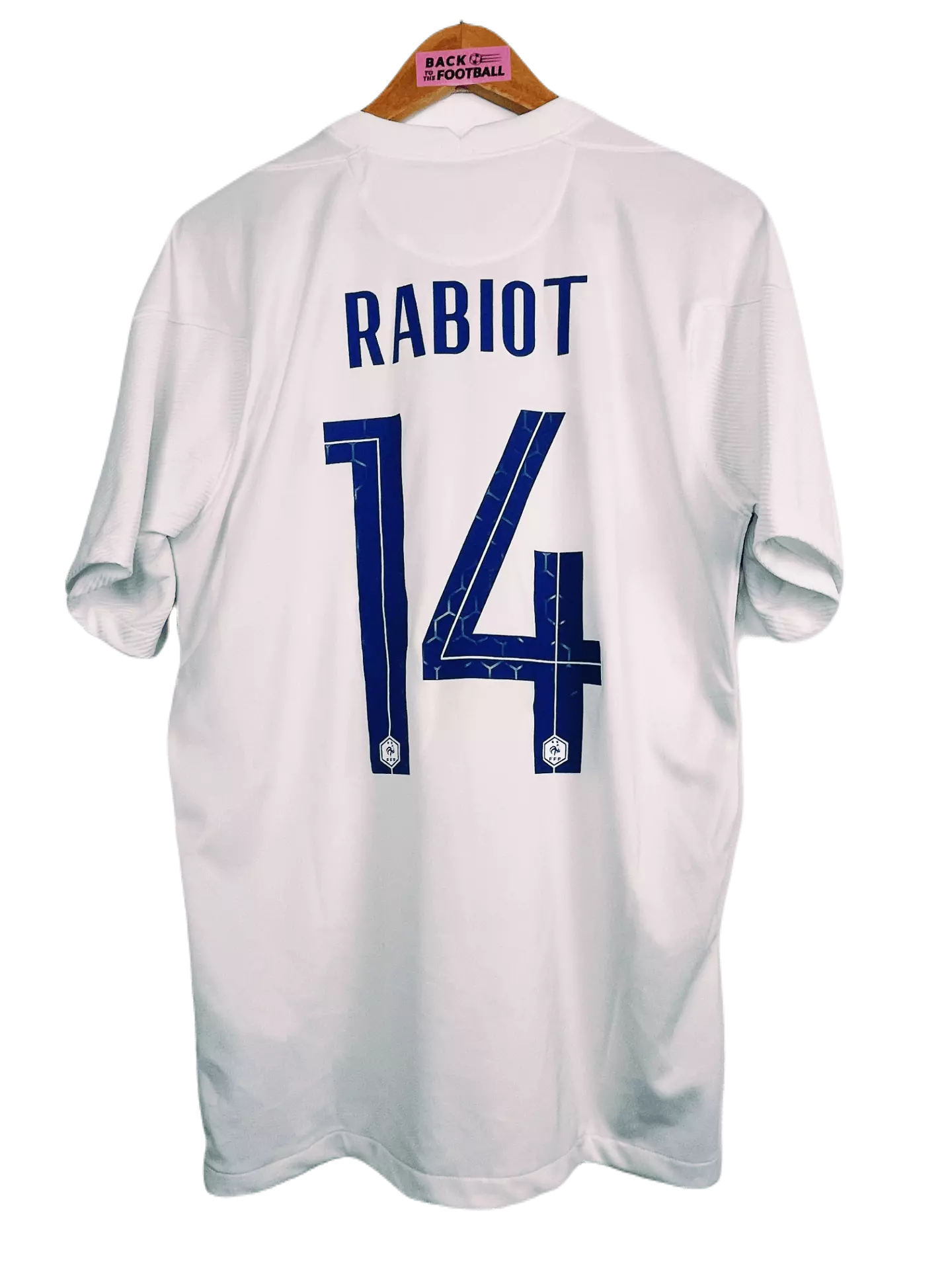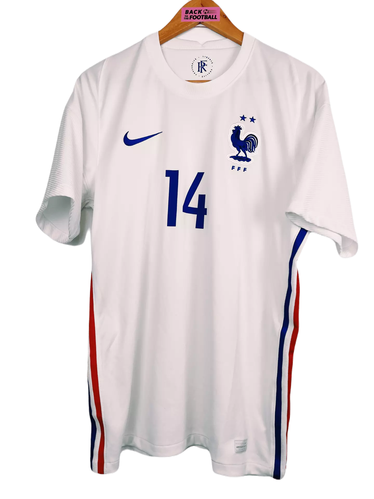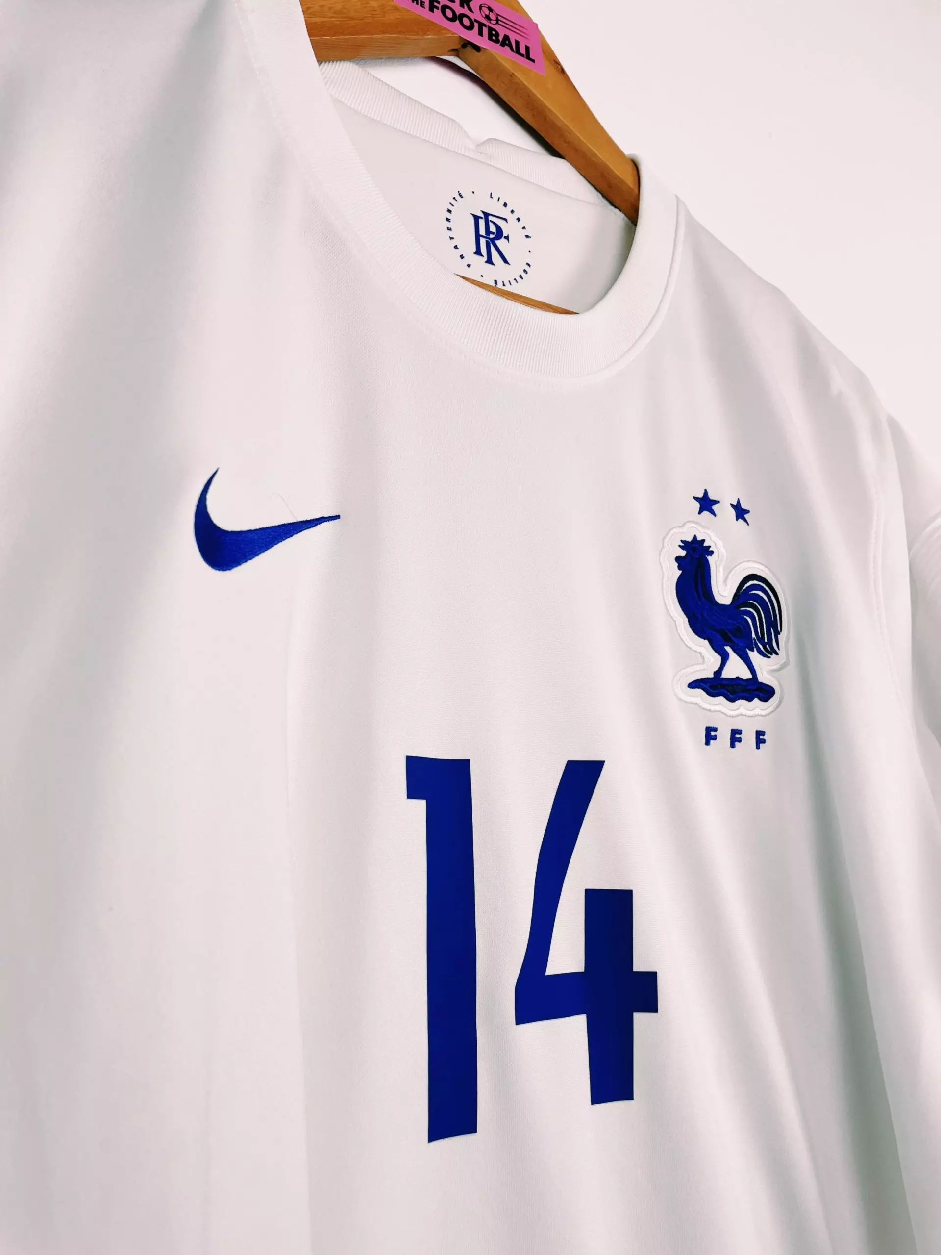 Taille : M Etat : 9/10, très bon état Le maillot : maillot extérieur de l’équipe de France 2020 floqué Rabiot #14. Le coq avec les 2 étoiles est brodé, le logo Nike aussi. Histoire : la France terminera à la première place de son groupe de Ligue des Nations, devant le Portugal, la Croatie et la Suède avec 5 victoires et 1 seul nul. En demi-finale, les bleus éliminent la Belgique dans un match énorme qui se termine sur le score de 3-2. En finale, les français battent l’Espagne 2 à 1.