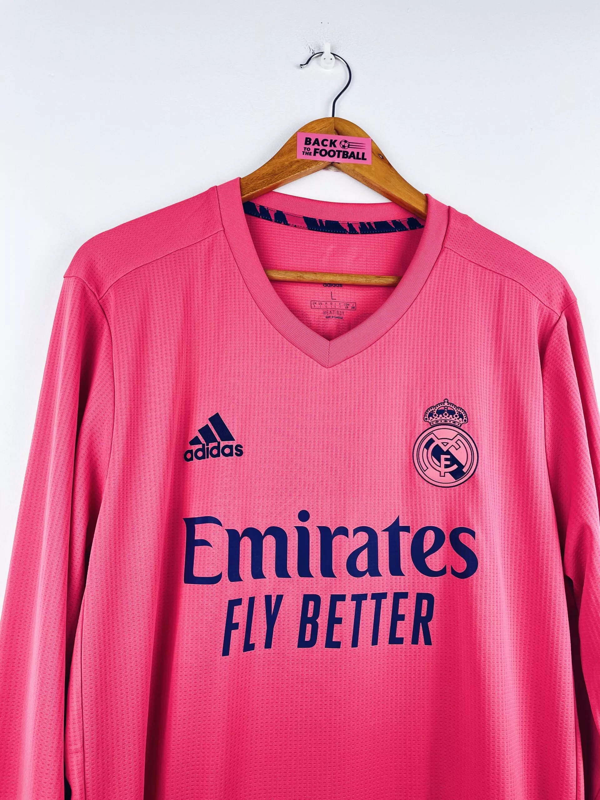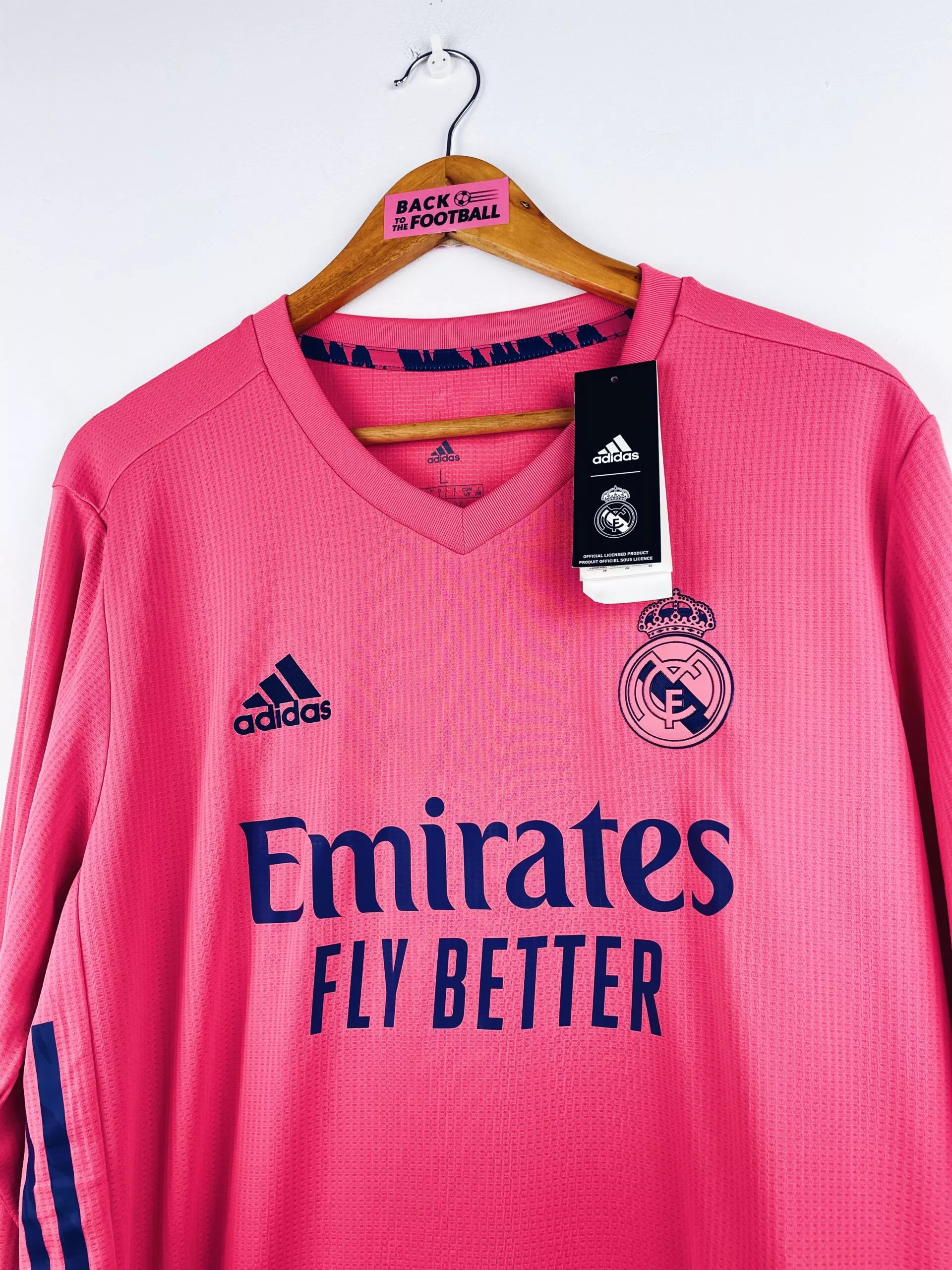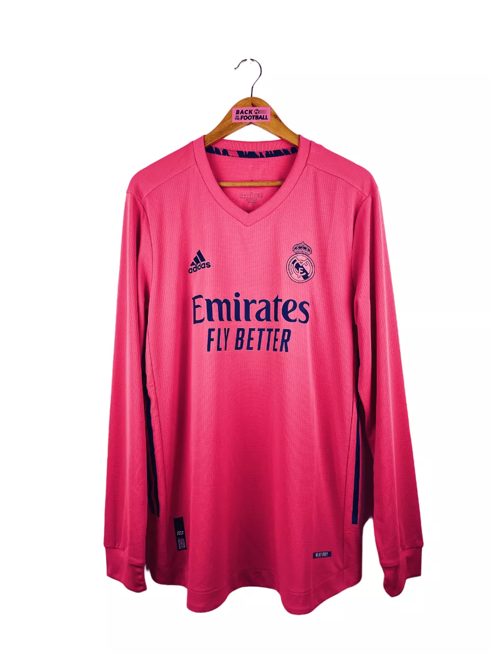 Taille : L Si tu veux plus de détails, tu peux nous contacter par mail ou sur les réseaux 😉 Etat : neuf avec étiquette (BNWT) Le maillot : maillot vintage extérieur du Real Madrid 2020/2021 manches longues floqué Kroos #8. L’écusson et le logo Adidas sont thermocollés, le sponsor Emirates et Kroos au dos sont floqués. Très beau maillot rétro du Real Madrid ! Histoire : saison blanche pour le Real de Zidane avec une 2ème place en Liga, une élimination en demi de Ligue des Champions contre Chelsea. Kroos joue 42 matchs pour 3 buts et 12 passes…