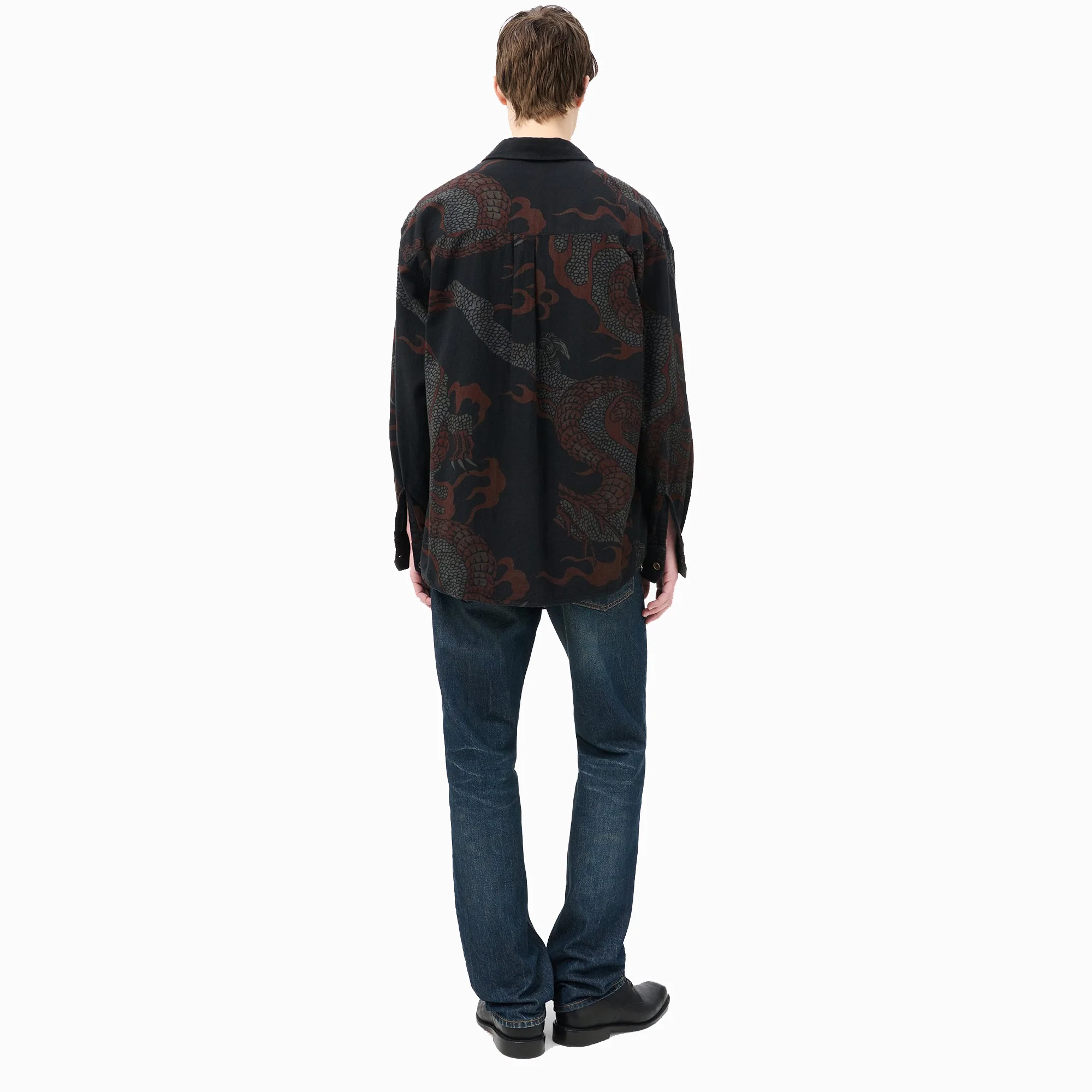 Confectionnée dans un tissu portugais en coton biologique, la chemise Above pour homme présente une coupe légèrement oversize. Elle se distingue par son imprimé serpent abstrait, ses boutons nacrés, son ourlet arrondi et ses poignets biseautés.