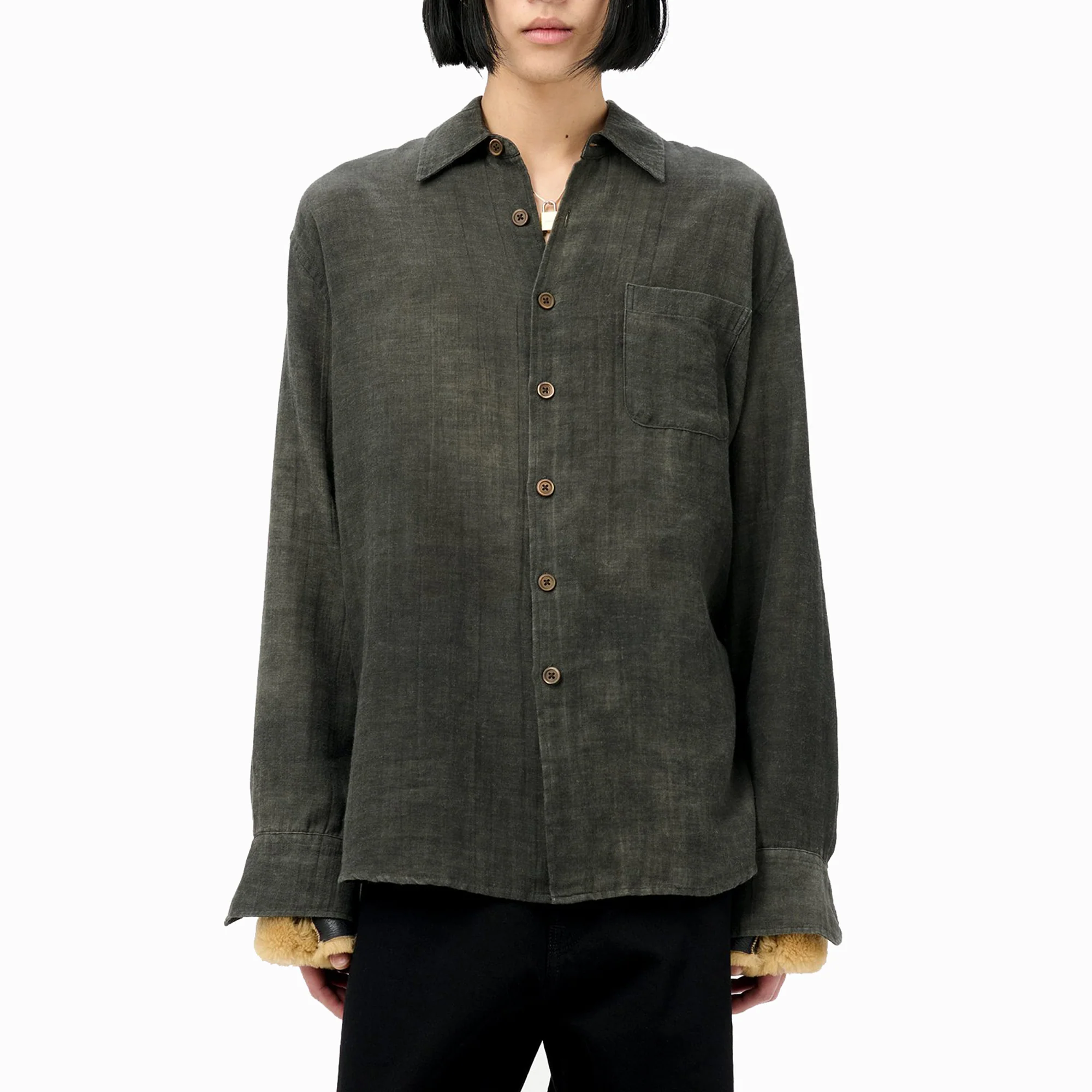 Confectionnée dans un tissu italien mêlant coton et laine, la chemise Above pour homme présente une coupe légèrement oversize. Elle est dotée d’une poche poitrine unique, de boutons en nacre, d’un ourlet arrondi et de poignets biseautés