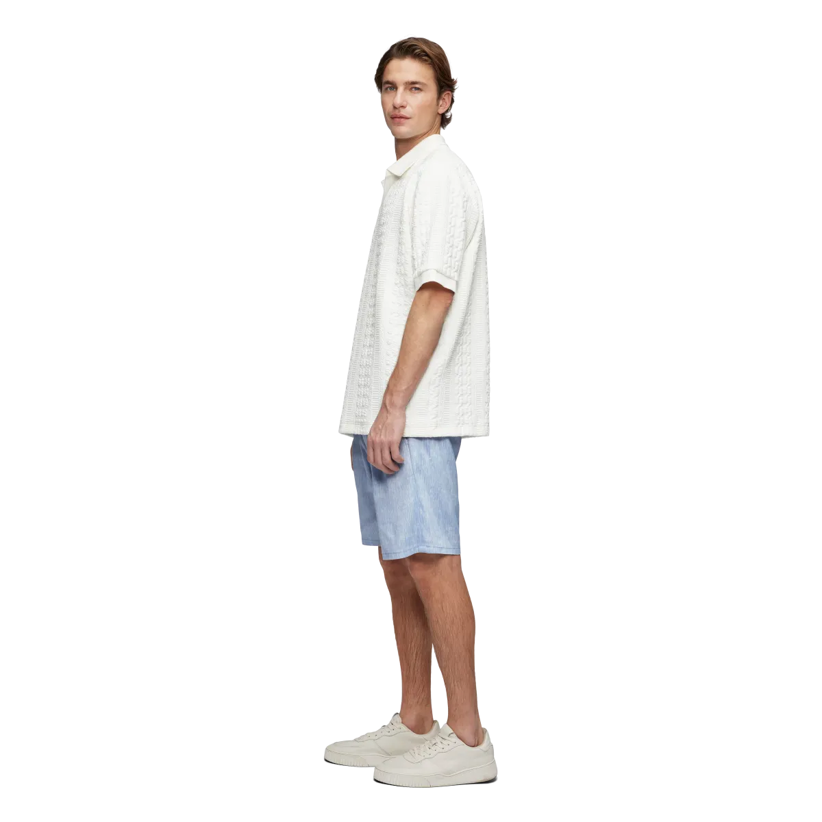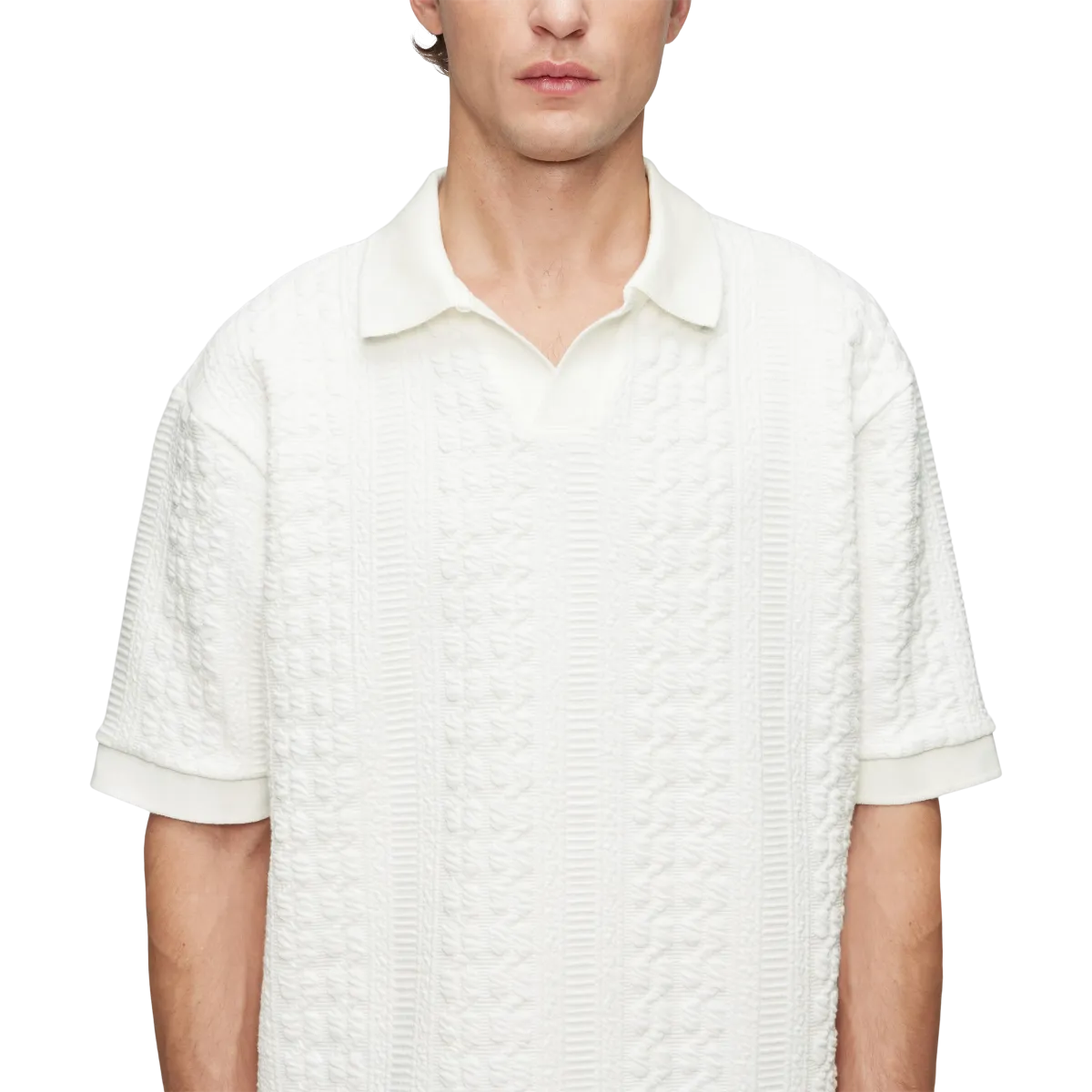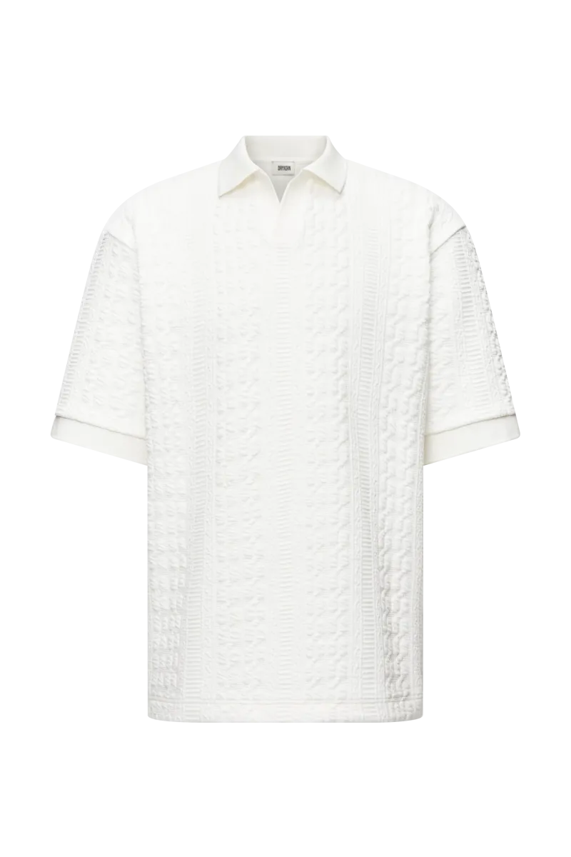 Ce polo présente une coupe relaxed fit, parfaite pour un confort optimal tout au long de la journée. Sa longueur classique et ses manches courtes en font une pièce polyvalente, facile à associer avec divers types de pantalons. Le col en V montant apporte une touche d’élégance supplémentaire.