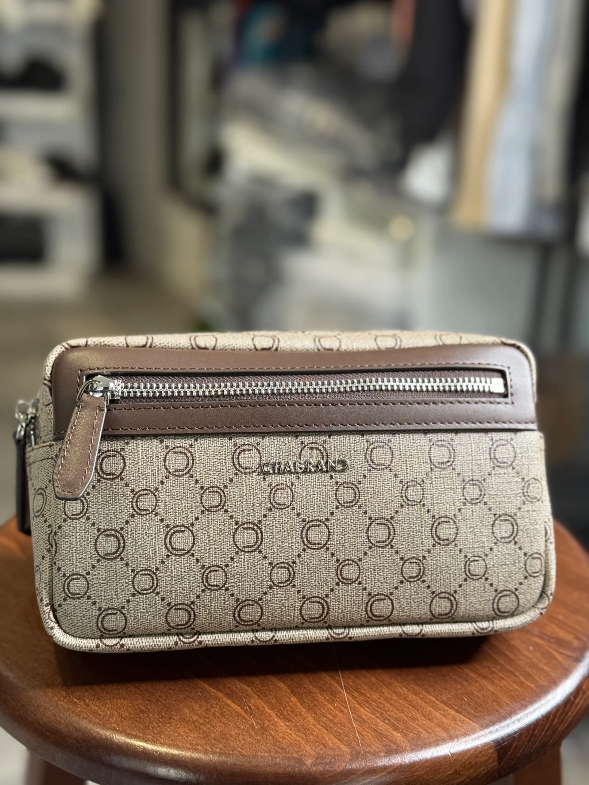 Banane Chabrand de couleur beige avec motifs « C » de couleur marron de matière cuir synthétique Notre boutique est à Lyon Villeurbanne LES CINQ FRÈRES.
