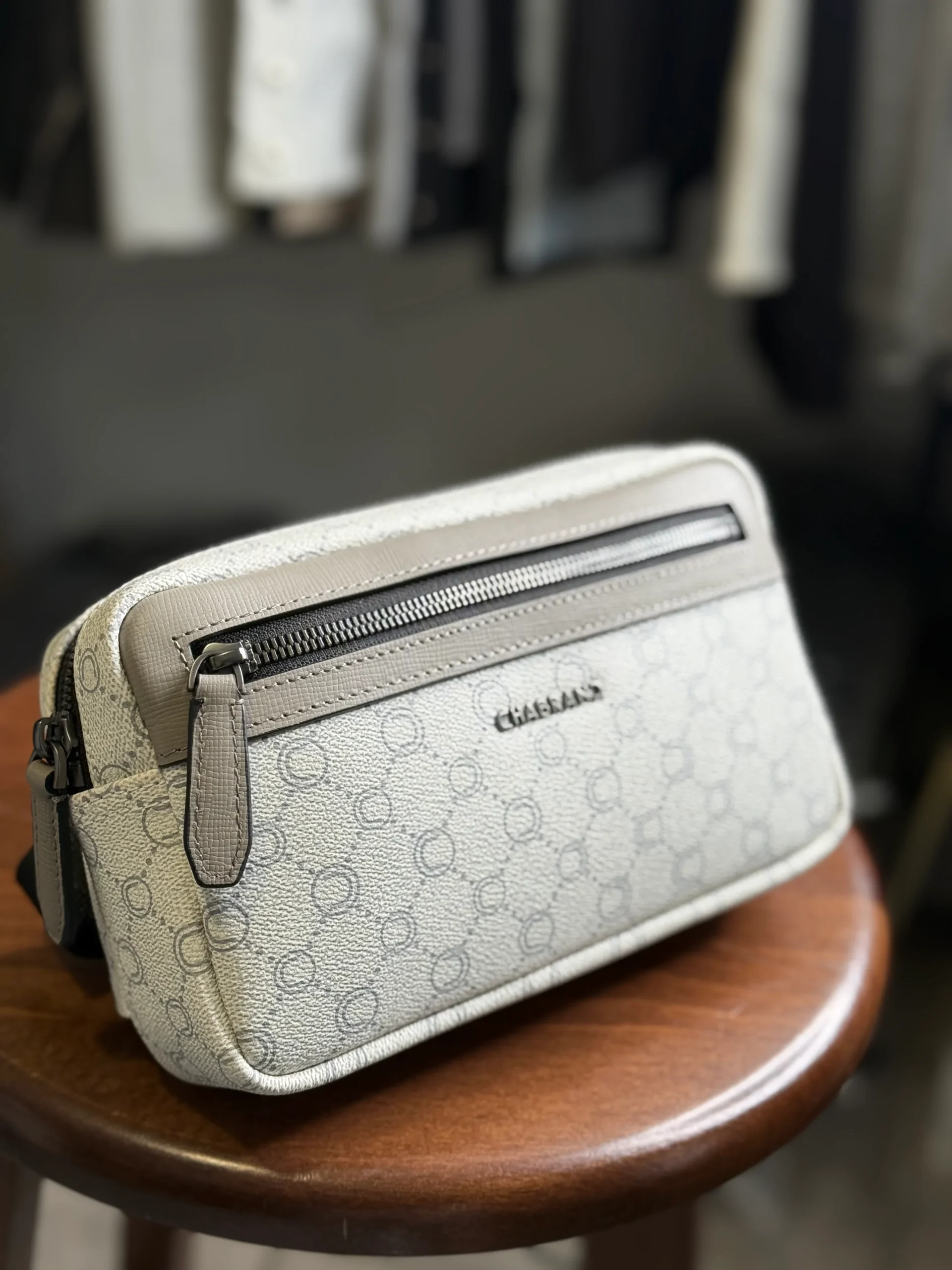 Banane Chabrand de couleur blanche avec motifs « C » de couleur gris de matière cuir synthétique Notre boutique est à Lyon Villeurbanne LES CINQ FRÈRES.