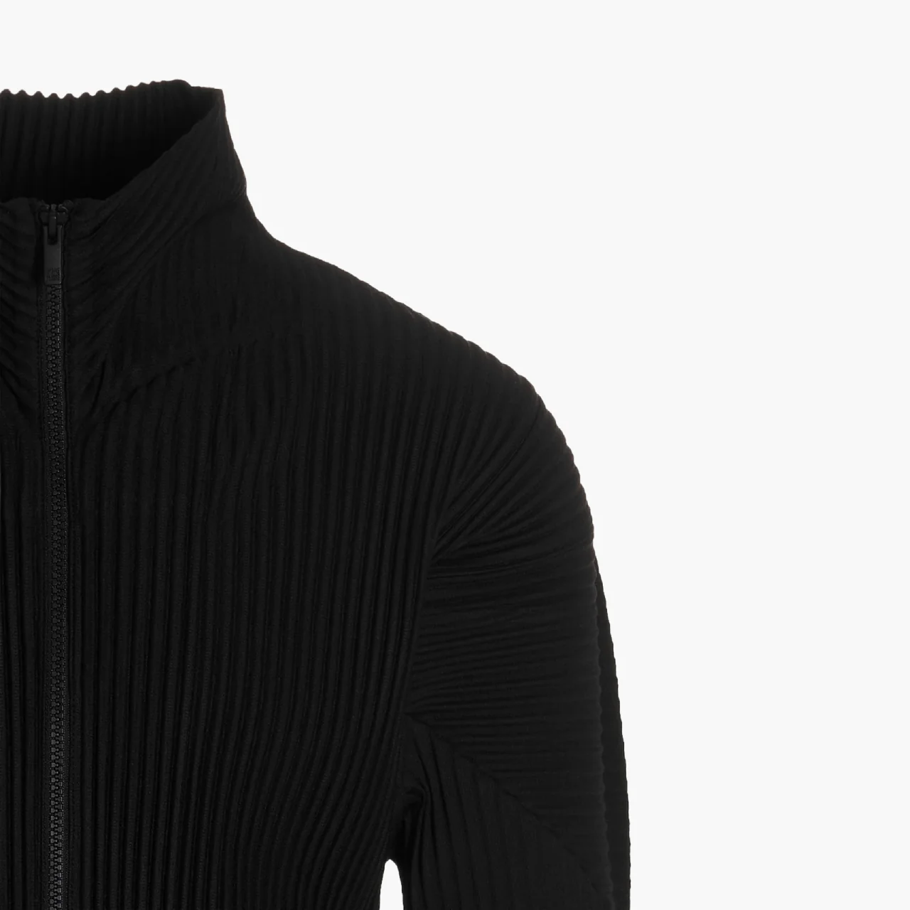 - Cardigan zippé à col montant en tissu plissé technique.