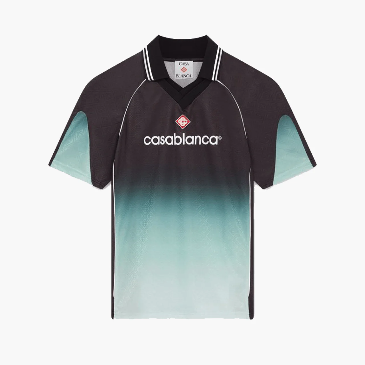 Le Football Shirt Gradient Monogram Jacquard de Casablanca mêle heritage sport-foot et haute couture urbaine, avec un tissu jacquard monogramme en dégradé et une coupe “football” revisitée.