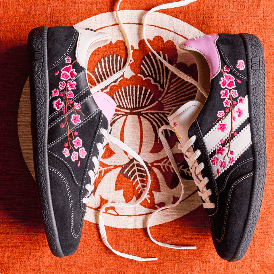Avec ses broderies fines inspirées des fleurs de cerisier, la Pulse Sakura rend hommage à la douceur éphémère du printemps japonais. Elle est sublimée par un jeu de contrastes entre le noir profond du suède, les double-bandes graphiques et la douceur du rose pastel. 💕