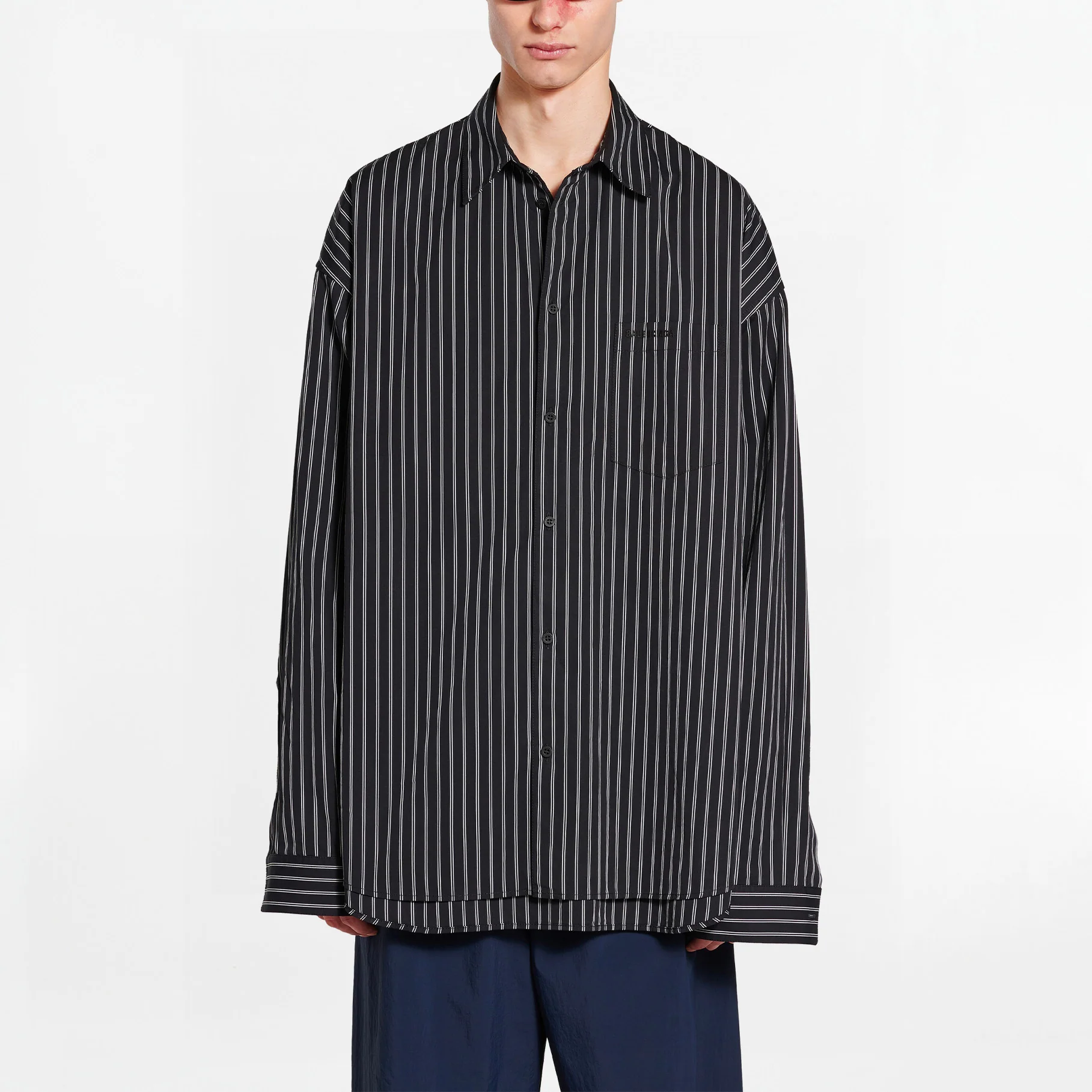 La chemise Flatground de Balenciaga incarne l’audace stylistique de la maison, alliant tradition et innovation. Confectionnée en popeline de coton italienne de qualité supérieure, elle présente des rayures verticales contrastantes noir et blanc, une construction en trompe-l’œil et une coupe oversize déstructurée, offrant une silhouette contemporaine et distinctive.