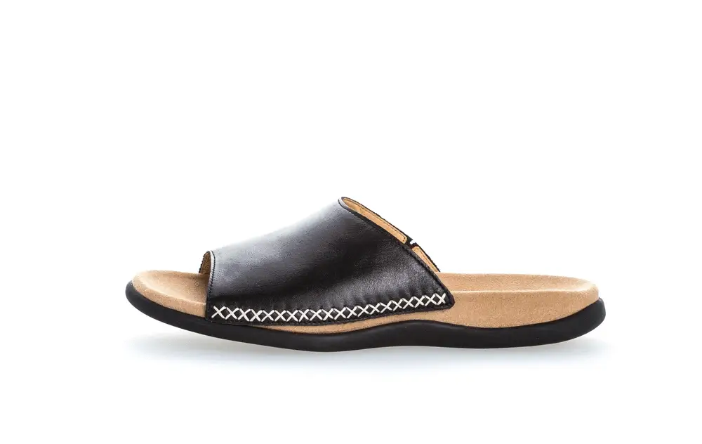 Mule en cuir noir de la marque GABOR. Doublure en cuir et première en microfibre. Semelle d’usure en Latex. Pour plus de liberté, les modèles Best Fitting sont conçus avec une largeur supplémentaire sur l’avant du pied. Pas d’inquiétude, au niveau de la cheville, vous retrouverez toutefois la largeur F, correspondant à une taille normale. Votre pied est parfaitement maintenu et ne glisse pas vers l’avant.