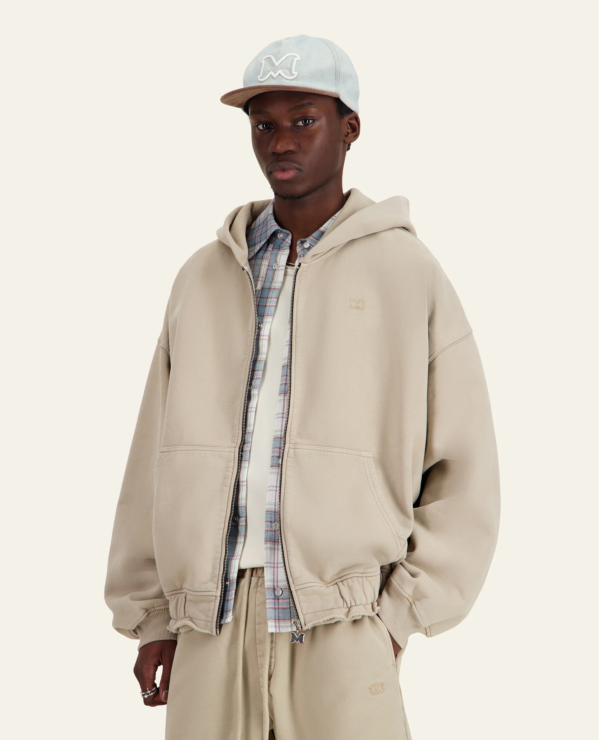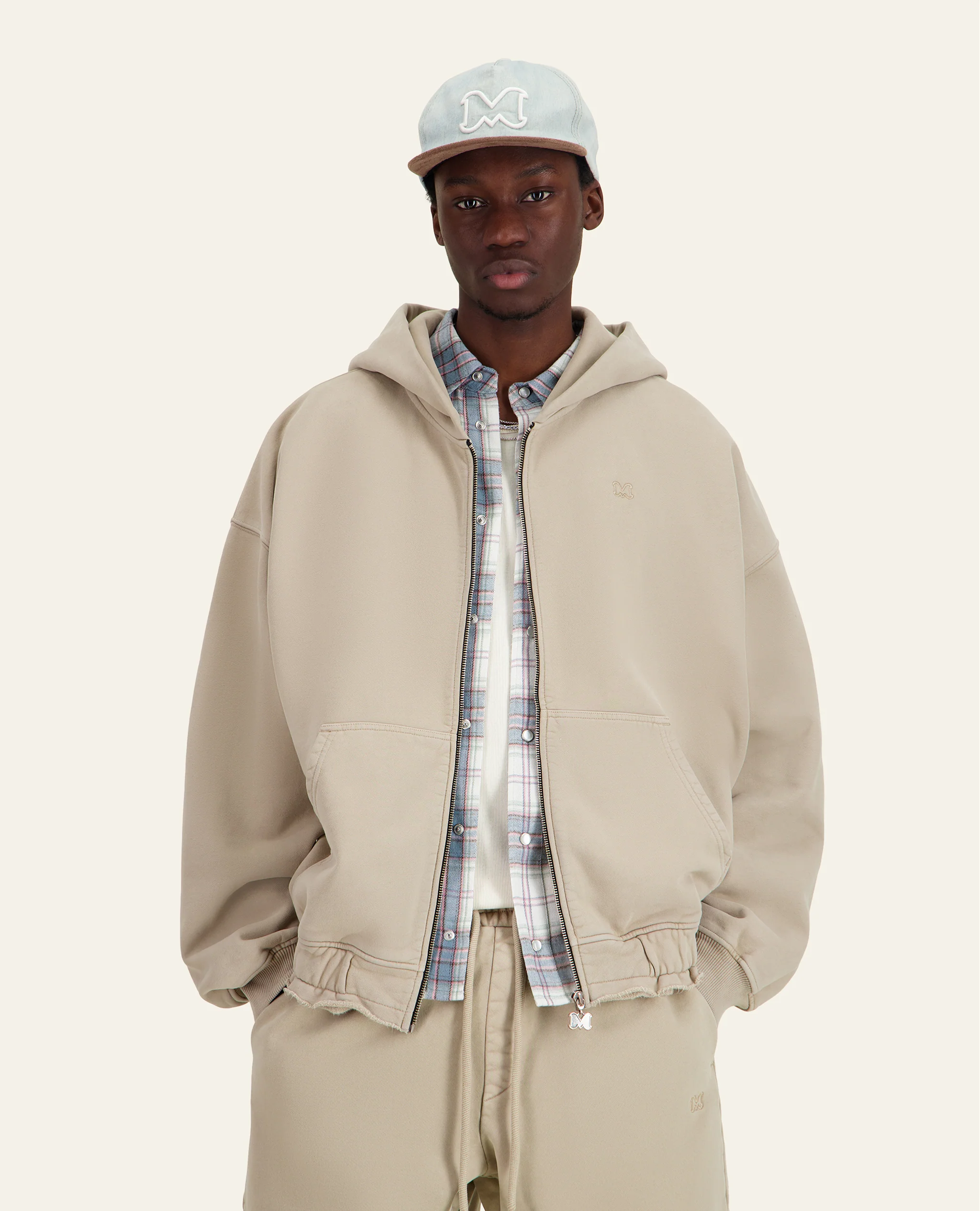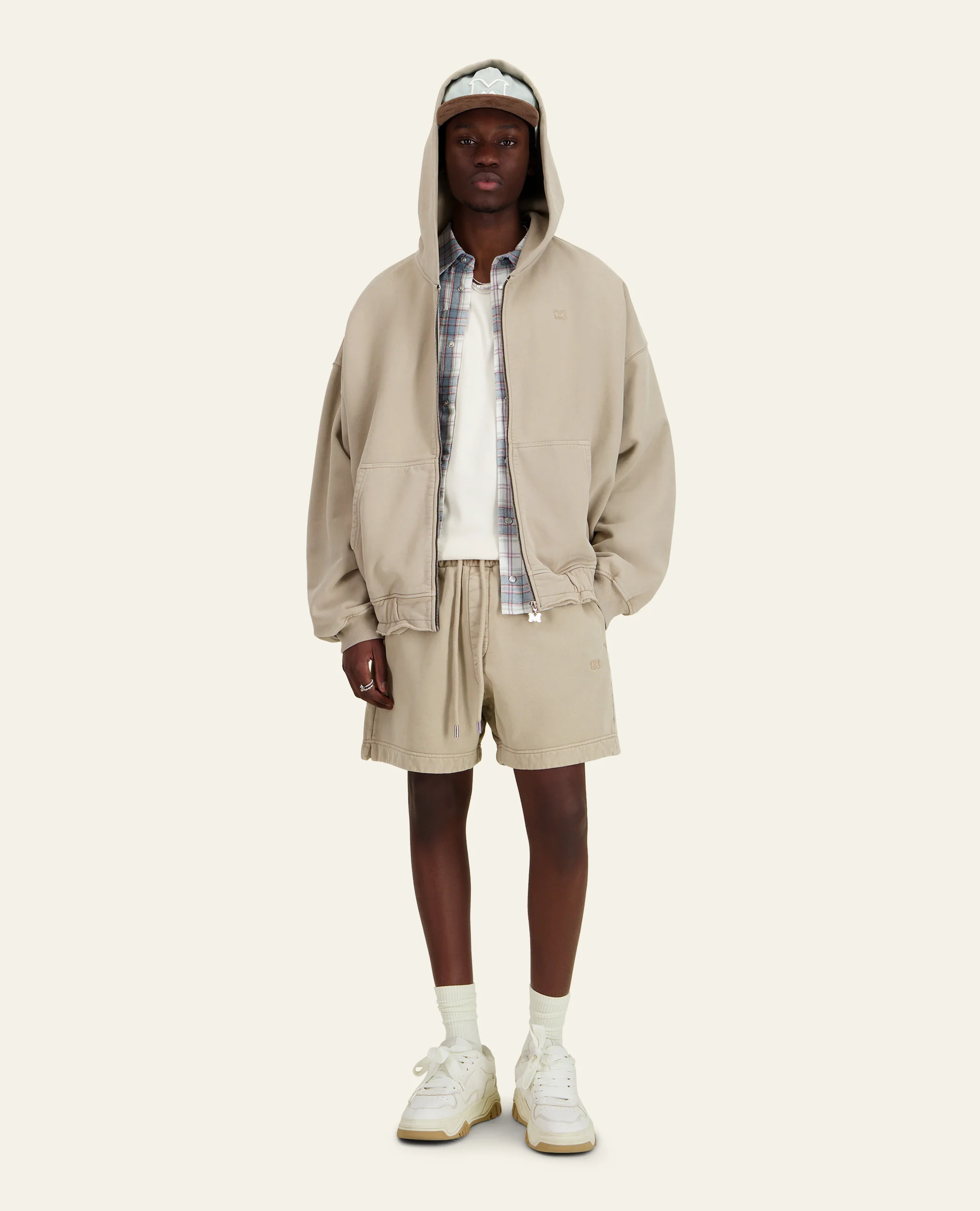 Sweat à capuche zippé en molleton délavé– Coupe boxy oversize– Détail de ceinture bord franc– Fermeture éclair avec tirette logo en métal argenté– Bord-côte au bas des manches– Molleton teint en pièce et délavé pour un effet vintage– Poche kangourou– Logo Mouty brodé ton sur ton sur la poitrine Composition : 100% cotonFabriqué au Portugal […]